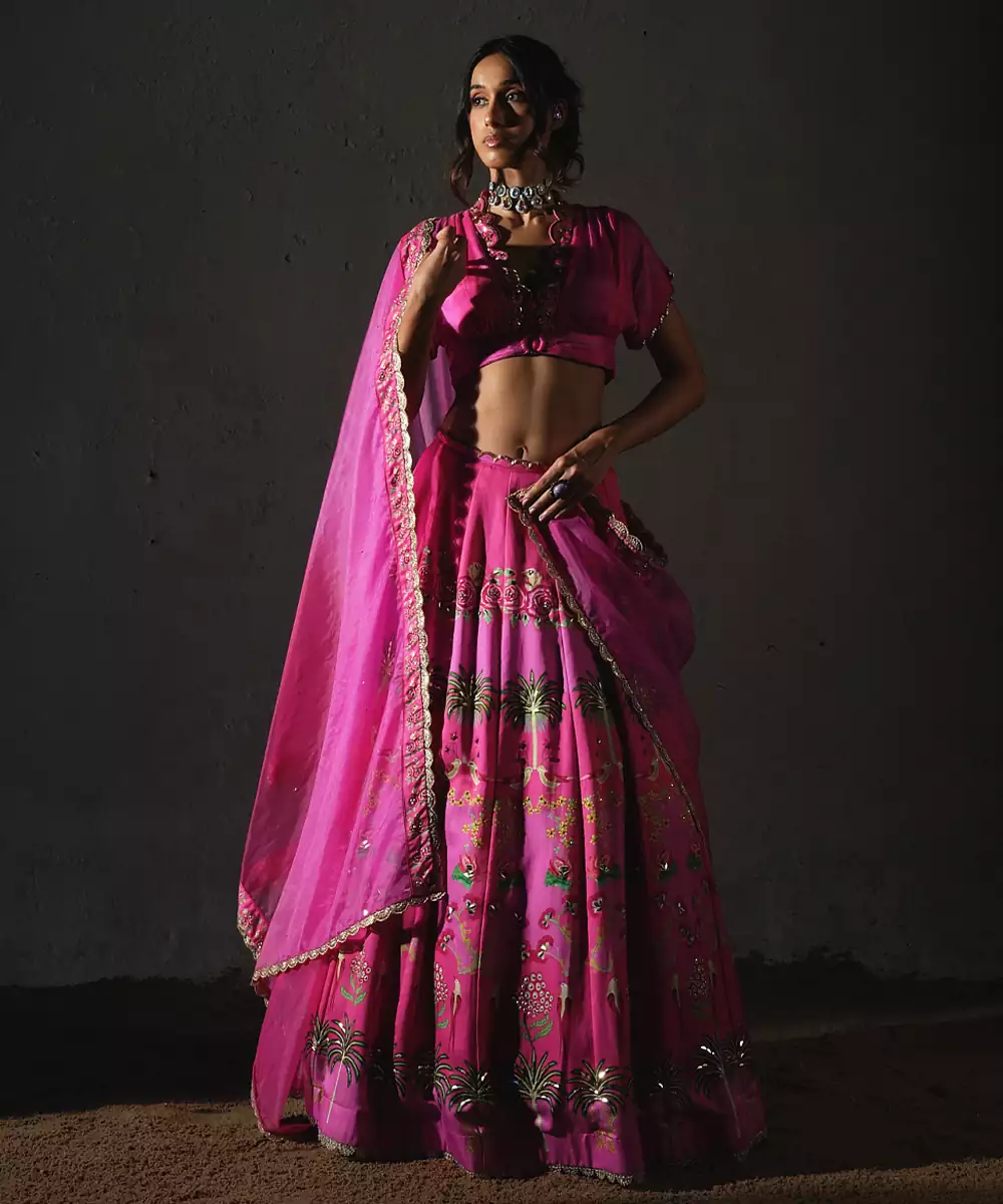 This Pink Printed Chiffon Lehenga Set Radiates Breezy Elegance And Youthful Charm. Crafted From Lightweight Chiffon Fabric, It Features Vibrant Prints That Add A Fresh, Stylish Touch. Perfect For Festive Occasions And Celebrations, It Offers A Flowing Silhouette, Comfortable Fit, And Timeless Ethnic Appeal.