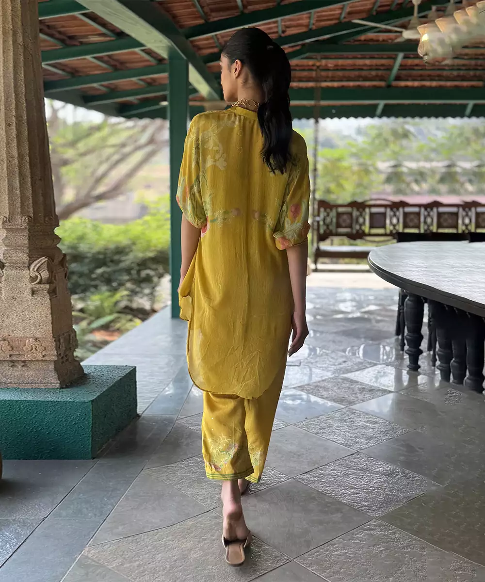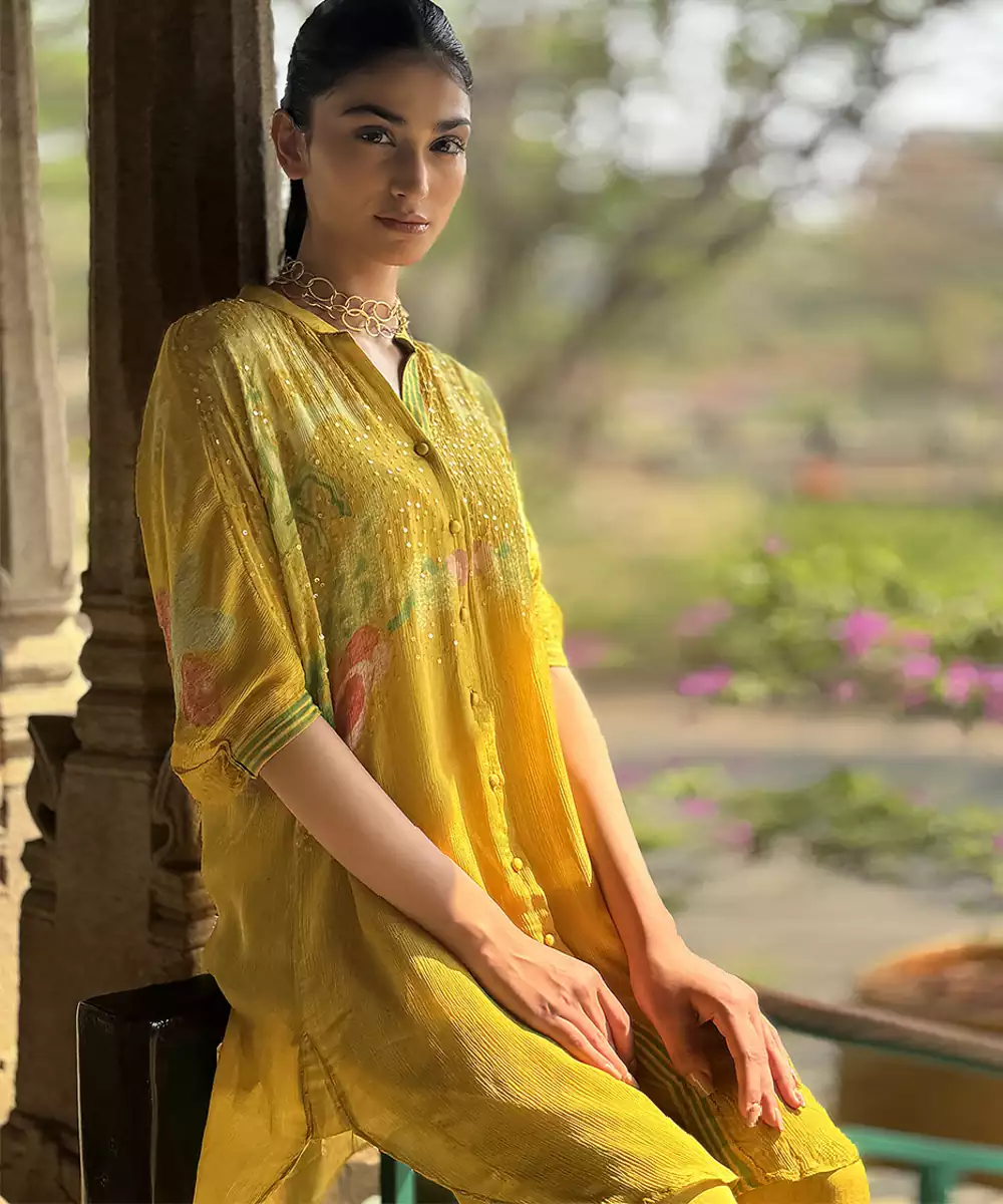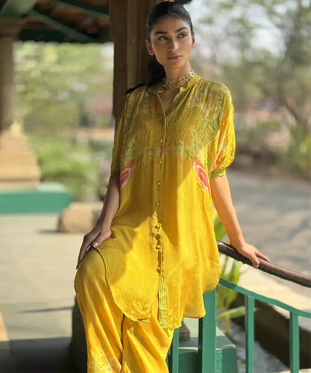 This Yellow Printed Chiffon Co Ord Set Radiates Fresh Elegance And Contemporary Charm. Crafted From Lightweight Chiffon Fabric, It Features Vibrant Prints That Add A Lively, Stylish Touch. Perfect For Festive Occasions And Casual Gatherings, It Offers A Comfortable Fit, Graceful Drape, And Timeless Ethnic Appeal.