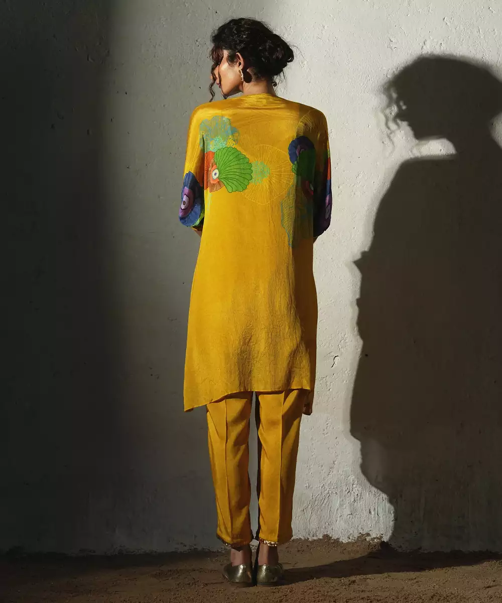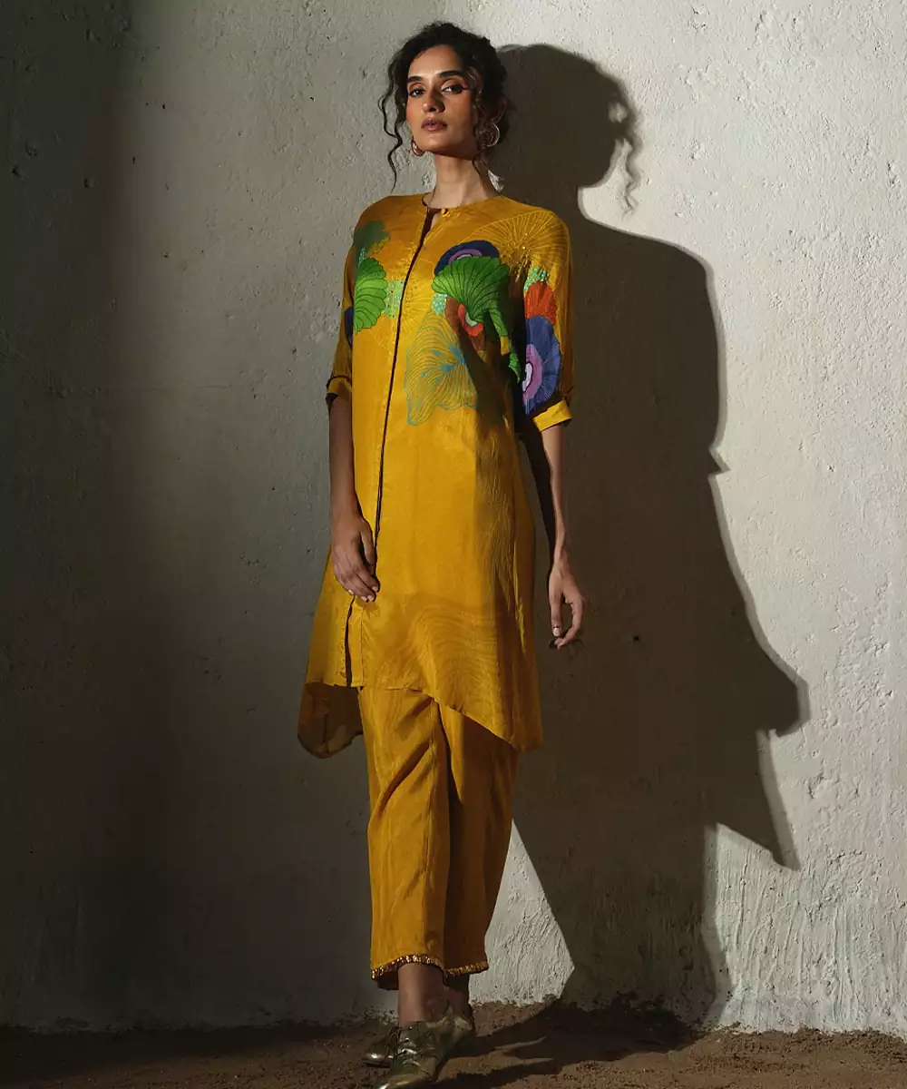 This Yellow Printed Chiffon Kurta Set Showcases Breezy Elegance And Cheerful Charm. Crafted From Lightweight Chiffon Fabric, It Features Vibrant Prints That Add A Fresh, Lively Touch. Perfect For Daytime Festivities And Casual Celebrations, It Offers A Graceful Drape, Airy Comfort, And Effortless Ethnic Style.