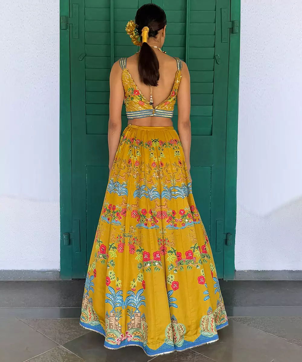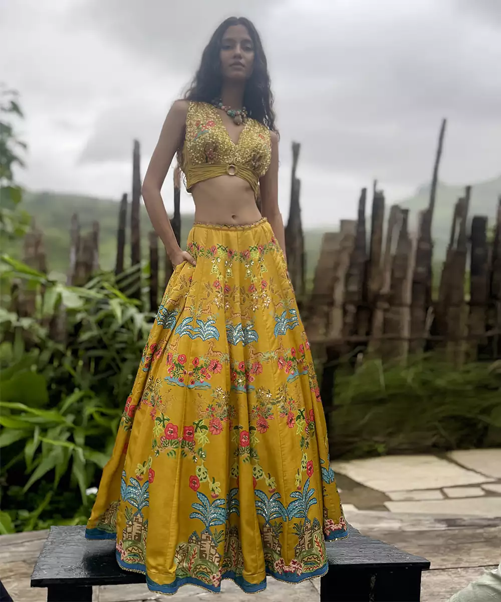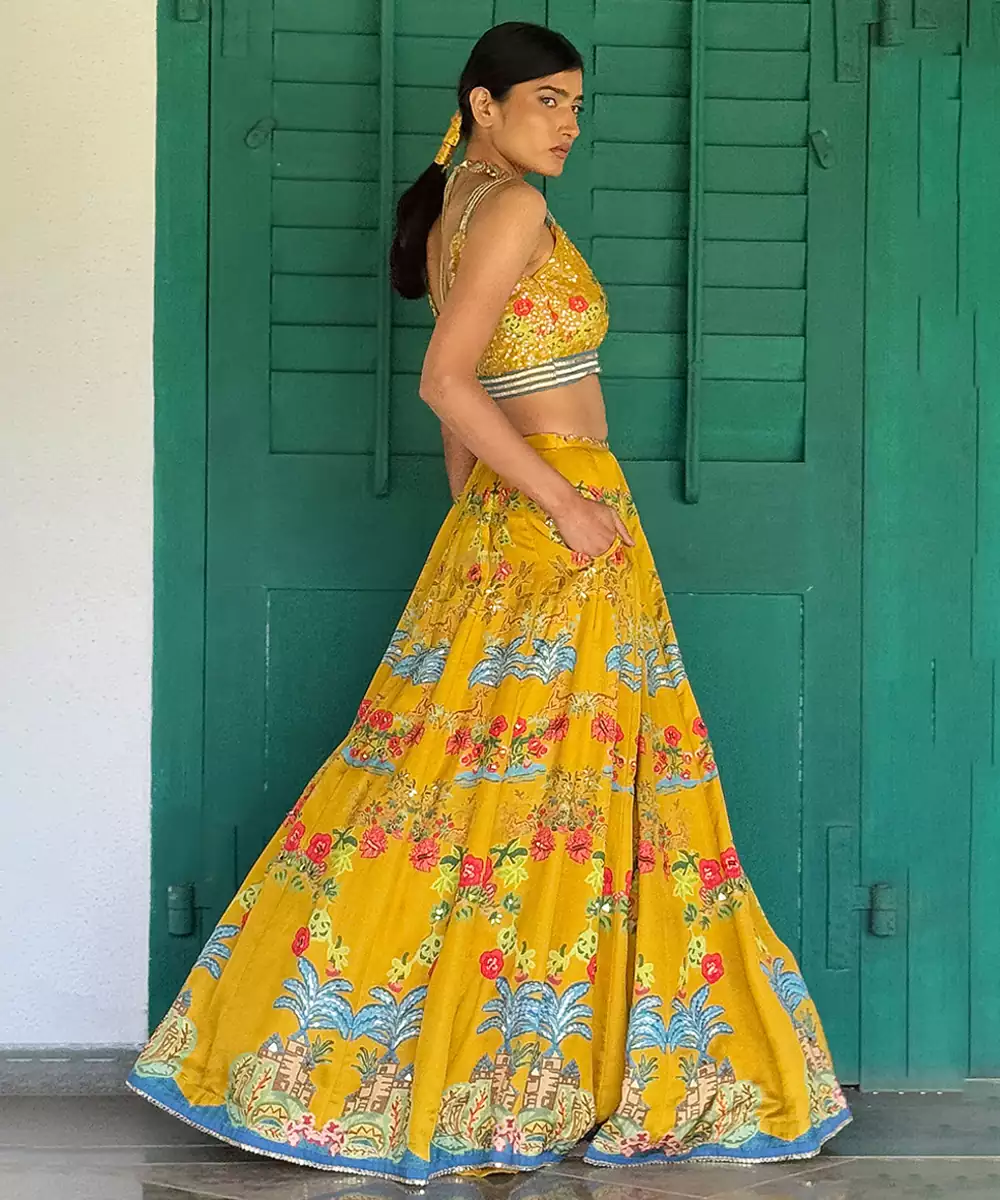 This Yellow Printed Linen Lehenga Set Reflects Fresh Elegance And Effortless Festive Charm. Crafted From Breathable Linen Fabric, It Features Vibrant Prints That Add A Lively, Stylish Touch. Perfect For Daytime Celebrations And Special Occasions, It Offers A Comfortable Fit, Graceful Silhouette, And Timeless Ethnic Appeal.