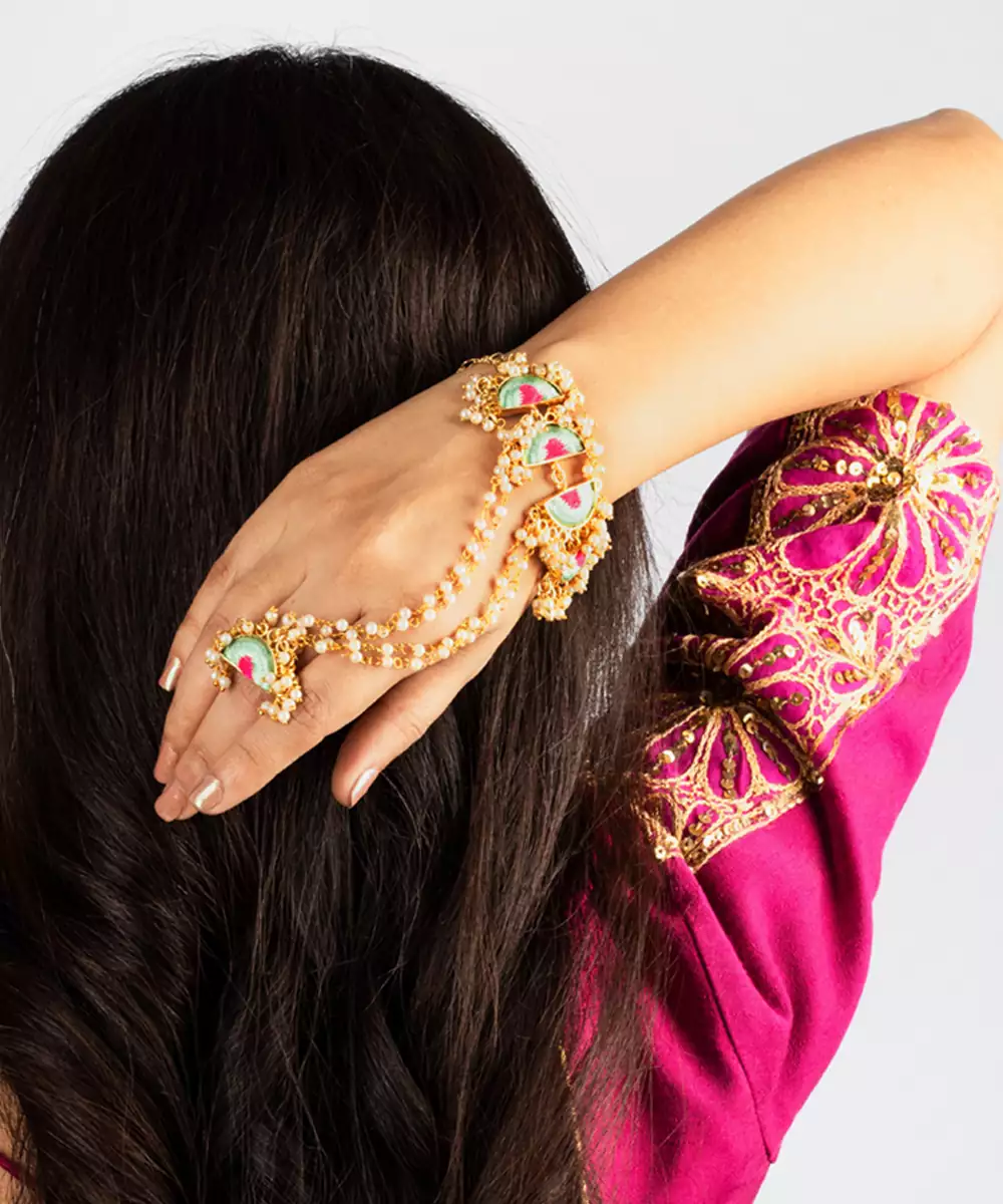 The Mint Wave Haathphool Is All About Understated Beauty. Embroidered In Mint Blue And Fuschia Pink Silk Threads, Studded In A 22 Ct Gold Plated Frame, And Embellished With A Bunch Of Pearls, This Haathphool Are Lightweight And Stylish, Making It Ideal For Celebration Day. This Handcrafted Haathphool Cature The Essence Of Indian Ceremonies Making Them An Exquisite Choice For Haldi, Mehendi, Roka, Sangeet, Pooja, Festivals And Marriages.