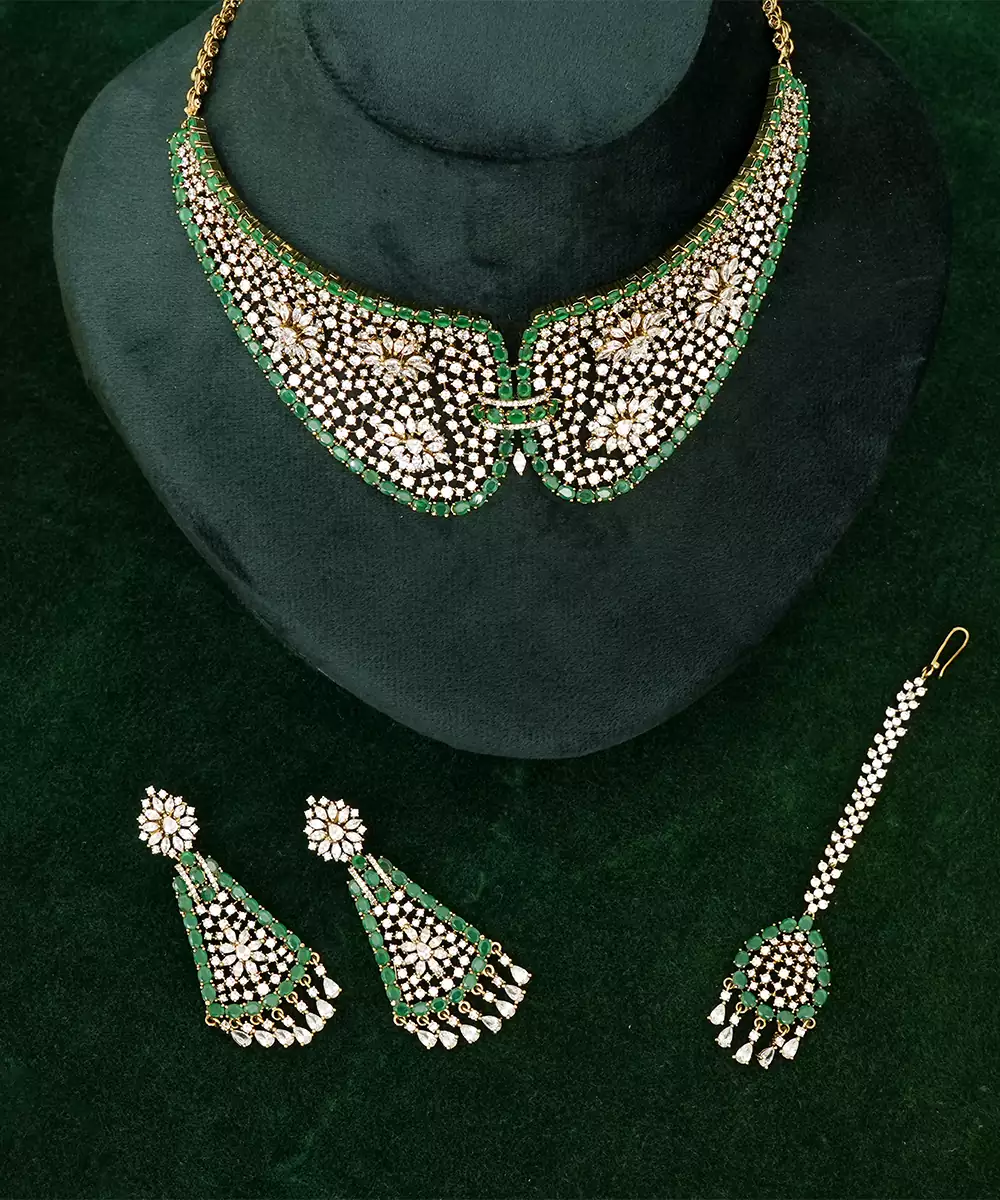 Emarald Green Stones Necklace Set Is A Regal And Elegant Accessory That Beautifully Showcases Traditional Craftsmanship. Adorned With Intricate Kundan Work And Vibrant Green Stones, It Enhances Any Ethnic Or Festive Ensemble. Perfect For Weddings, Celebrations, And Special Occasions, This Necklace Set Adds A Touch Of Sophistication And Timeless Charm.