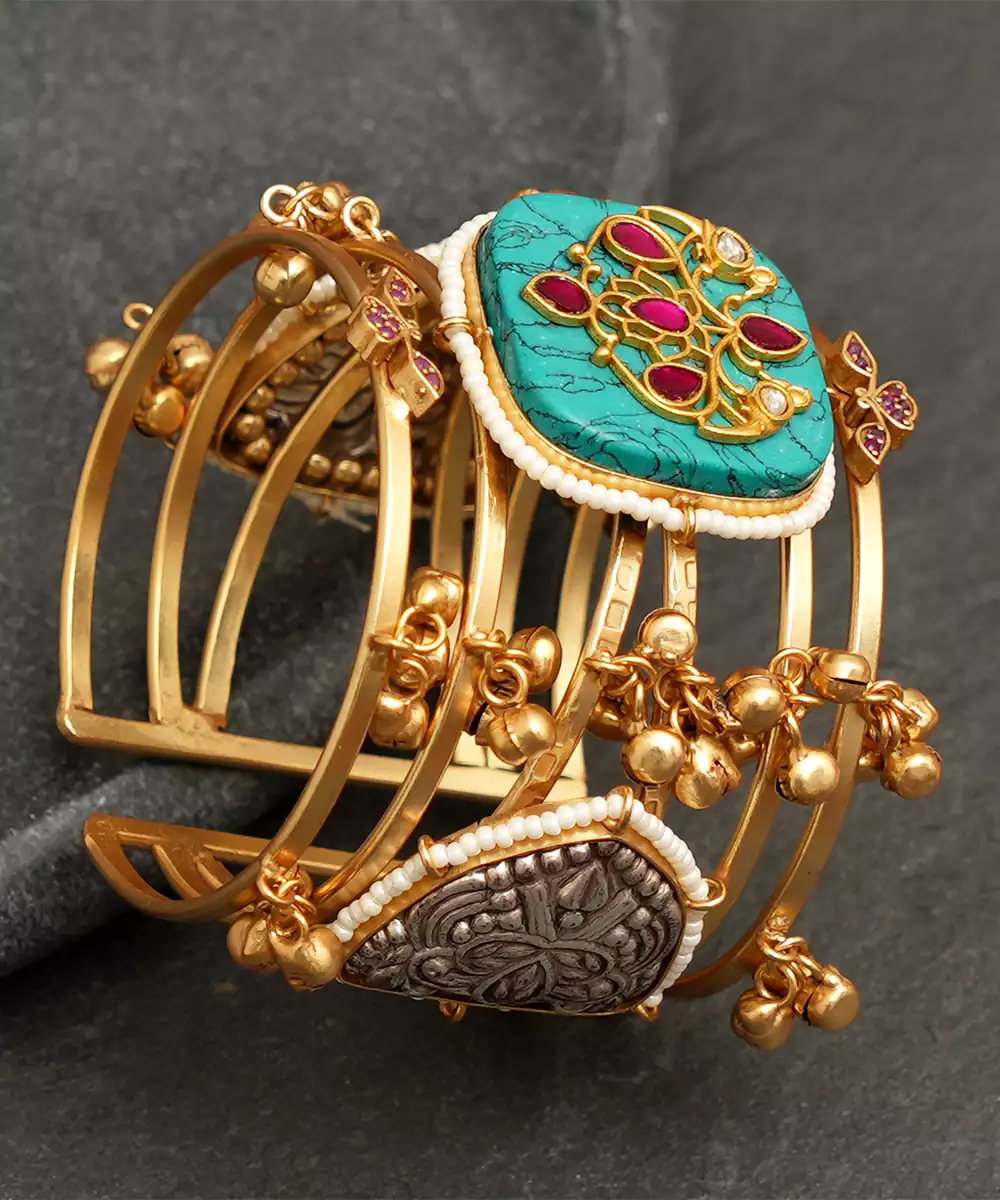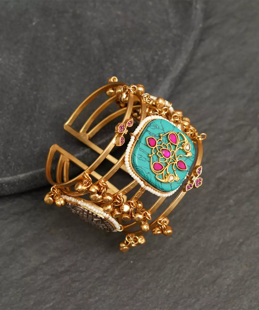 Gold Plated Blue Stones Bangle Is A Stunning Blend Of Traditional Elegance And Modern Charm. Crafted With Intricate Detailing And Highlighted With Rich Blue Stones, It Adds A Regal Touch To Any Ethnic Or Festive Look. Perfect For Weddings, Celebrations, And Special Occasions.