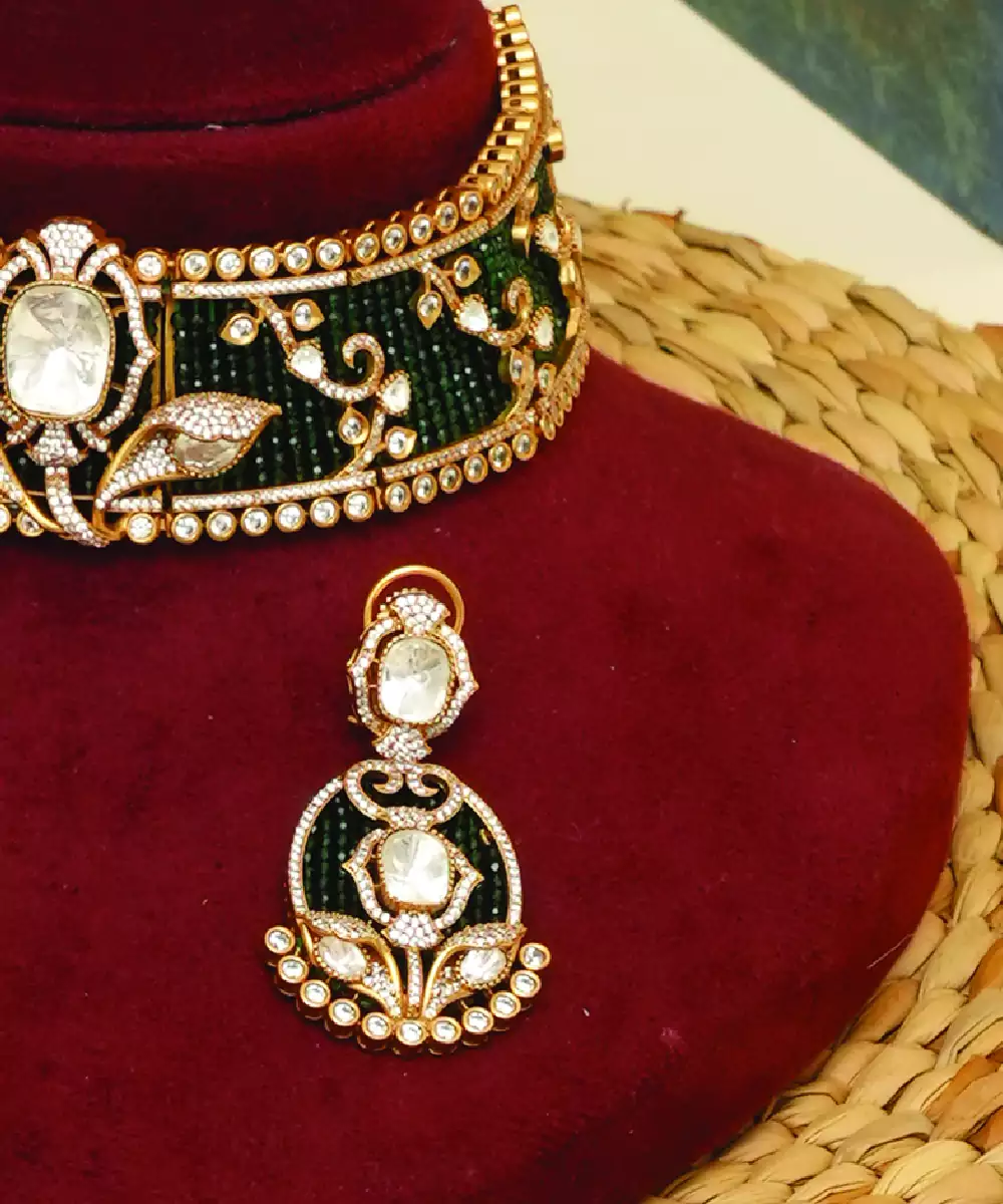 This Gold Plated Choker Necklace Set Features Rich Emerald Green Stones Set In An Intricate Design. The Luxurious Finish And Elegant Craftsmanship Make It Perfect For Weddings And Festive Occasions. It Sits Beautifully On The Neckline, Adding A Regal Charm And Elevating Your Traditional Look Effortlessly.