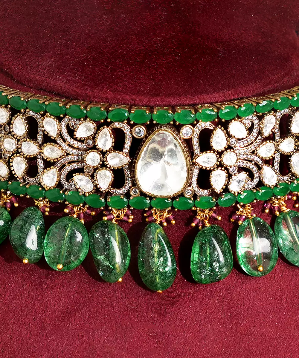Elevate Your Style With This Exquisite Green Designer Choker Set, Crafted To Perfection For Weddings, Parties, And Festive Occasions. Adorned With Premium Kundan Work, Sparkling Semi Precious Stones, And Delicate Pearl Drops, This Choker Set Is Designed To Add Royal Charm To Any Outfit. The Vibrant Green Stones Blend Beautifully With The Gold Plated Finish, Making It A Timeless Piece For Both Traditional And Modern Looks.