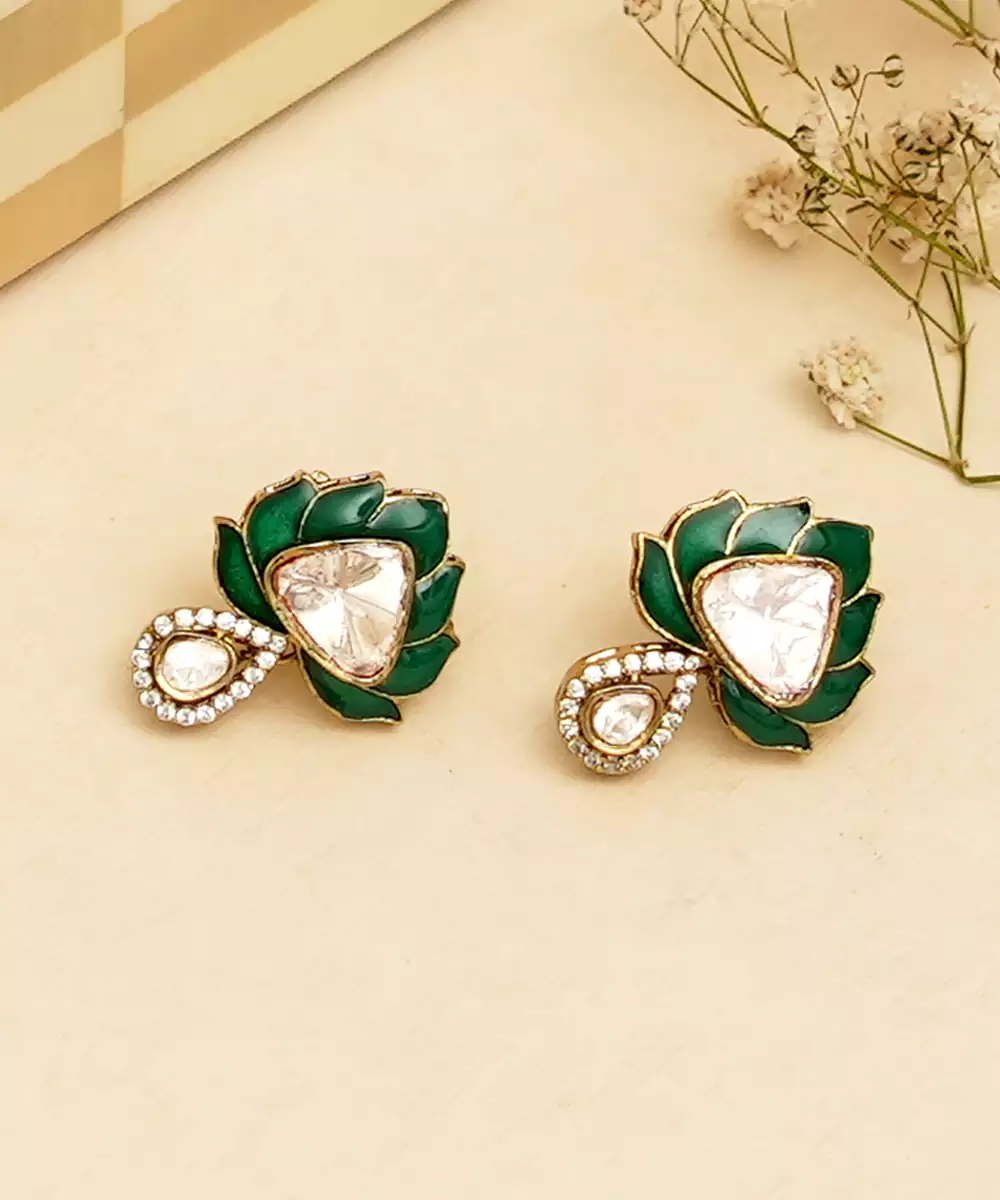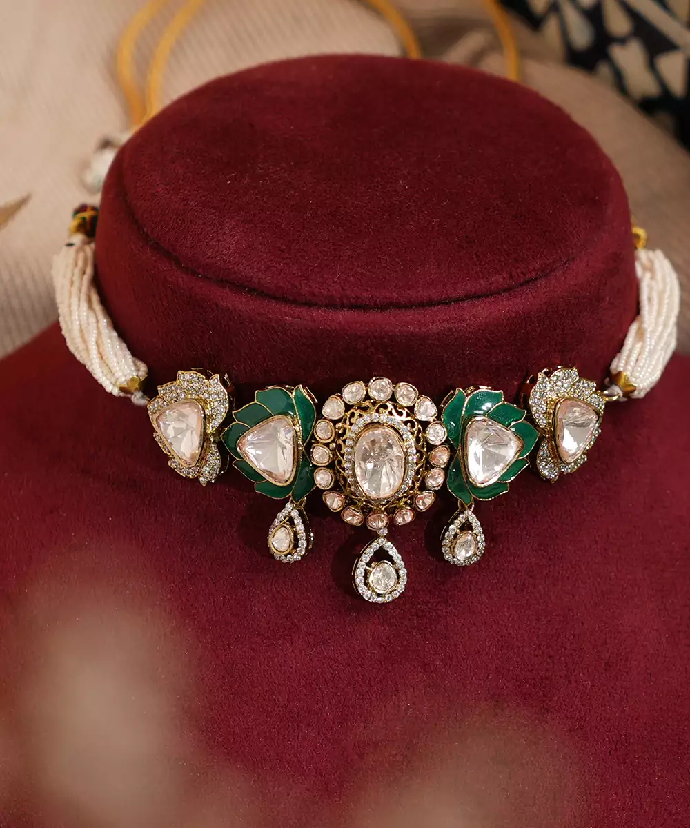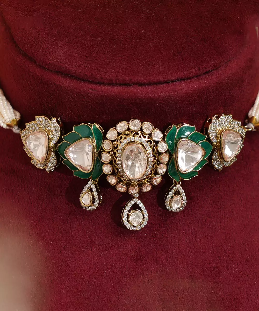 Stand Out With This Designer Jadau Choker Set In Emerald Green, Featuring A Striking Mossanite Studded Design That Radiates Elegance And Luxury. Handcrafted With Precision, This Choker Blends Heritage Jadau Artistry With Contemporary Style, Making It Perfect For Weddings, Festive Celebrations, And Special Occasions.