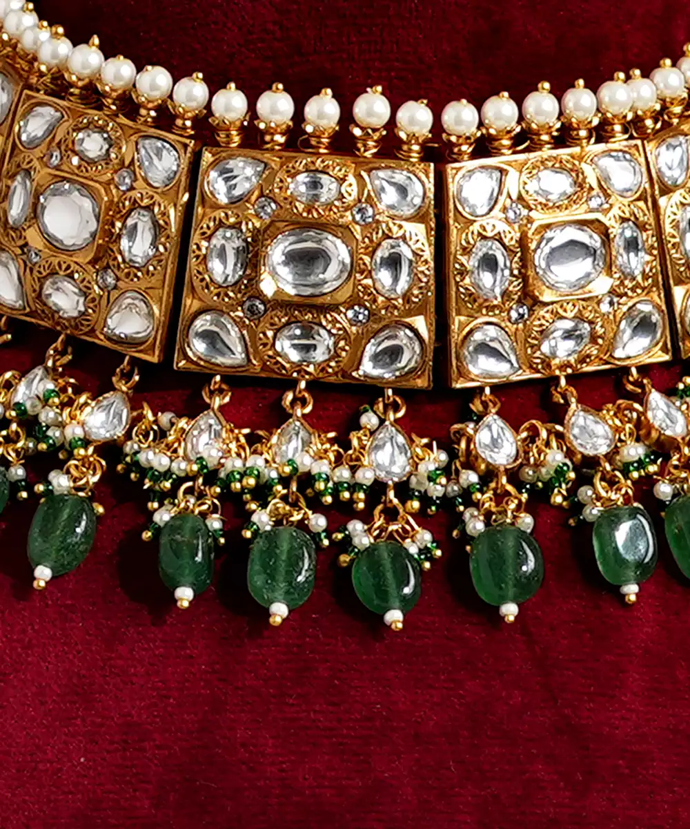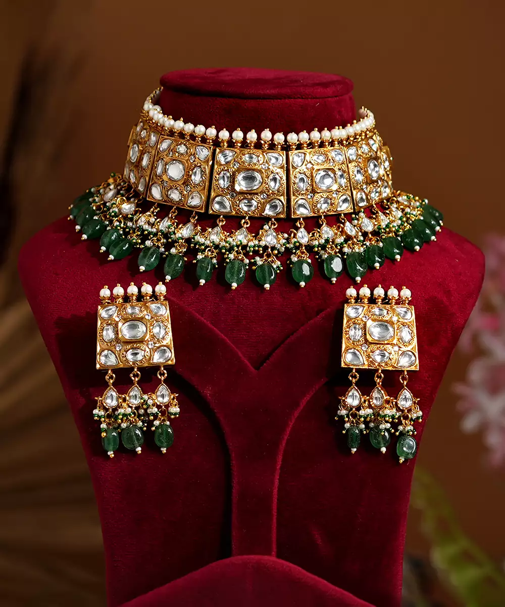 Embrace Royal Elegance With This Rajsi Designer Choker Set, Exquisitely Carved In Heritage Kundan And Adorned With Semi Precious Pearls. Inspired By Regal Artistry, This Choker Set Blends Timeless Tradition With Modern Sophistication, Making It A Statement Piece For Weddings And Festive Occasions.