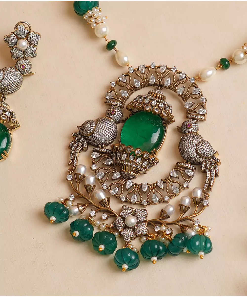 Add A Royal Touch To Your Jewellery Collection With This Long Necklace Set Featuring Exclusive Bird Earrings, Intricately Carved With Precision. Designed With Sparkling Aaa Ad Stones And Delicate Semi Precious Pearls, This Designer Set Brings Together Heritage Charm And Modern Luxury.