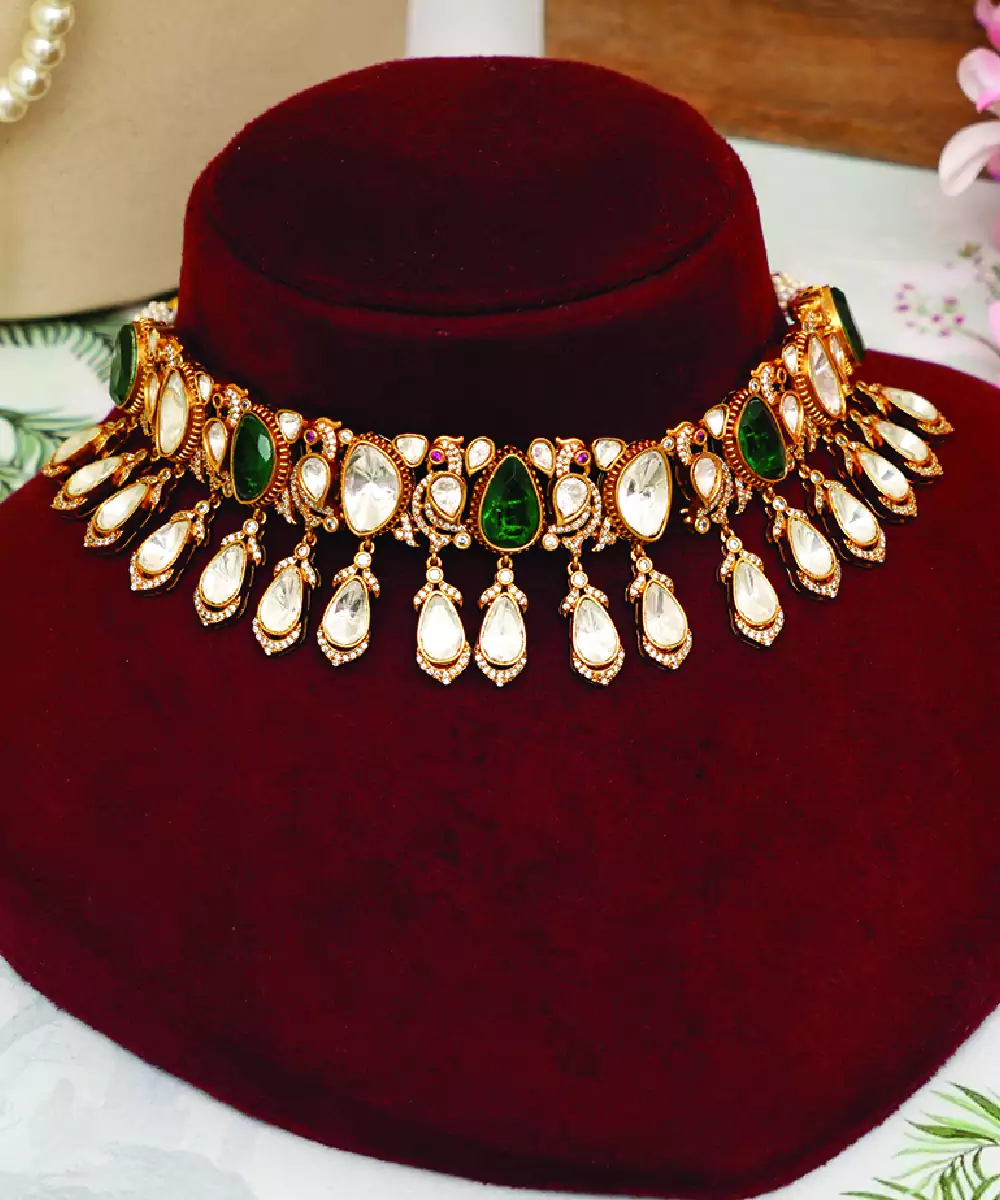 Elegant And Classic, This Gold Plated Kundan Choker Necklace Set Highlights Intricate Detailing With A Refined Finish. Designed For Versatility, It Complements Both Traditional And Contemporary Outfits. The Timeless Craftsmanship Ensures A Graceful Look, Making It A Perfect Choice For Festive Gatherings, Weddings, And Celebratory Occasions.