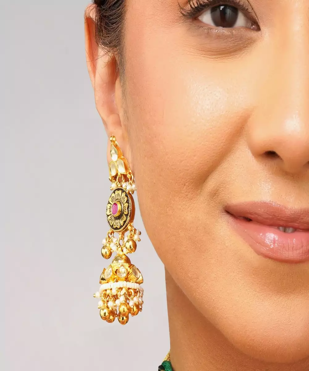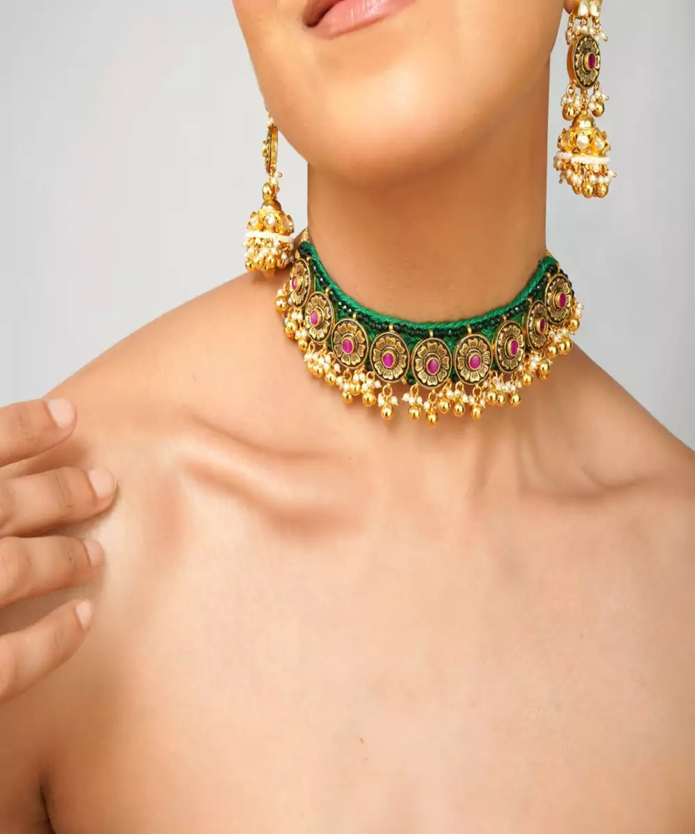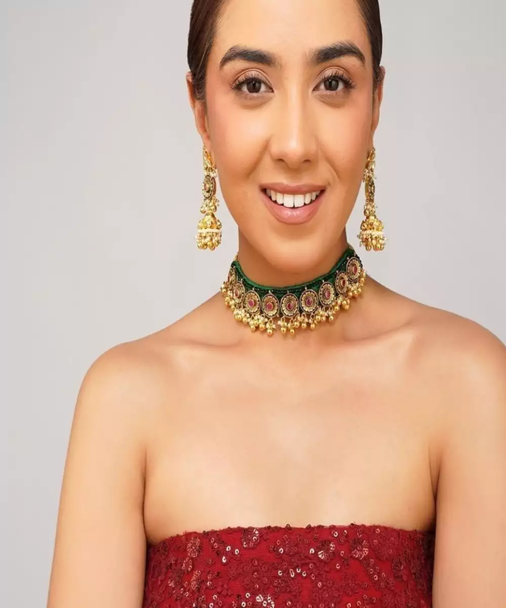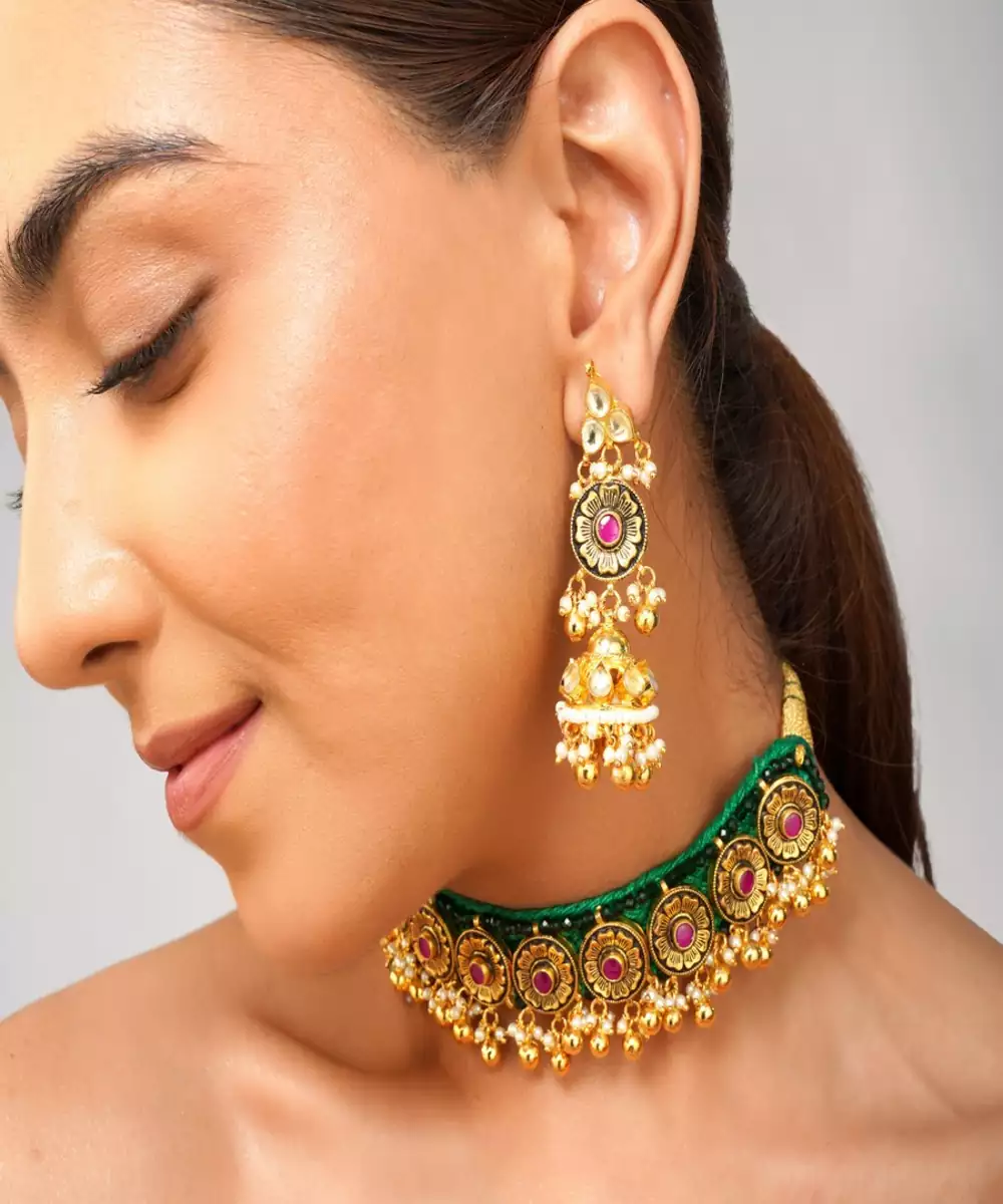 Make A Majestic Style Statement With This Exquisite Multi Color Kundan Choker Set, Adorned With Lustrous Emerald Green Pearls. Expertly Handcrafted To Reflect The Richness Of Real Gold Jewelry, This Choker Is Finished With Premium 22 K Gold Plating, Offering A Timeless Royal Look Ideal For Weddings, Festive Occasions, And Traditional Celebrations.