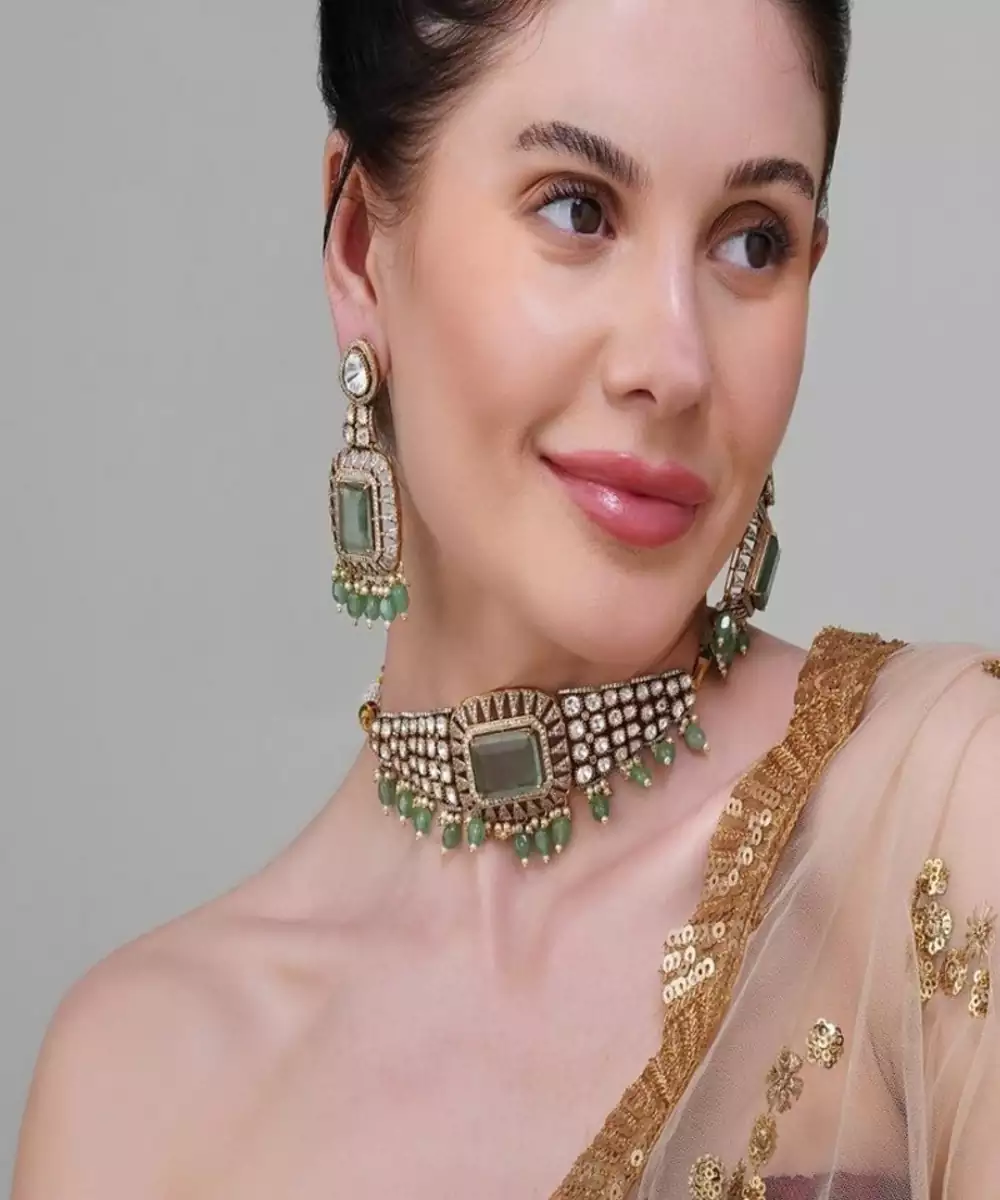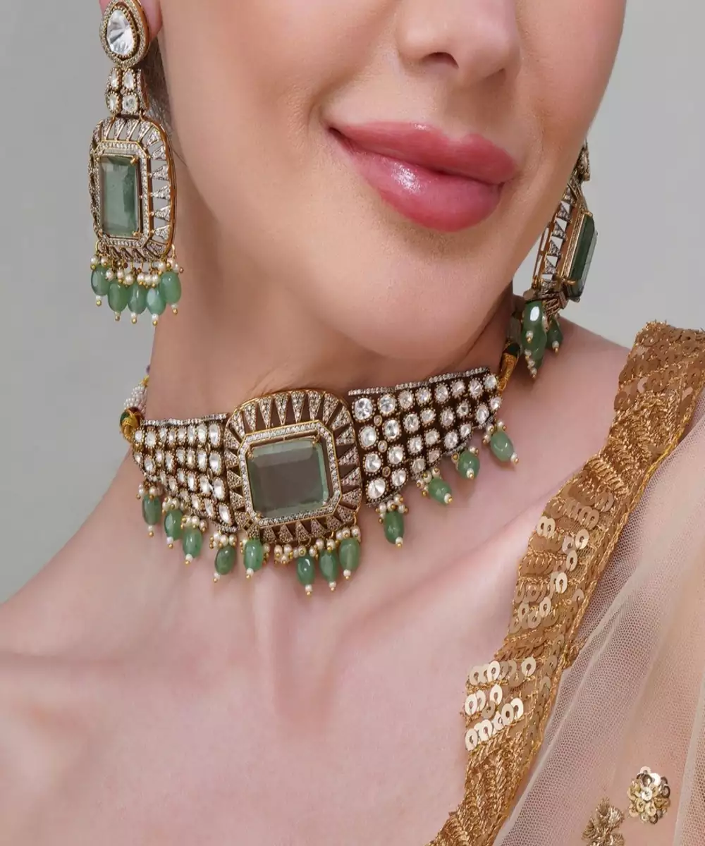 A Breath Of Fresh Air In The World Of Ethnic Glam. Designed For The Modern Muse Who Loves A Hint Of Tradition, This Trendsetting Piece Blends Classic Kundan Artistry With A Contemporary Mint Twist.The Choker Features Hand Set Uncut Stones In A Polished Gold Tone, Perfectly Paired With Soft Mint Green Beads That Add A Pop Of Cool Sophistication.