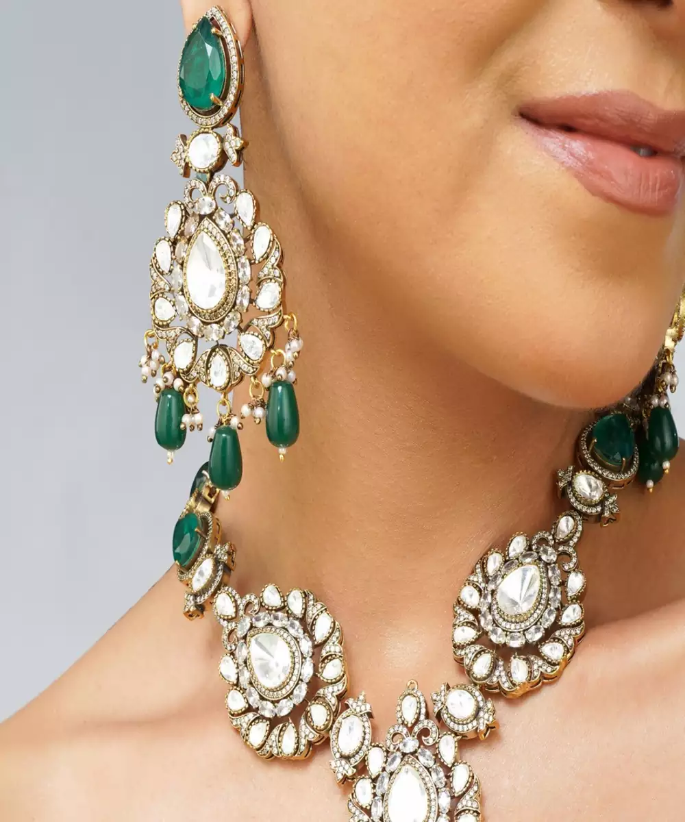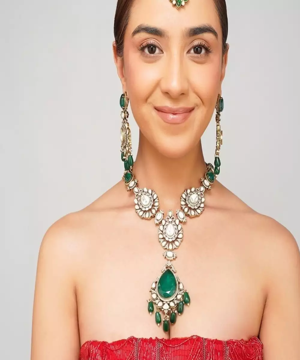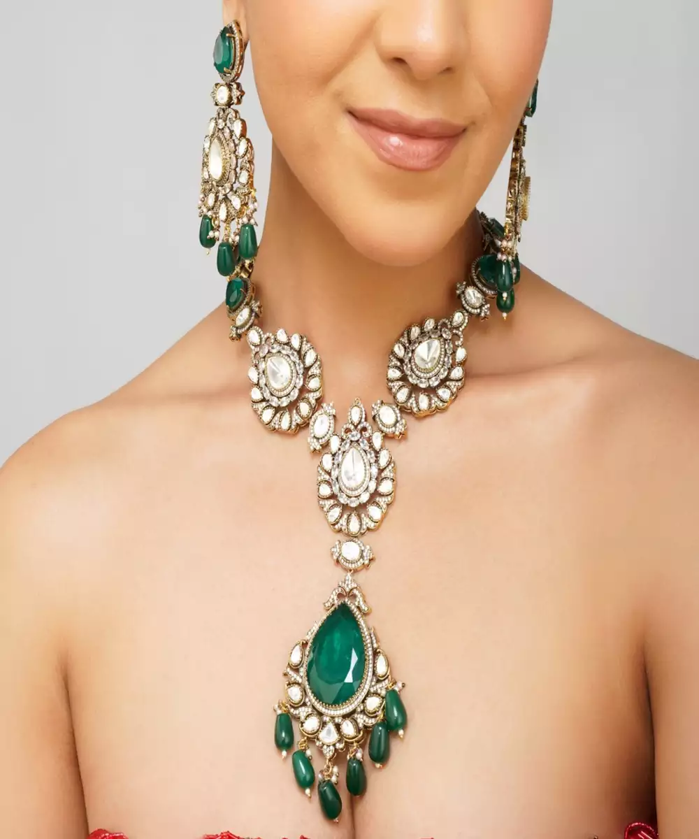 Elevate Your Traditional Style With This Majestic Kundan Designer Long Haar, Adorned With Trending Emerald Green Pearls And Intricate Kundan Craftsmanship. Handcrafted To Perfection, This Statement Piece Mimics The Richness Of Real Gold Jewelry, Finished With Luxurious 22 K Gold Plating For A Royal And Timeless Appeal.