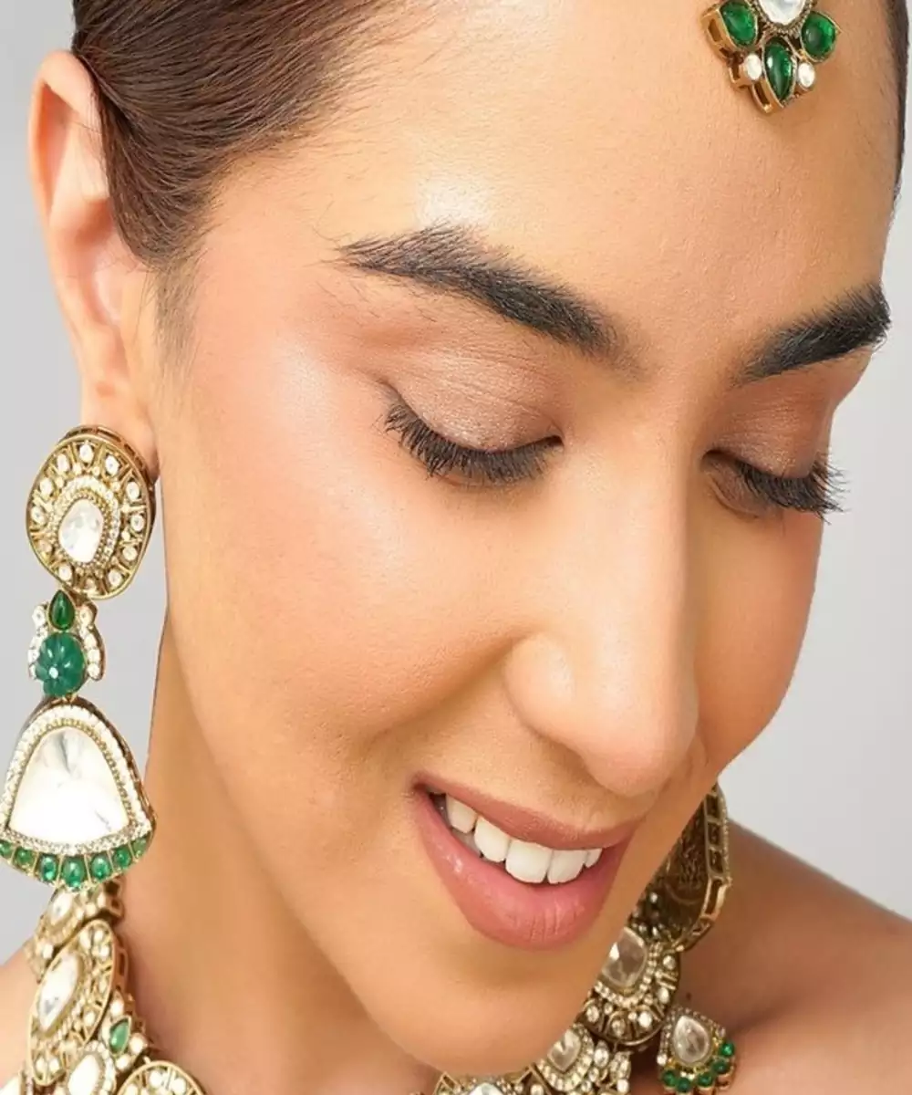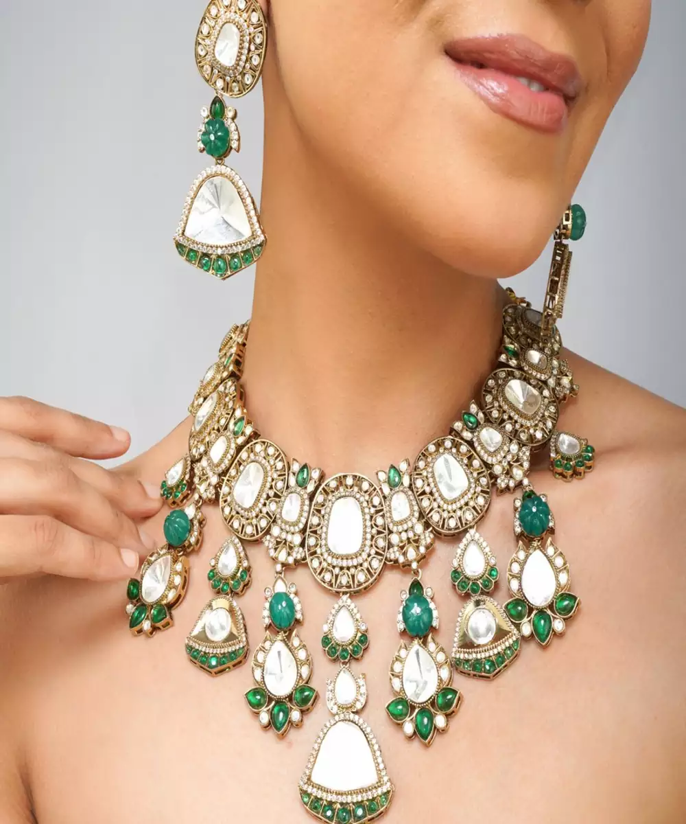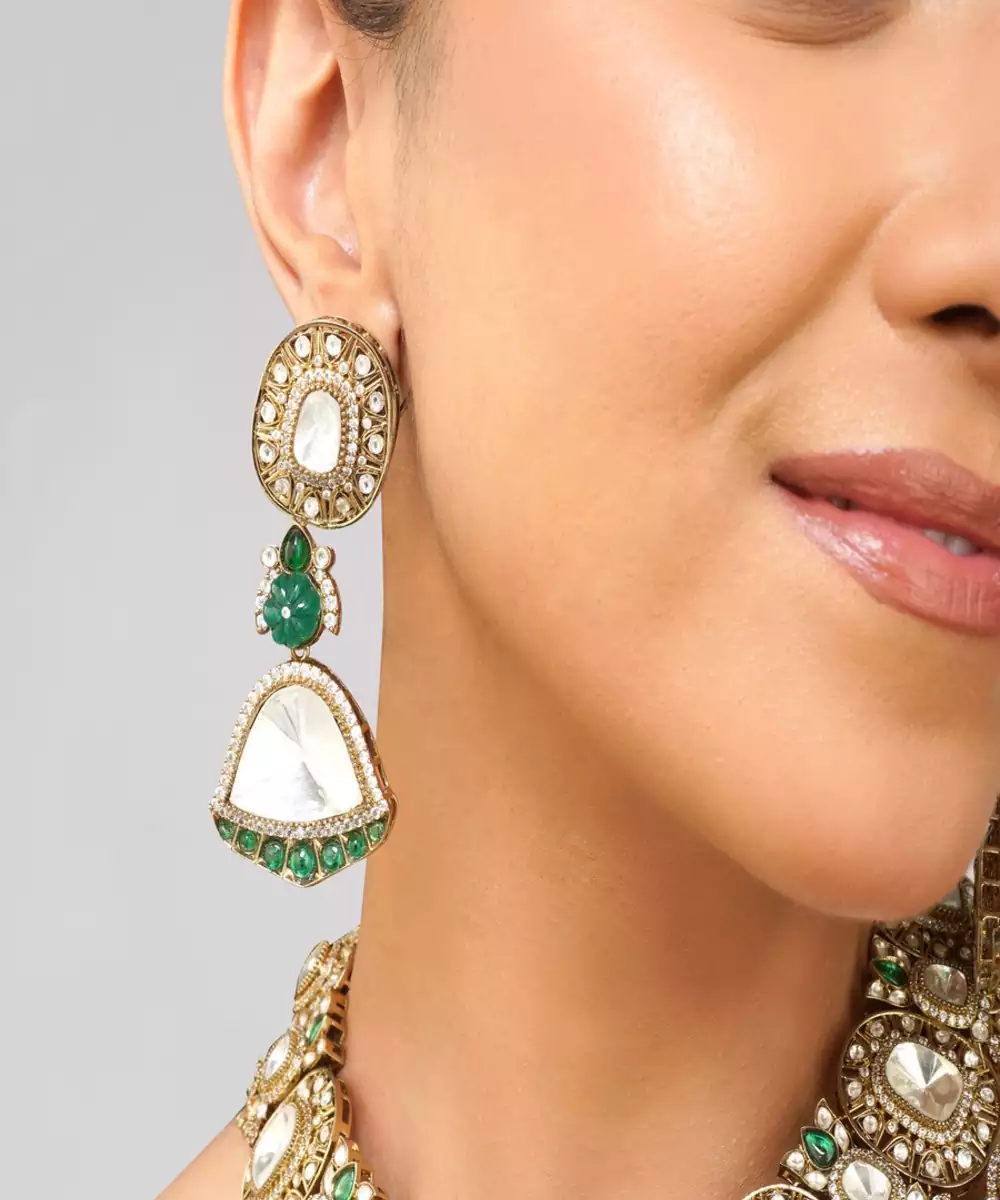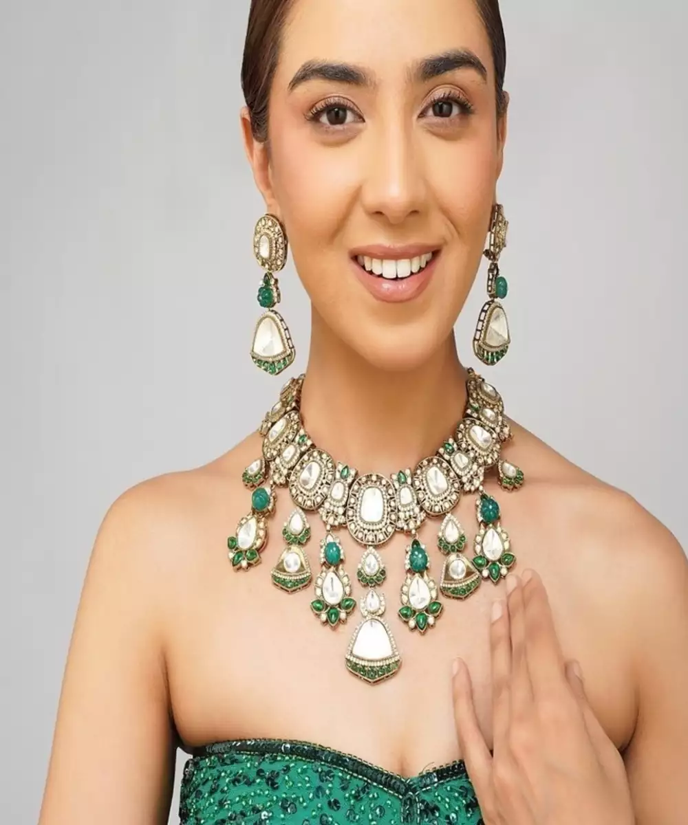 Radiate Elegance With This Natural Color Kundan Necklace Set, Adorned With Rich Emerald Green Pearls And Intricately Handcrafted To Mimic Real Gold Jewelry. Inspired By Royal Indian Aesthetics, This Statement Set Features A Timeless Design Finished In High Quality 22 K Gold Plating, Perfect For Weddings, Festive Events, And Grand Celebrations.
