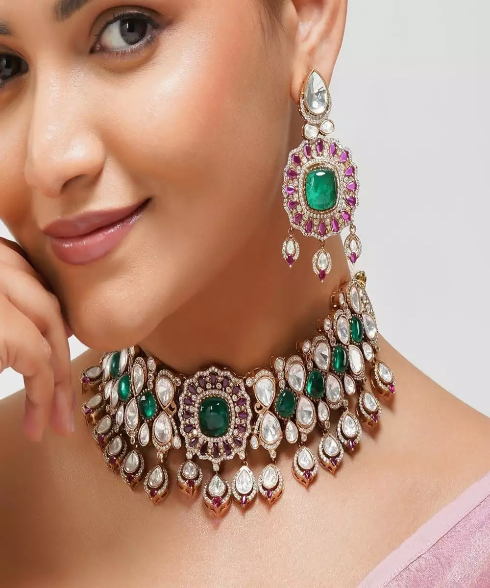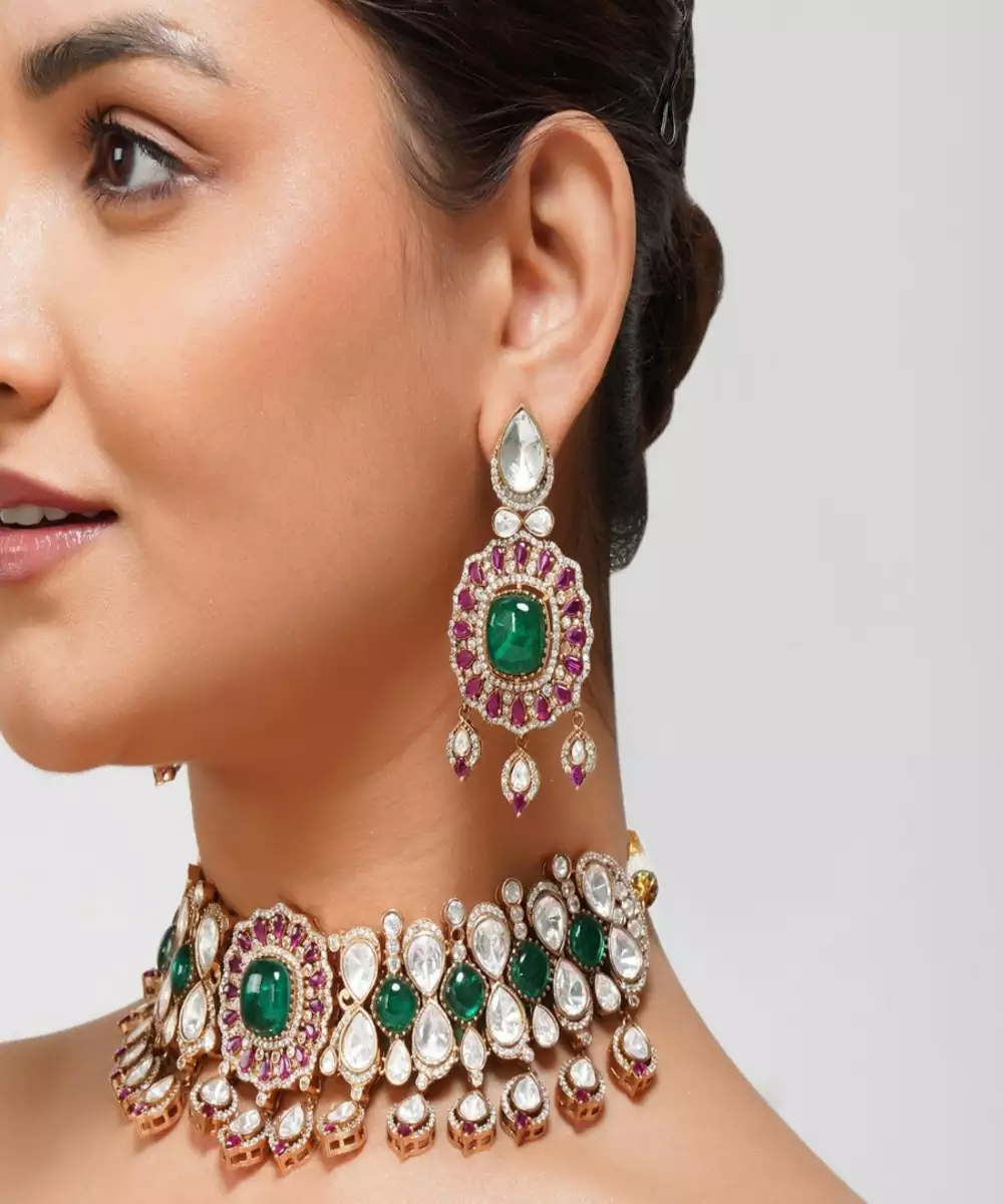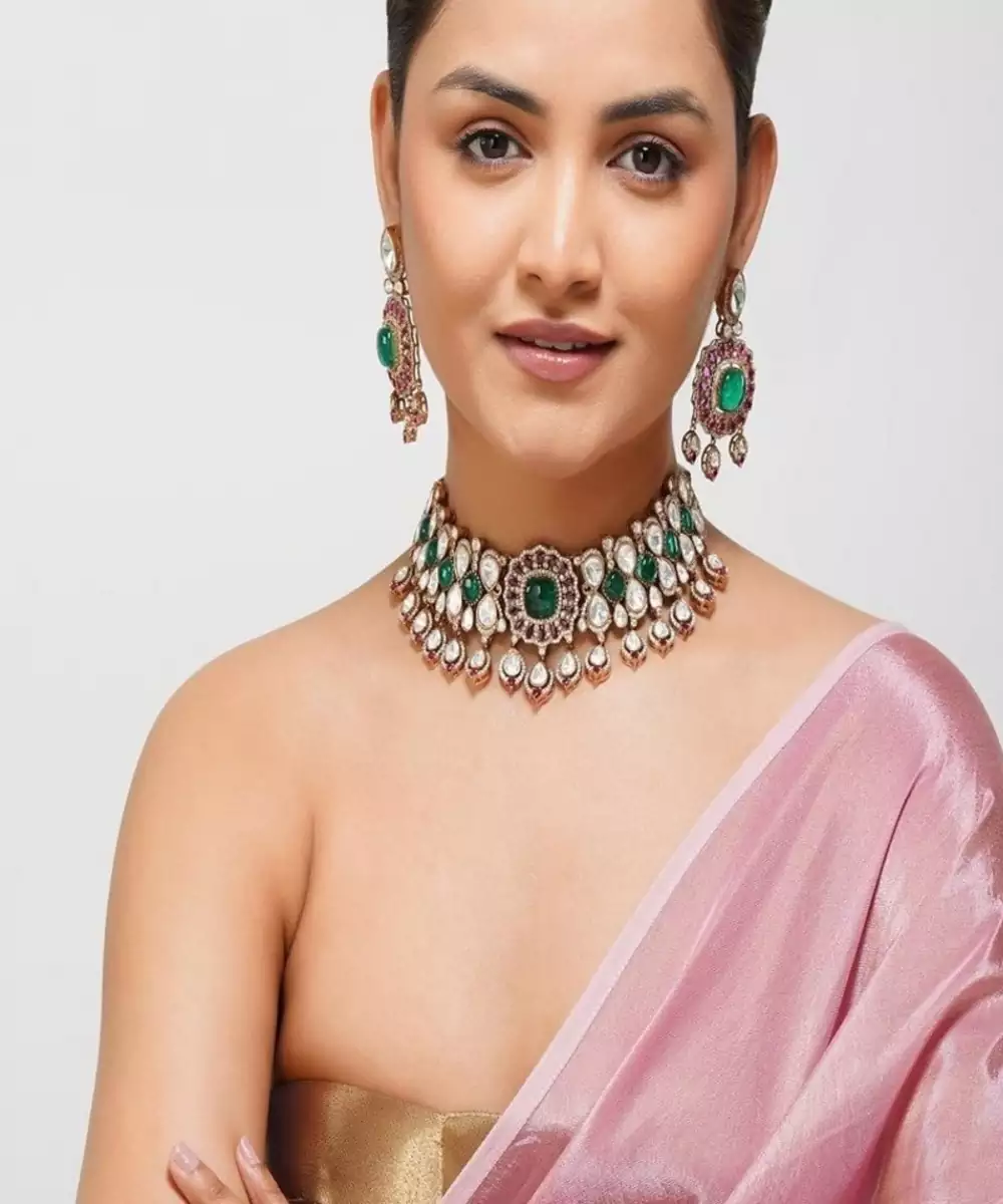 Unveiling A Masterpiece Of Craftsmanship, Our Designer Kundan Choker Is A Blend Of Heritage Artistry And Contemporary Finesse. Adorned With Lustrous Kundan Stones In Soothing Pestle Hues, Vibrant Ruby Red, And Refreshing Mint Green, This Choker Exudes Sophistication With Every Detail.