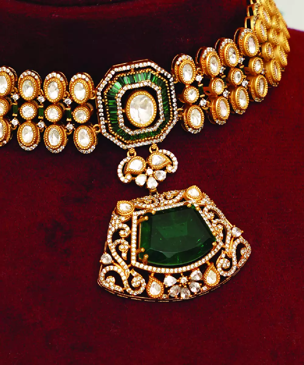 This Gold Plated Kundan Choker Necklace Set Features Vibrant Green Stones Intricately Set In A Traditional Design. Crafted To Enhance Festive And Bridal Looks, It Offers A Rich, Regal Appeal. The Elegant Choker Sits Beautifully On The Neckline, Making It A Statement Accessory For Special Occasions And Celebrations.
