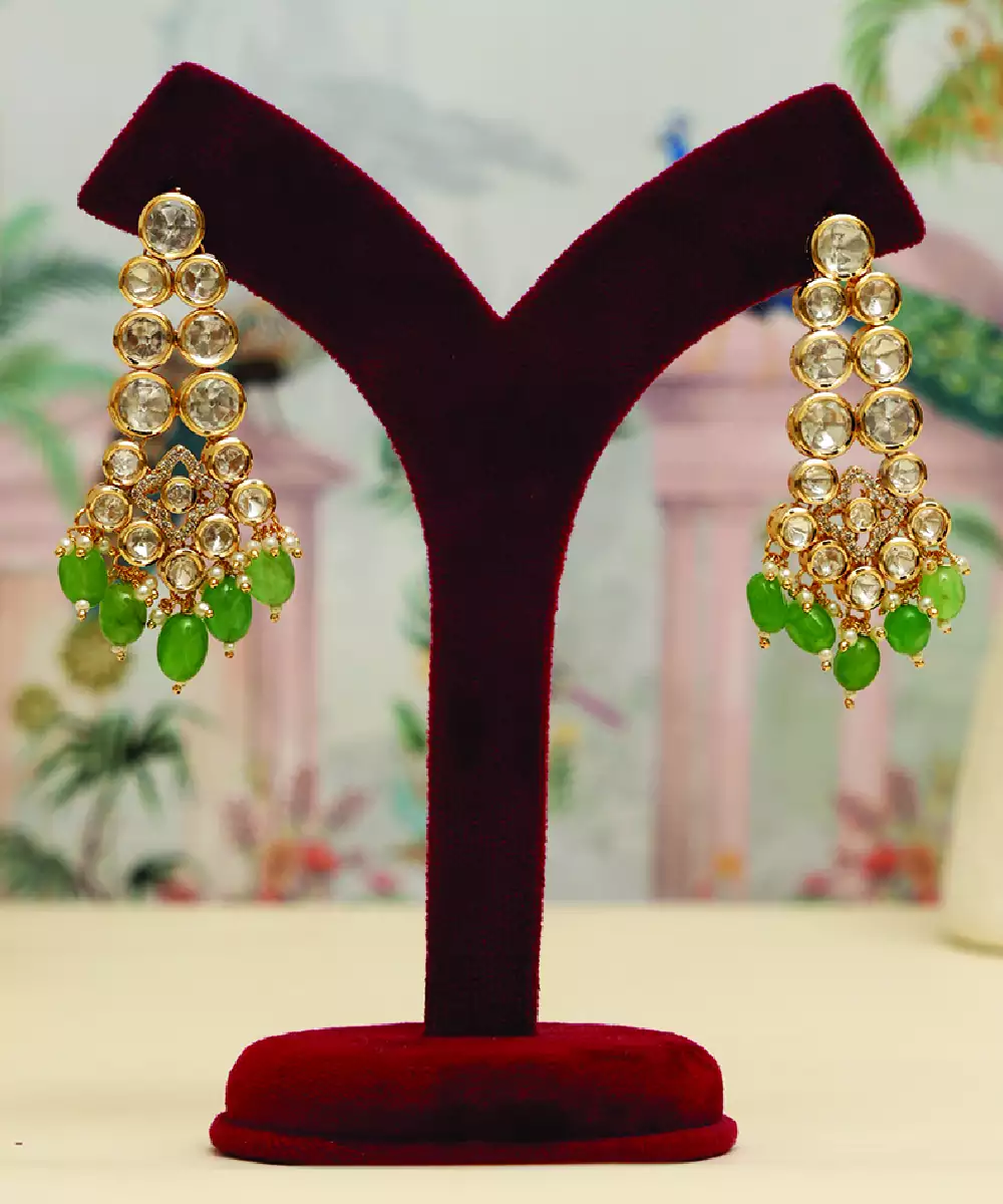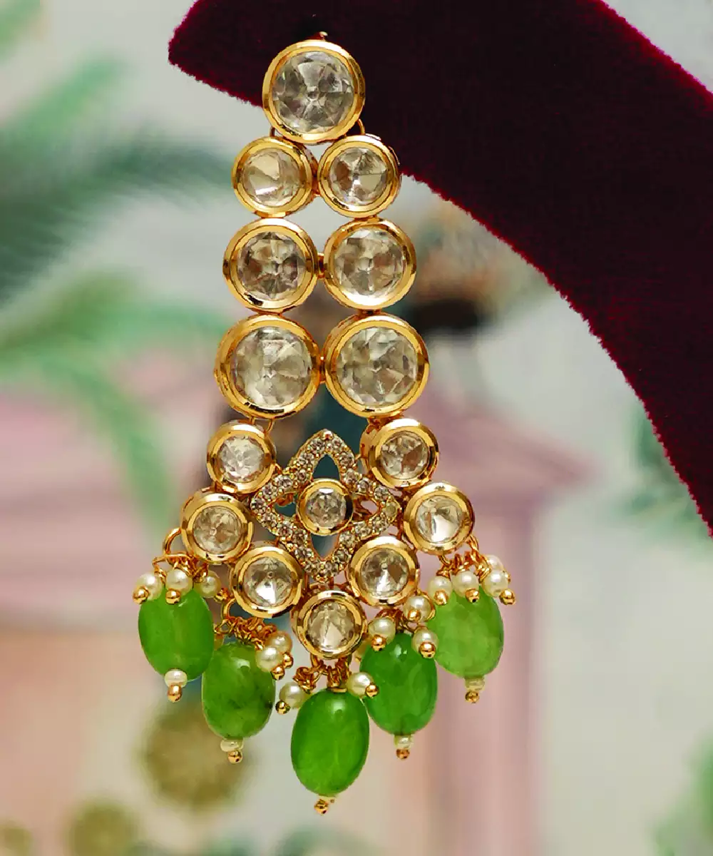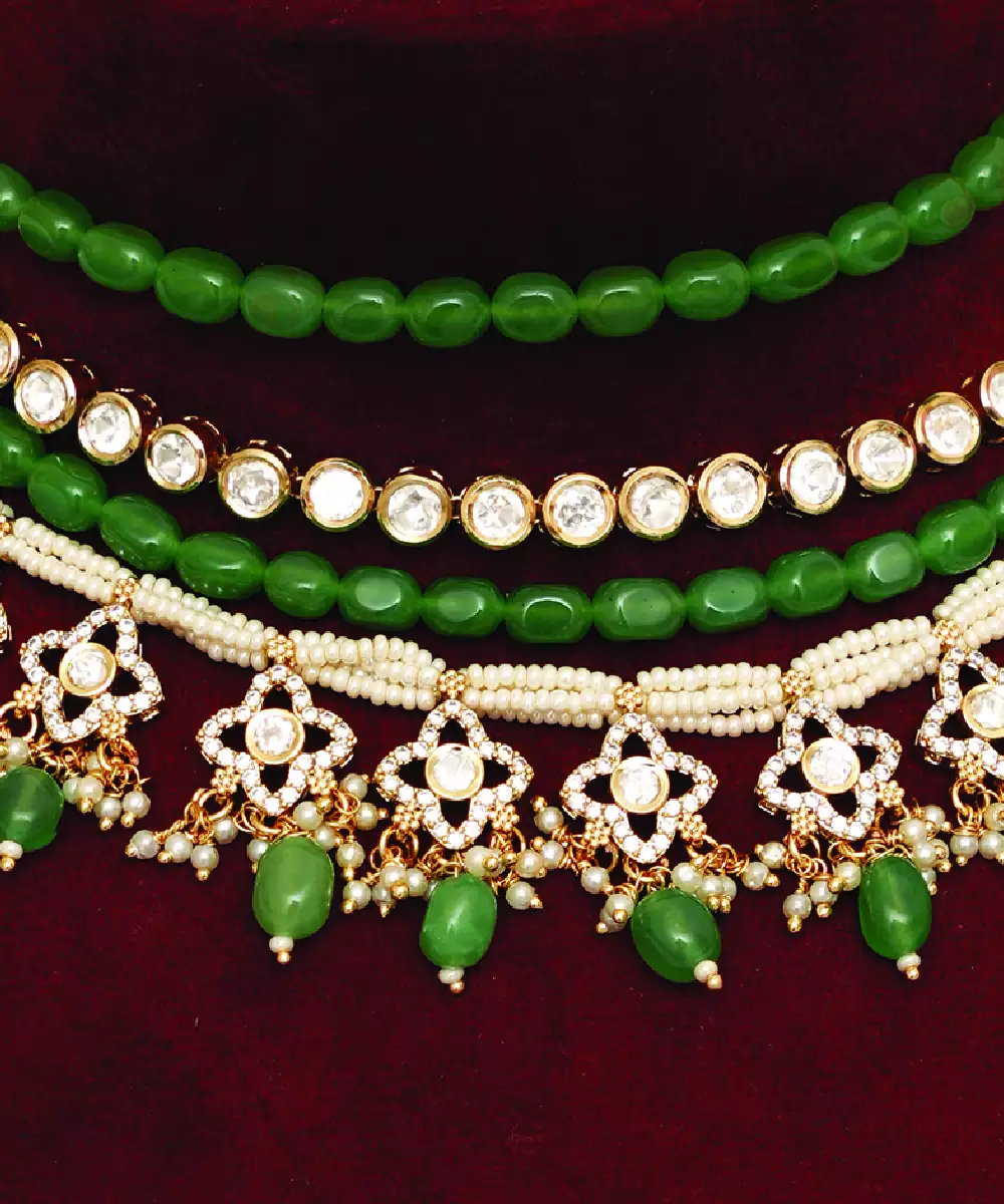 This Gold Plated Kundan Multi Layered Necklace Set Features Elegant Layers Adorned With Green Stones, Creating A Rich And Regal Look. The Intricate Craftsmanship Enhances Its Traditional Appeal, Making It Perfect For Weddings And Festive Occasions. A Statement Piece That Adds Depth, Elegance, And Sophistication To Your Ensemble.