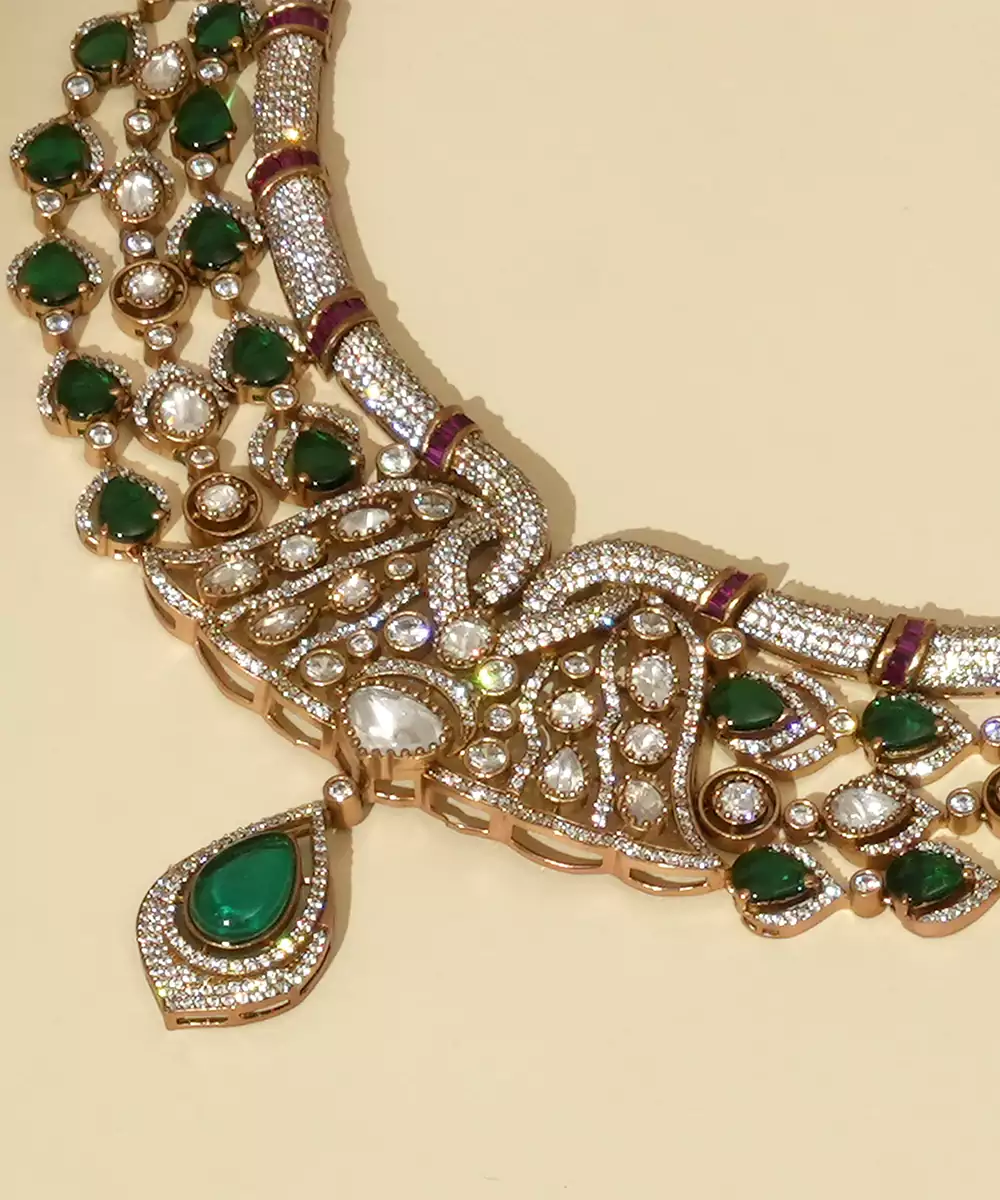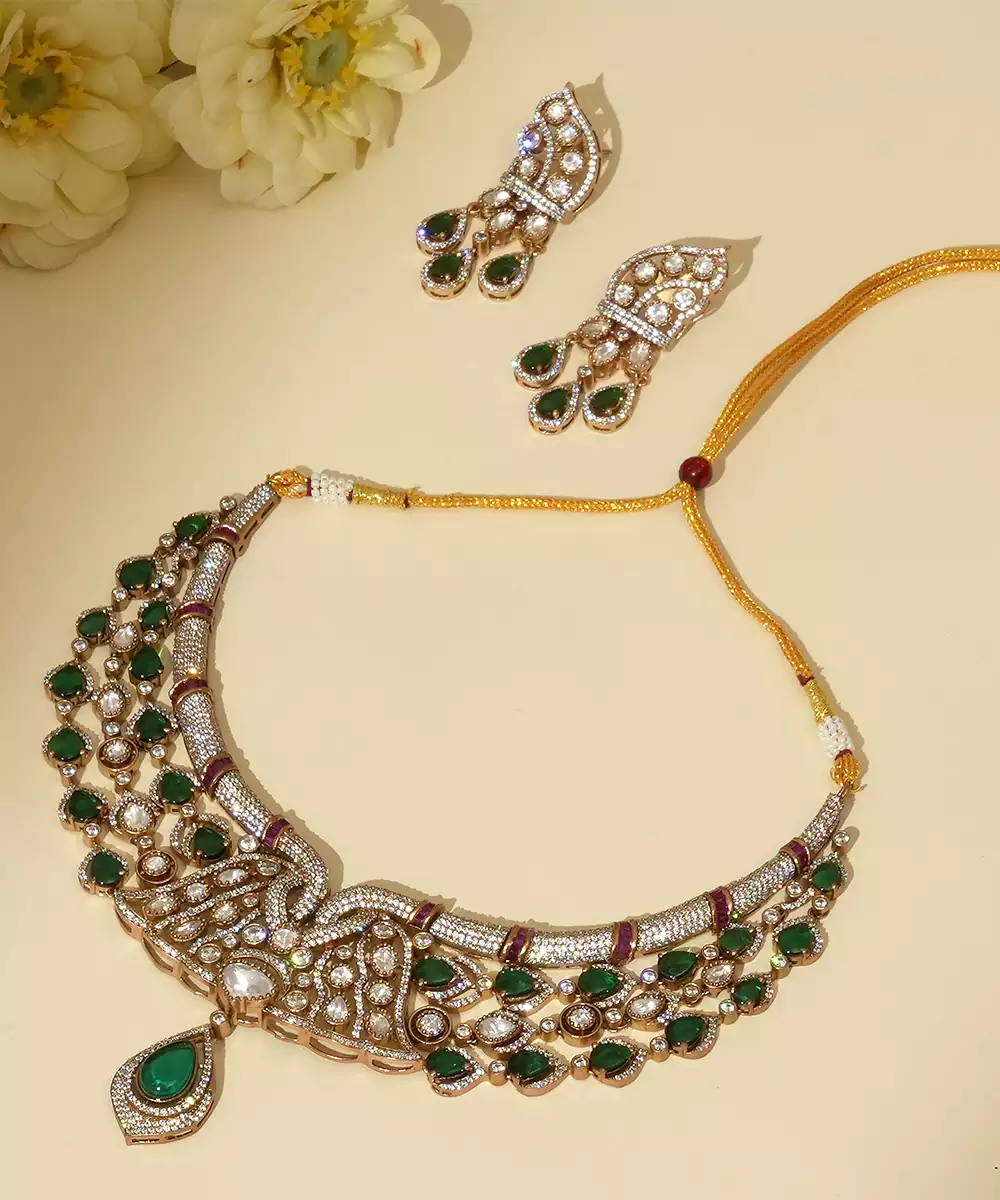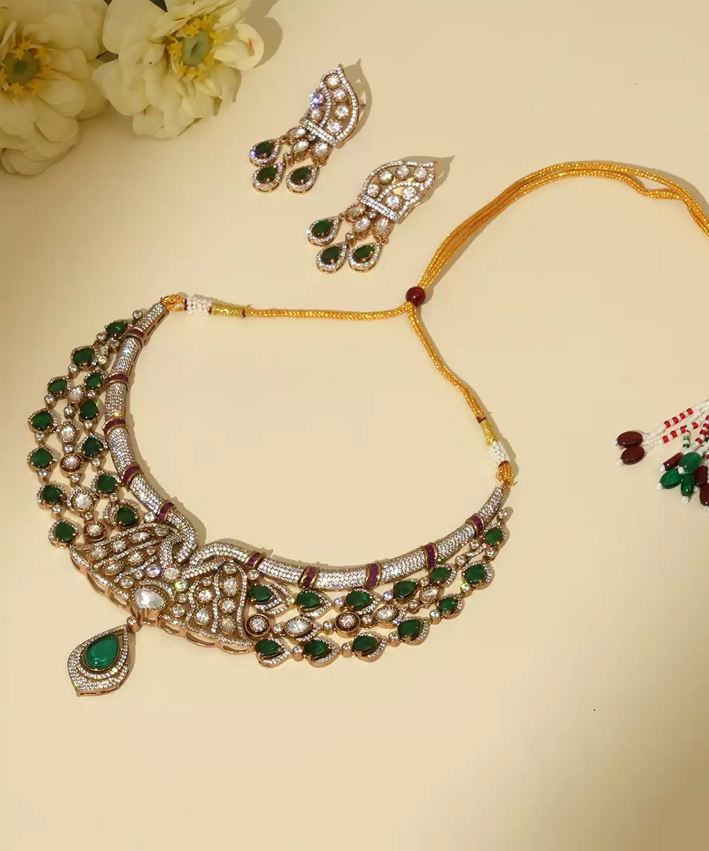 Gold Plated Kundan Necklace Set Adorned With Rich Green Stones, Exuding Timeless Elegance And Royal Charm. Crafted With Intricate Detailing And A Luxurious Finish, This Set Is Perfect For Weddings, Festive Occasions, And Grand Celebrations, Beautifully Complementing Traditional And Ethnic Ensembles With A Regal Touch.