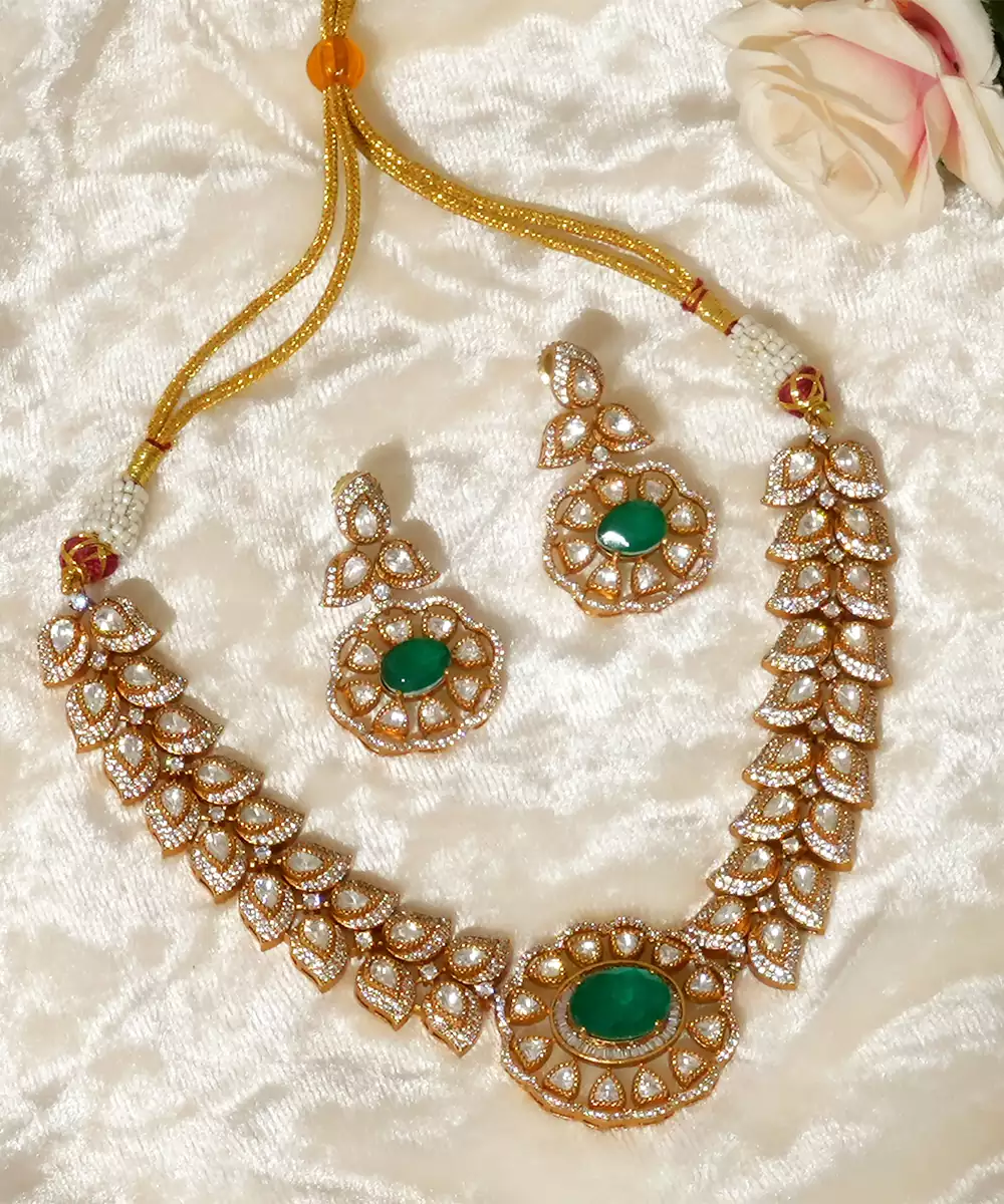 Gold Plated Kundan Necklace Set Embellished With Rich Green Stones, Reflecting Timeless Elegance And Royal Charm. Designed With Intricate Craftsmanship And A Luxurious Finish, This Stunning Set Is Perfect For Weddings, Festive Occasions, And Celebrations, Beautifully Enhancing Traditional And Ethnic Ensembles With A Graceful, Regal Appeal.