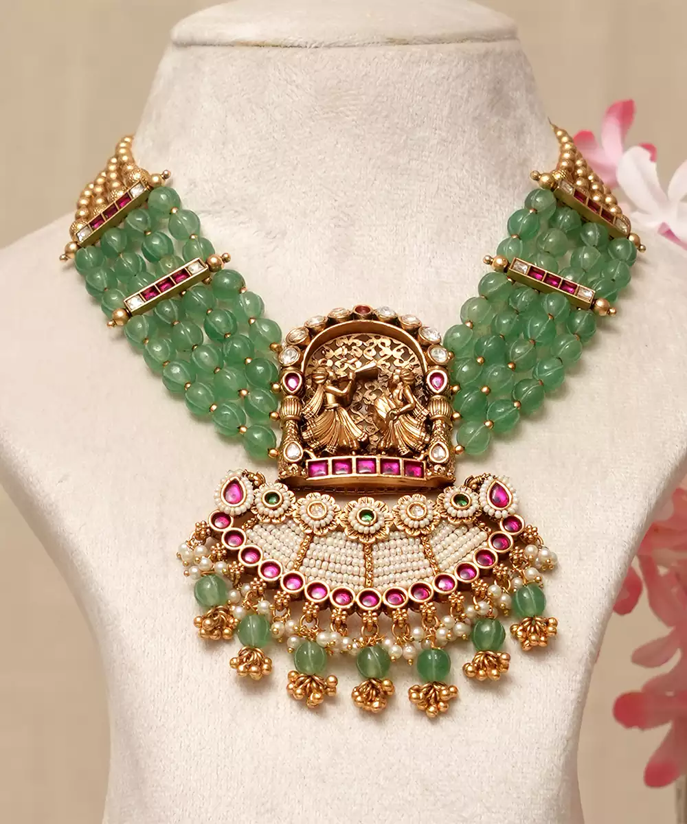 Gold Plated Kundan Green Stones Necklace Set Is A Regal And Elegant Accessory That Beautifully Showcases Traditional Craftsmanship. Adorned With Intricate Kundan Work And Vibrant Green Stones, It Enhances Any Ethnic Or Festive Ensemble. Perfect For Weddings, Celebrations, And Special Occasions, This Necklace Set Adds A Touch Of Sophistication And Timeless Charm.