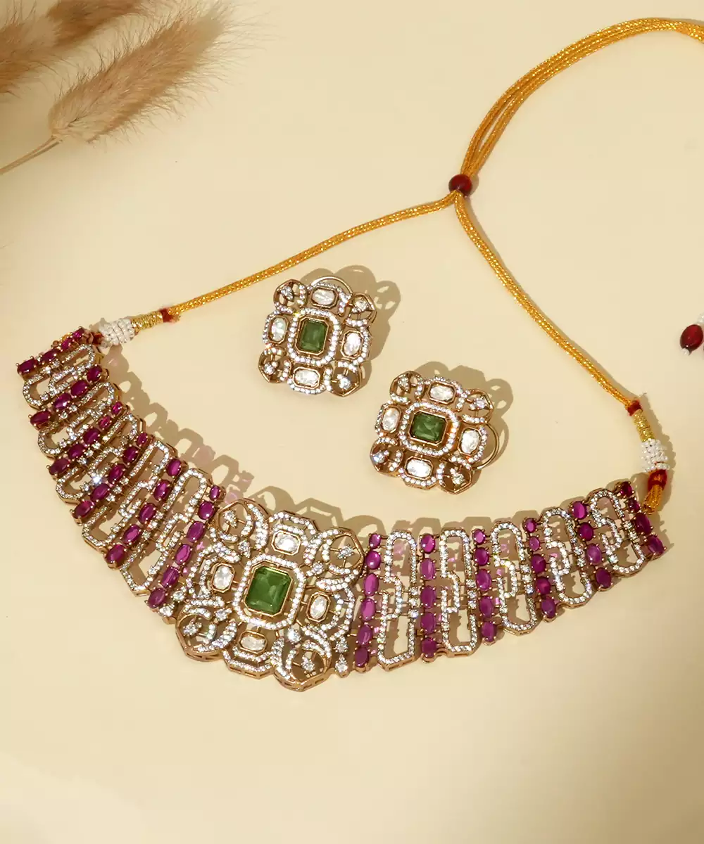 Gold Plated Kundan Choker Necklace Set Embellished With Vibrant Multicolor Stones For A Striking, Regal Appeal. Designed With Intricate Craftsmanship And A Luxurious Finish, This Statement Set Is Perfect For Weddings, Festive Occasions, And Celebrations, Adding Rich Elegance And Traditional Charm To Ethnic And Bridal Ensembles.