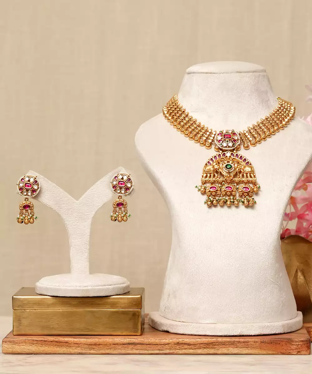 Gold Plated Kundan Multicolor Stones Necklace Set Is A Vibrant And Exquisite Accessory That Elevates Any Festive Or Wedding Ensemble. Featuring Intricate Kundan Craftsmanship Adorned With Dazzling Multicolor Stones, It Brings A Perfect Blend Of Tradition And Contemporary Elegance. Ideal For Special Occasions, It Adds A Regal And Eye Catching Charm.