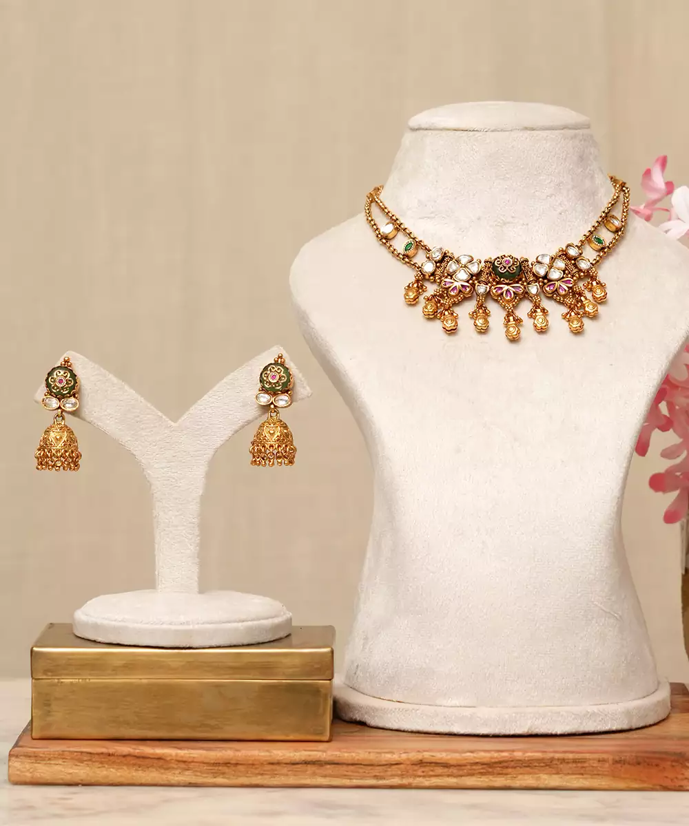 Gold Plated Kundan Multicolor Stones Necklace Set Is A Vibrant And Exquisite Accessory That Elevates Any Festive Or Wedding Ensemble. Featuring Intricate Kundan Craftsmanship Adorned With Dazzling Multicolor Stones, It Brings A Perfect Blend Of Tradition And Contemporary Elegance. Ideal For Special Occasions, It Adds A Regal And Eye Catching Charm.