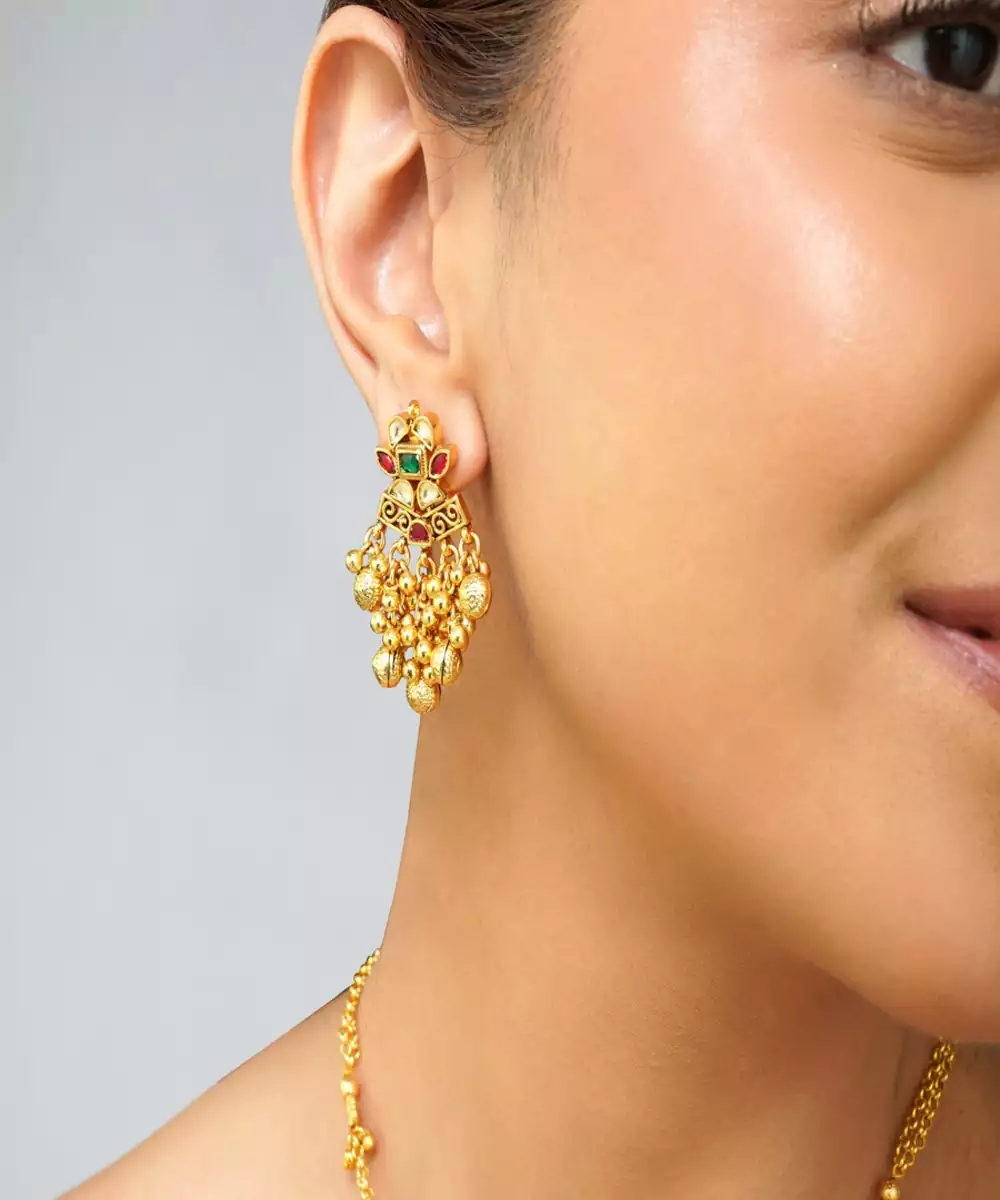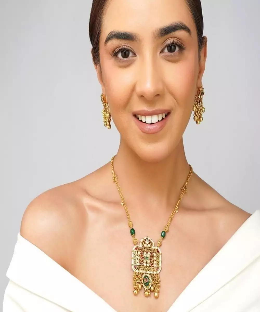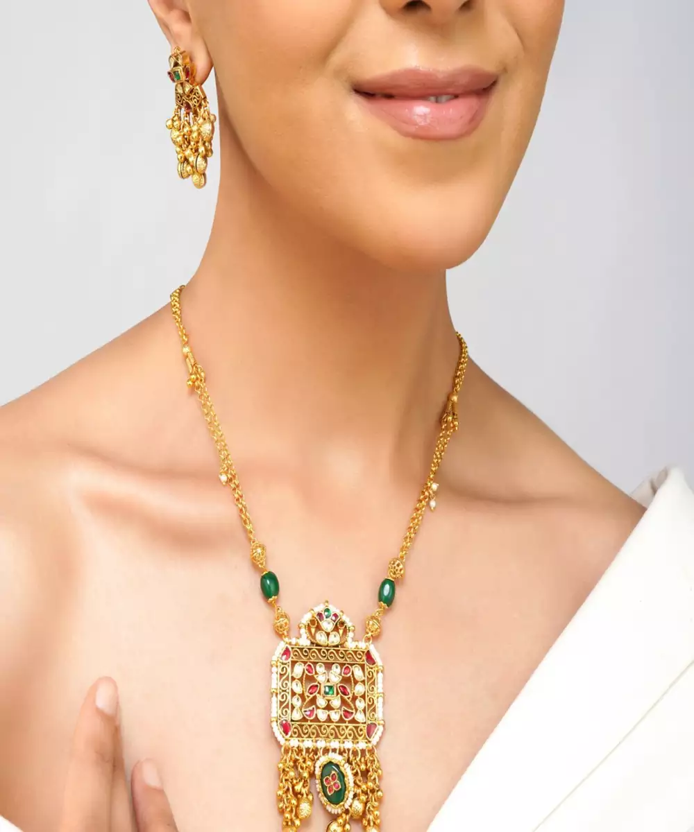 Add A Touch Of Regal Elegance To Your Jewelry Collection With This Exquisite Multi Color Kundan Pendant Set, Beautifully Paired With Emerald Green Pearls. Meticulously Handcrafted In A Real Gold Look, This Pendant Set Features Traditional Kundan Artistry And Premium 22 K Gold Plating, Making It Perfect For Festive, Bridal, And Everyday Ethnic Wear.