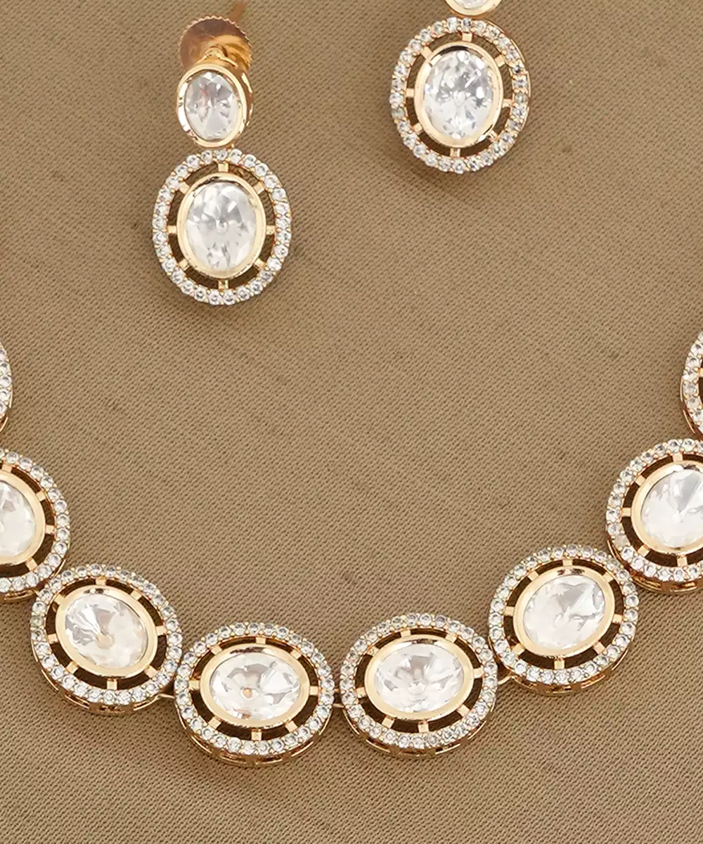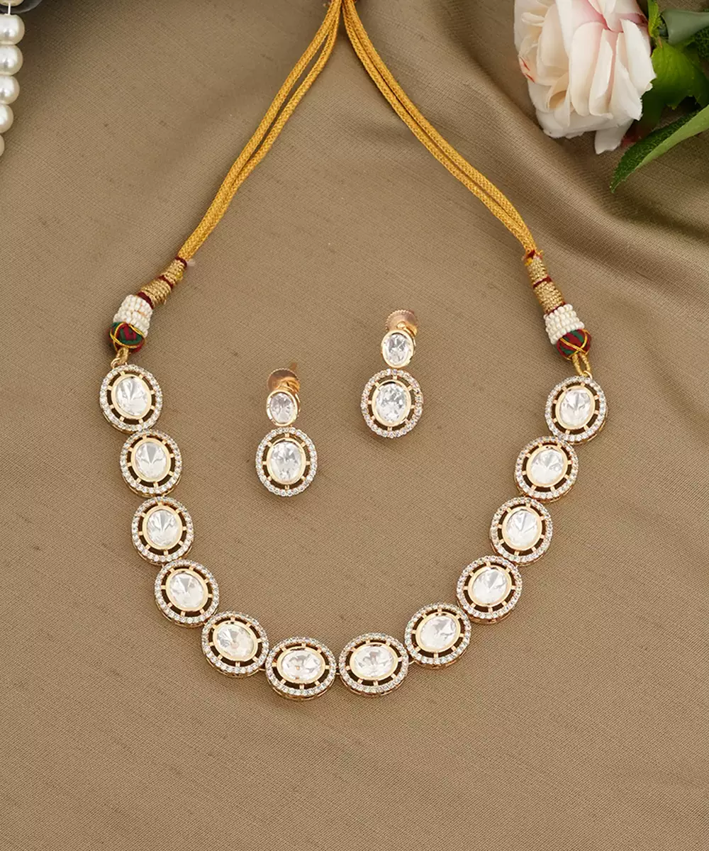 This Gold Plated Kundan Necklace Set Is Crafted To Reflect Royal Elegance And Classic Charm. Featuring Finely Set Kundan Stones With A Polished Gold Finish, It Complements Traditional Outfits Perfectly. Ideal For Weddings, Receptions, And Festive Occasions, It Adds Luxurious Sparkle And Timeless Appeal To Your Look.
