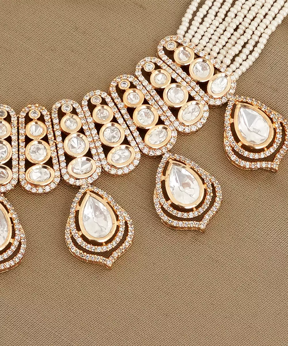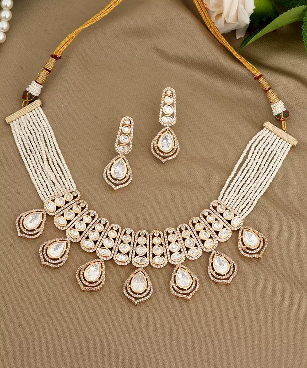 This Gold Plated Kundan Necklace Set Is Crafted To Reflect Royal Elegance And Classic Charm. Featuring Finely Set Kundan Stones With A Polished Gold Finish, It Complements Traditional Outfits Perfectly. Ideal For Weddings, Receptions, And Festive Occasions, It Adds Luxurious Sparkle And Timeless Appeal To Your Look.