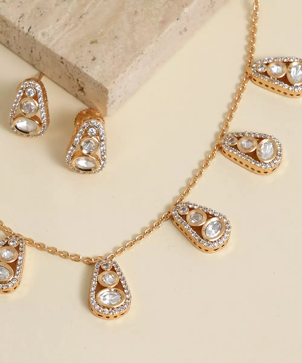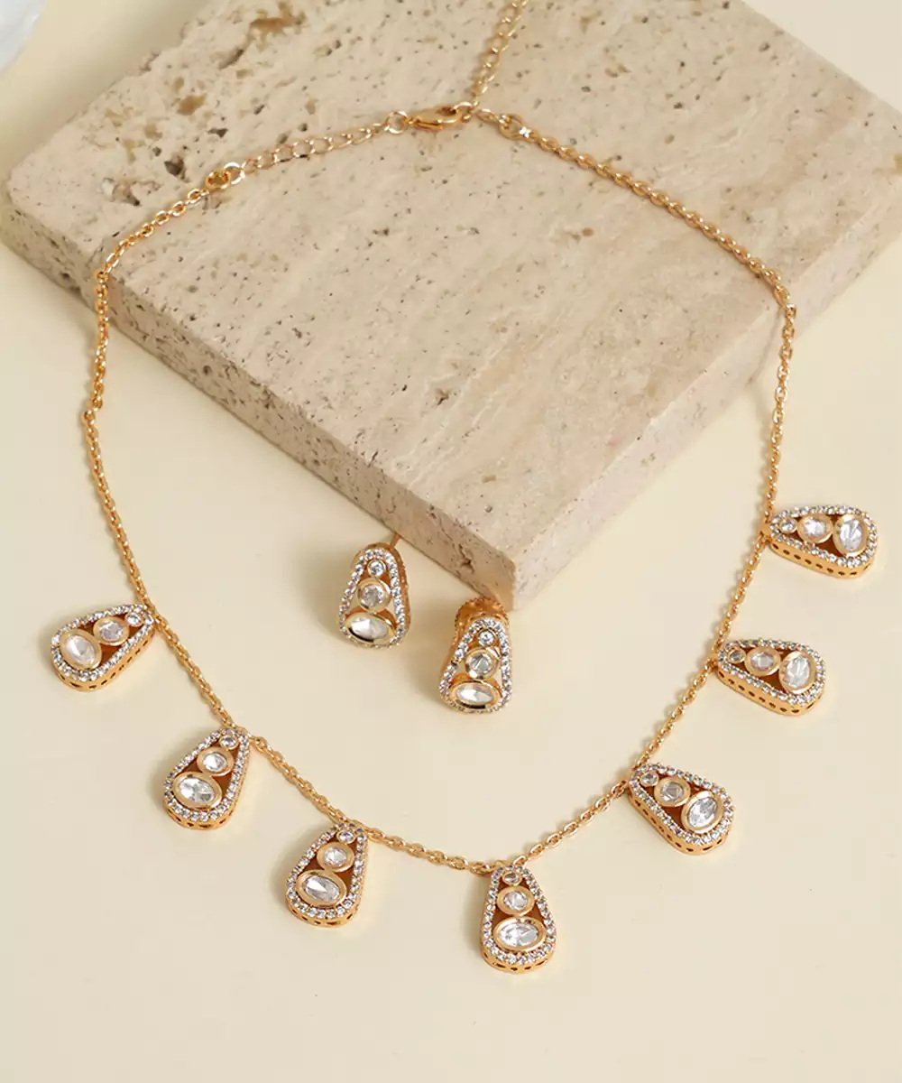 This Gold Plated Kundan Necklace Set Is Crafted To Reflect Royal Elegance And Classic Charm. Featuring Finely Set Kundan Stones With A Polished Gold Finish, It Complements Traditional Outfits Perfectly. Ideal For Weddings, Receptions, And Festive Occasions, It Adds Luxurious Sparkle And Timeless Appeal To Your Look.