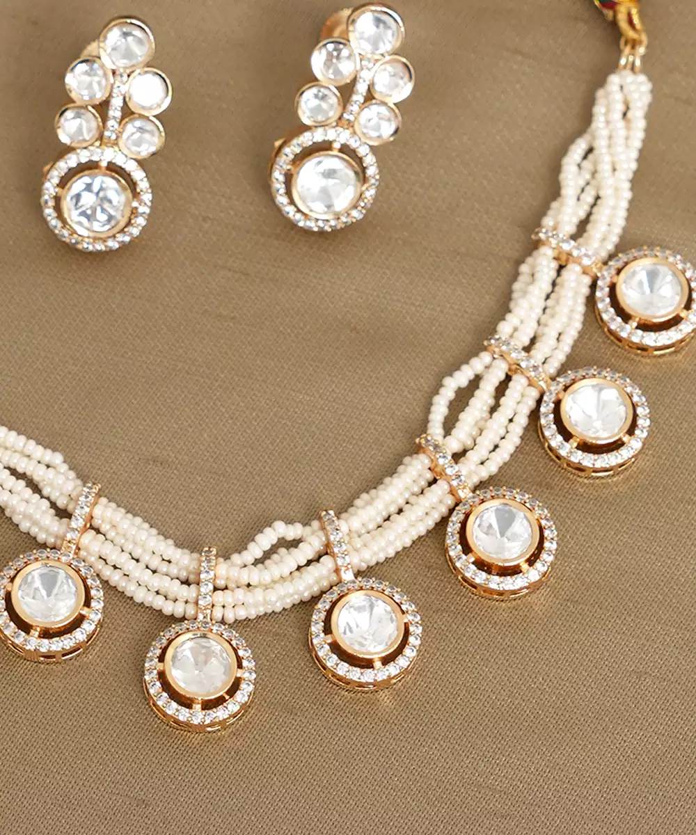 This Gold Plated Kundan Necklace Set Showcases Classic Kundan Craftsmanship With Finely Set Stones And A Polished Gold Finish. Designed For Festive Elegance, It Complements Sarees And Lehengas Beautifully. Ideal For Weddings, Receptions, And Special Occasions, It Adds Royal Charm And Timeless Sophistication To Your Look.