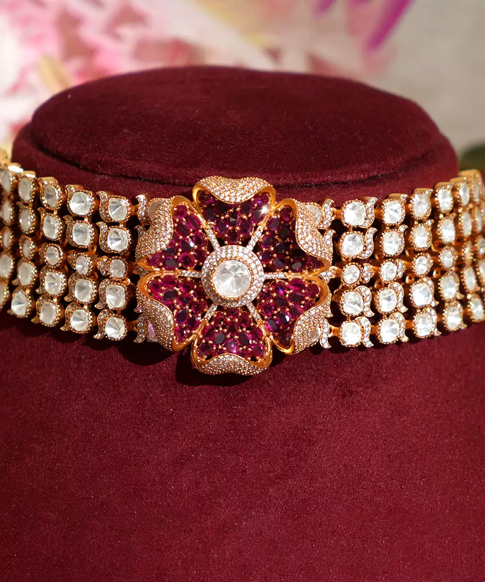This Gold Plated Kundan Pink Stones Choker Necklace Set Exudes Regal Elegance And Feminine Charm. Adorned With Delicately Set Pink Stones, It Features Intricate Craftsmanship And A Radiant Finish. Ideal For Weddings, Festive Occasions, Or Celebrations, It Enhances Traditional And Contemporary Outfits With Timeless Sophistication And Graceful Allure.