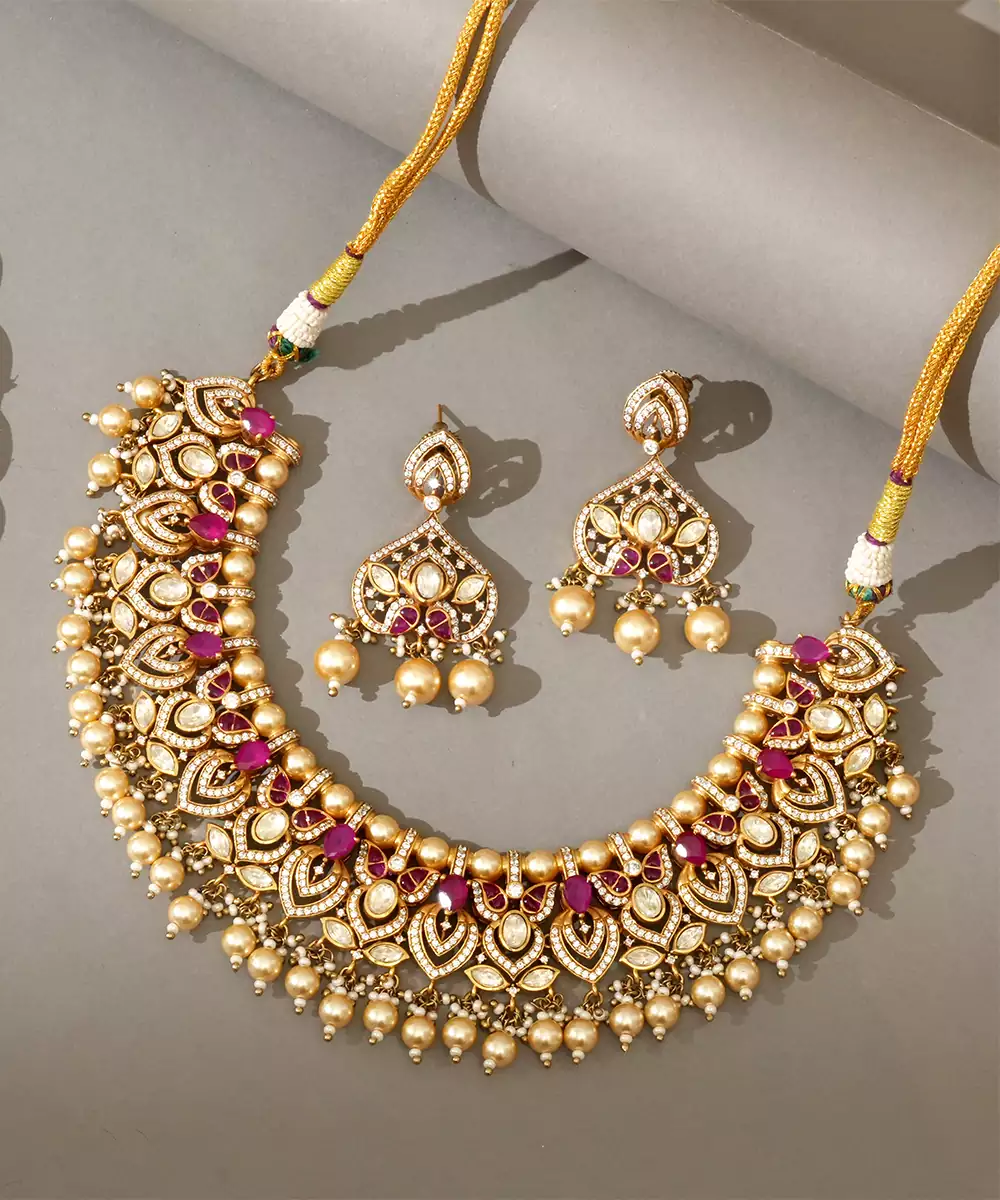 Gold Plated Kundan Necklace Set Adorned With Elegant Pink Stones, Radiating Grace And Timeless Charm. Crafted With Intricate Detailing And A Rich Finish, This Beautiful Set Is Perfect For Weddings, Festive Occasions, And Special Celebrations, Enhancing Traditional And Ethnic Ensembles With A Soft, Regal Appeal.