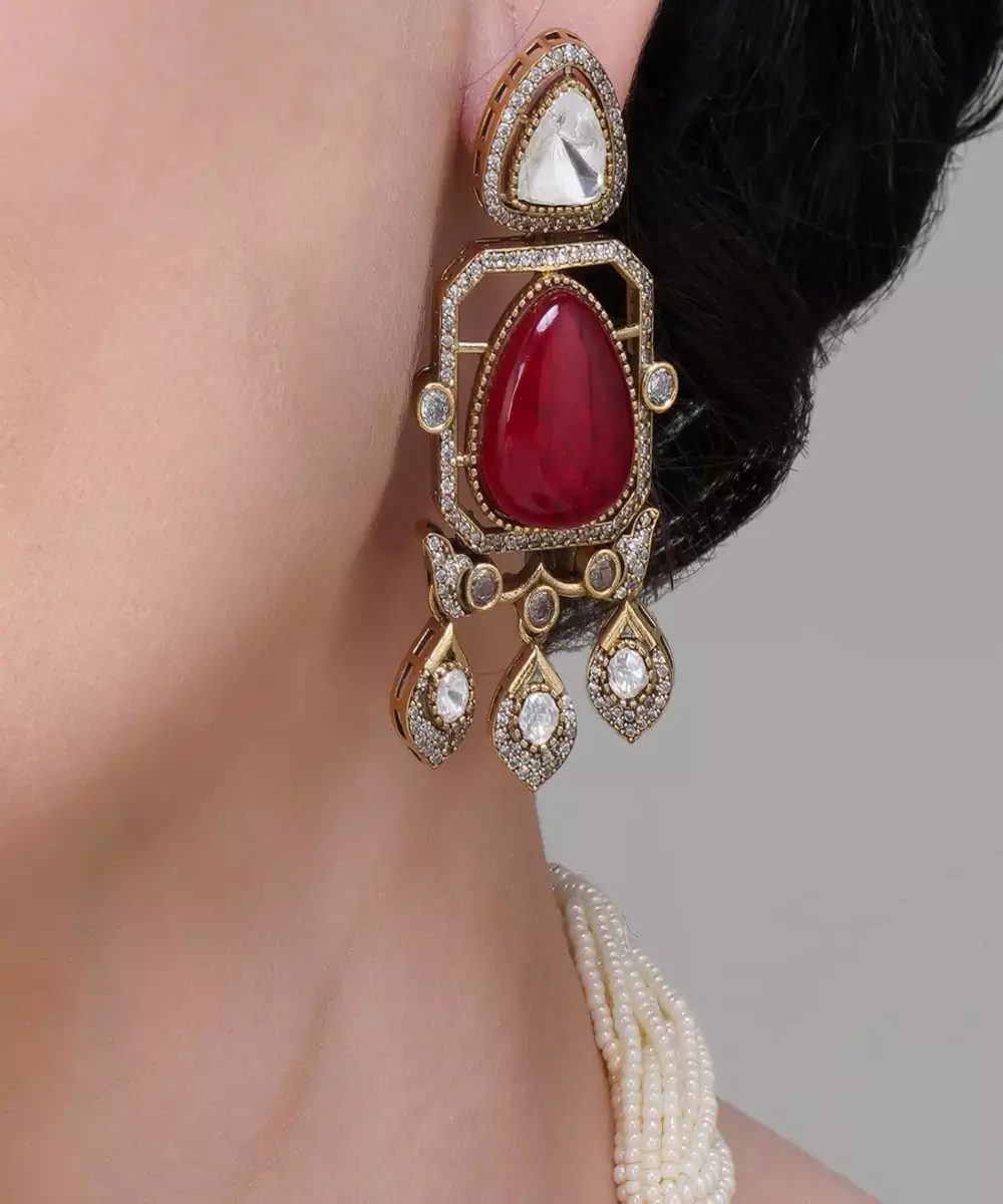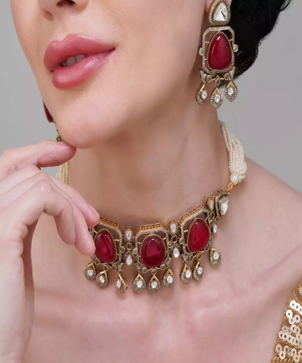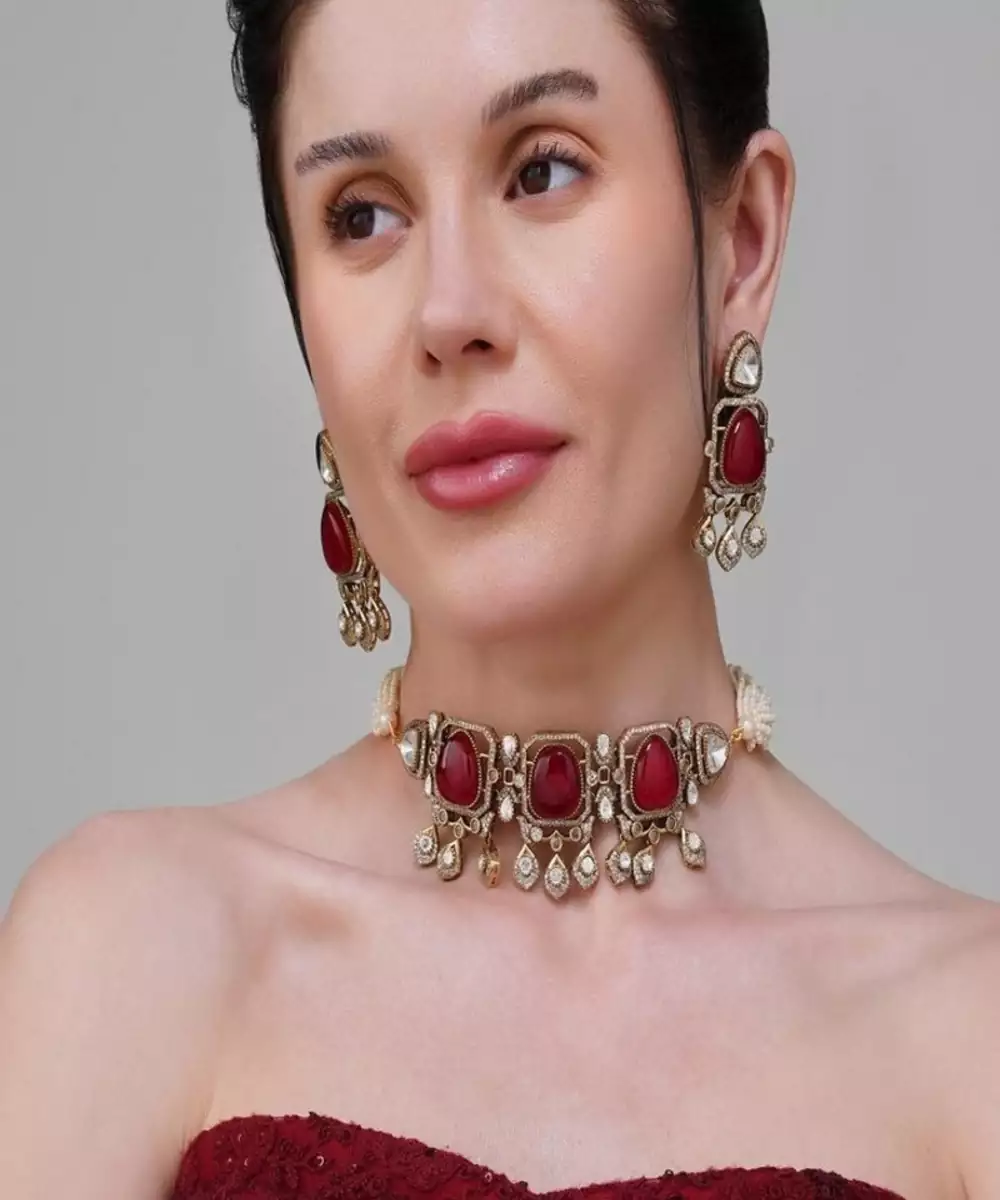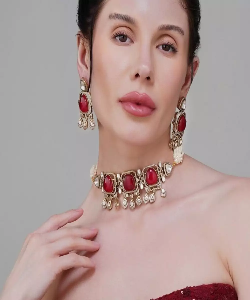 Crafted Meticulously With Intricate Kundan Work, This Set Features A Bold Maroon Palette That Exudes Royal Charm. The Choker Is Adorned With Dazzling Uncut Stones Set In Antique Finish Gold Plating, Accentuated With Delicate Bead Droplets For A Touch Of Grace.Whether Paired With A Silk Saree Or A Richly Embroidered Lehenga, This Piece Is Sure To Turn Heads And Spark Compliments.