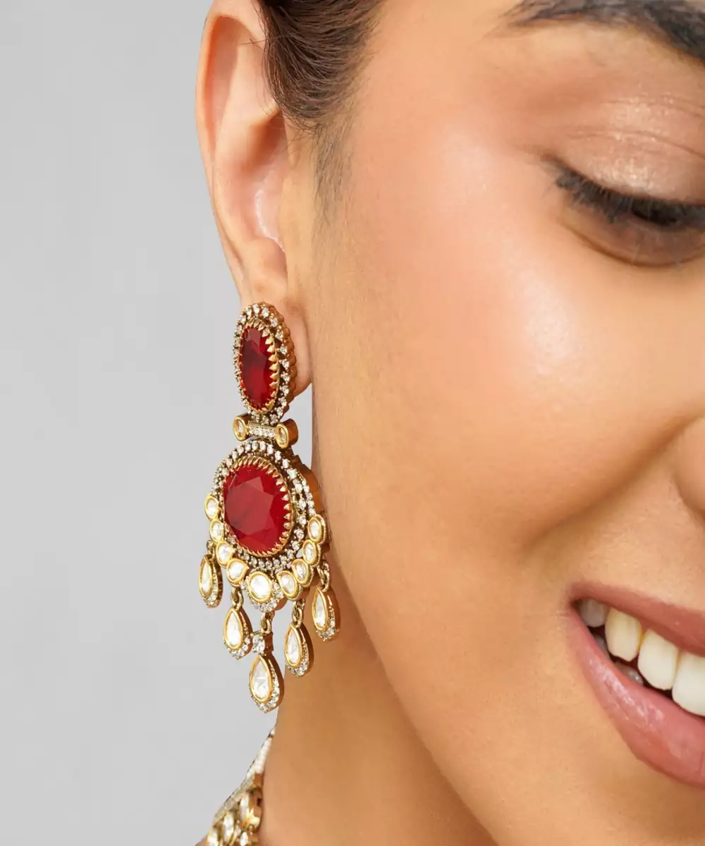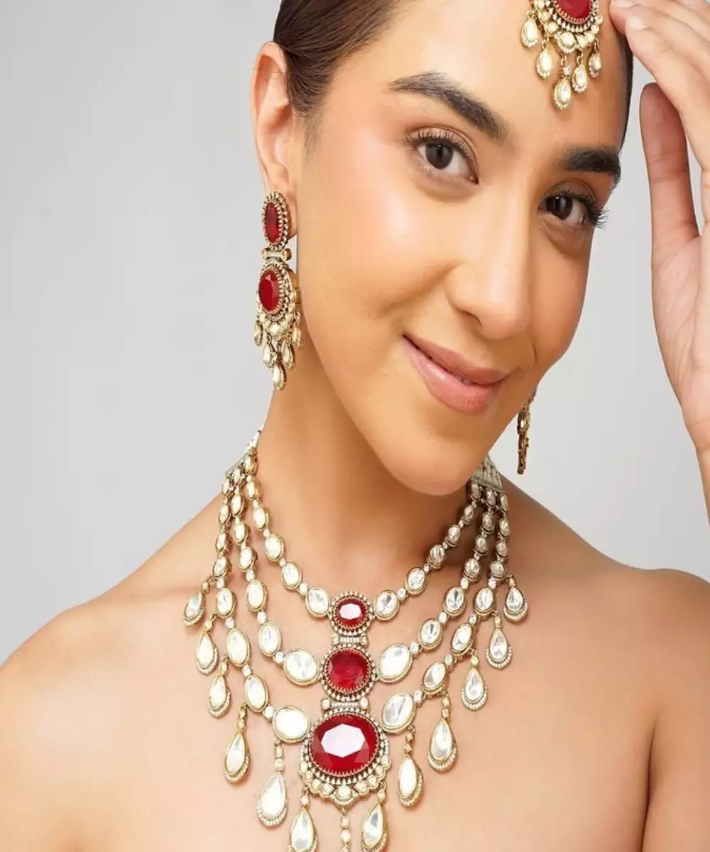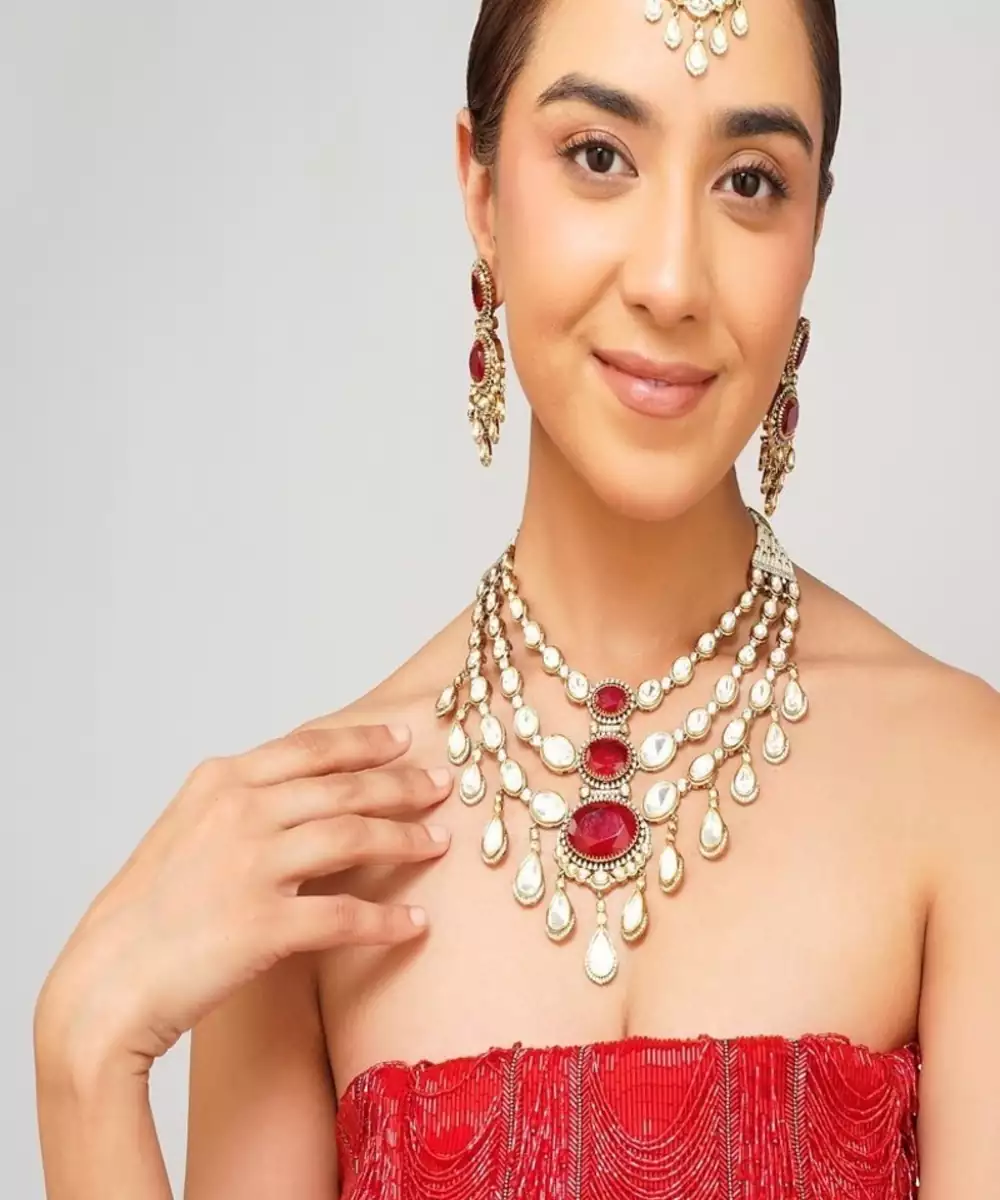 Make A Majestic Style Statement With This 3 Layered Designer Kundan Necklace Set, Beautifully Handcrafted With Trending Emerald And Ruby Kundan Doublets. Inspired By Royal Indian Jewelry, This Set Features A Rich Real Gold Look Enhanced With High Quality 22 K Gold Plating—Perfect For Bridal And Festive Occasions.
