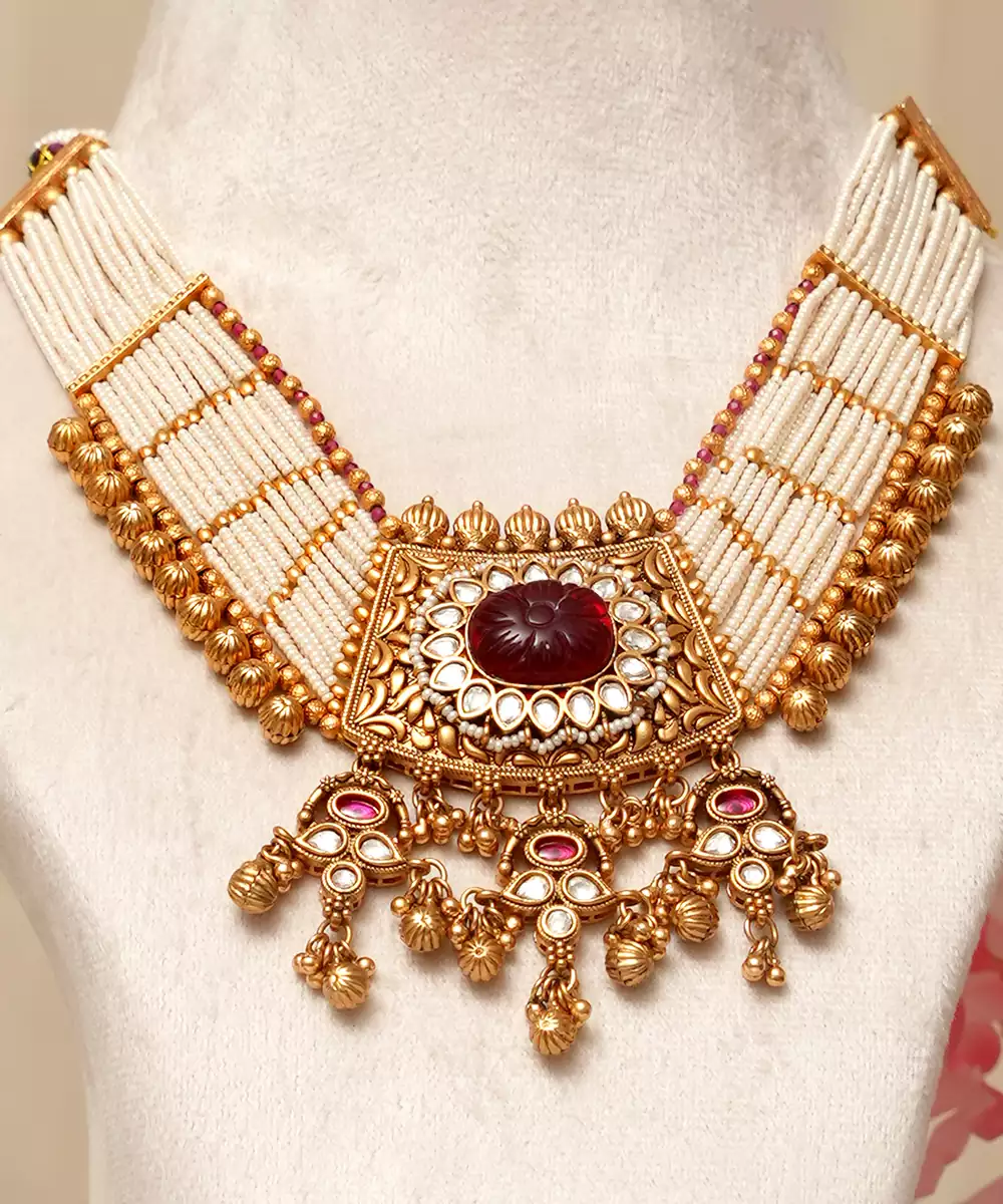 Gold Plated Kundan Red Stones Necklace Set Is A Striking And Elegant Piece That Radiates Traditional Charm. Featuring Intricate Kundan Craftsmanship And Vibrant Red Stones, It Adds A Rich, Festive Touch To Any Ethnic Outfit. Perfect For Weddings, Celebrations, And Special Occasions, This Necklace Set Exudes Timeless Beauty And Sophistication.