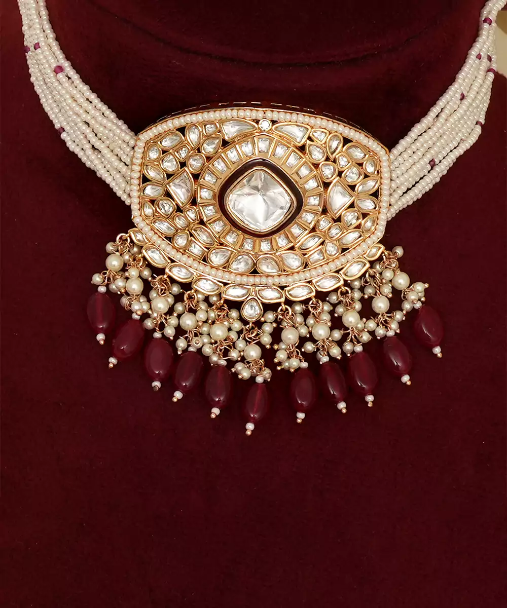 Gold Plated Kundan Red Stones Necklace Set Is A Striking And Elegant Piece That Radiates Traditional Charm. Featuring Intricate Kundan Craftsmanship And Vibrant Red Stones, It Adds A Rich, Festive Touch To Any Ethnic Outfit. Perfect For Weddings, Celebrations, And Special Occasions, This Necklace Set Exudes Timeless Beauty And Sophistication.