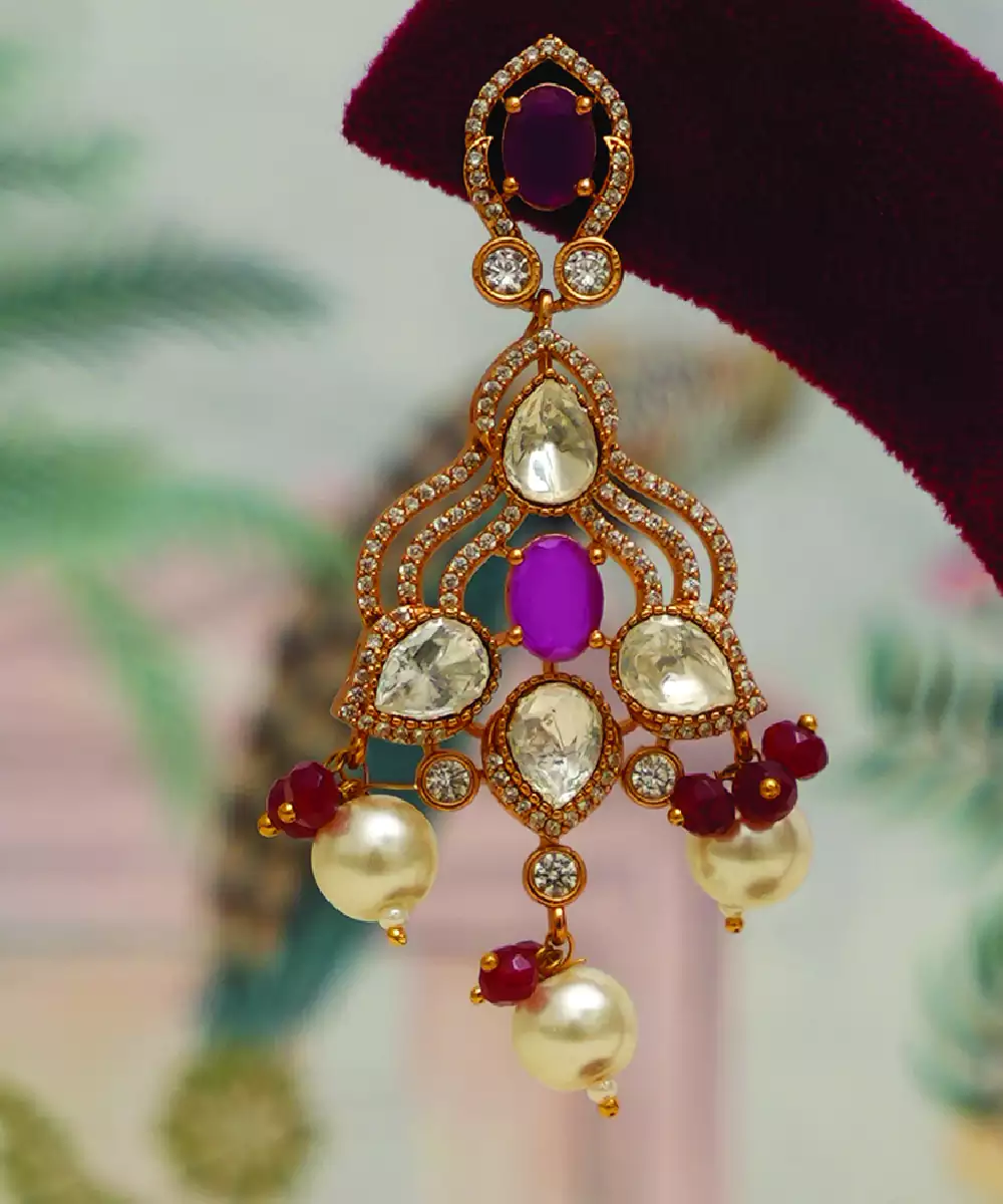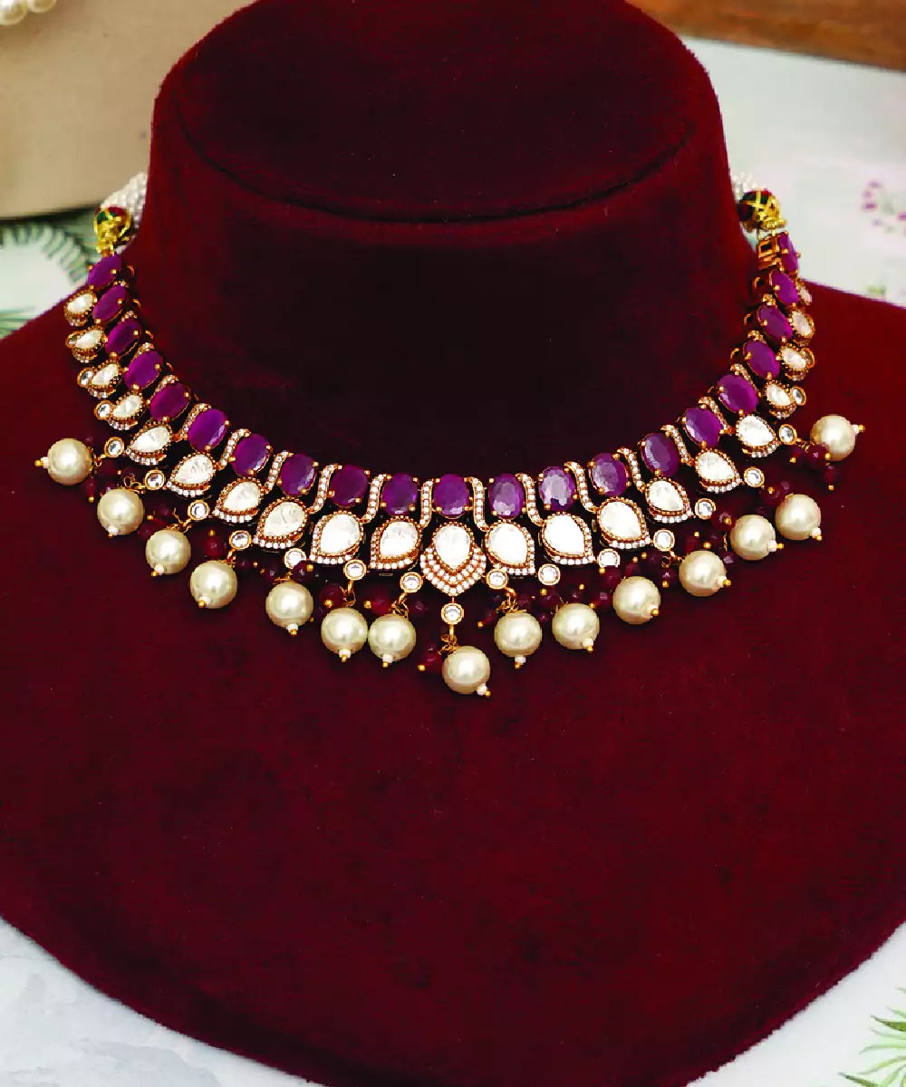 This Gold Plated Necklace Set With Maroon Stones Exudes Richness And Elegance. The Deep Hues Combined With Intricate Design Create A Luxurious Appeal, Perfect For Festive And Traditional Wear. Paired With Matching Earrings, It Completes Your Look With A Sophisticated And Timeless Charm.