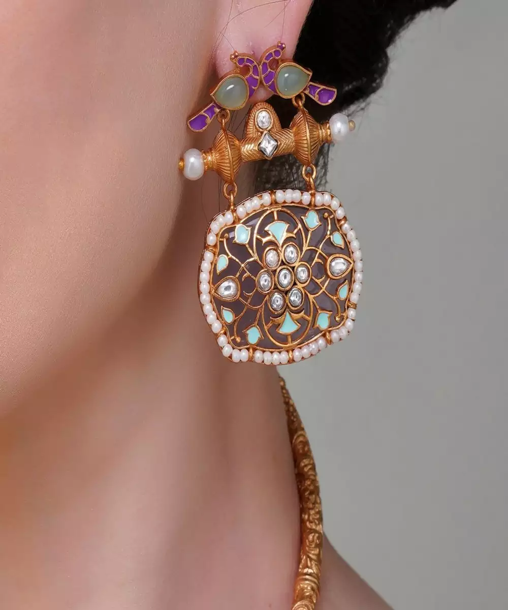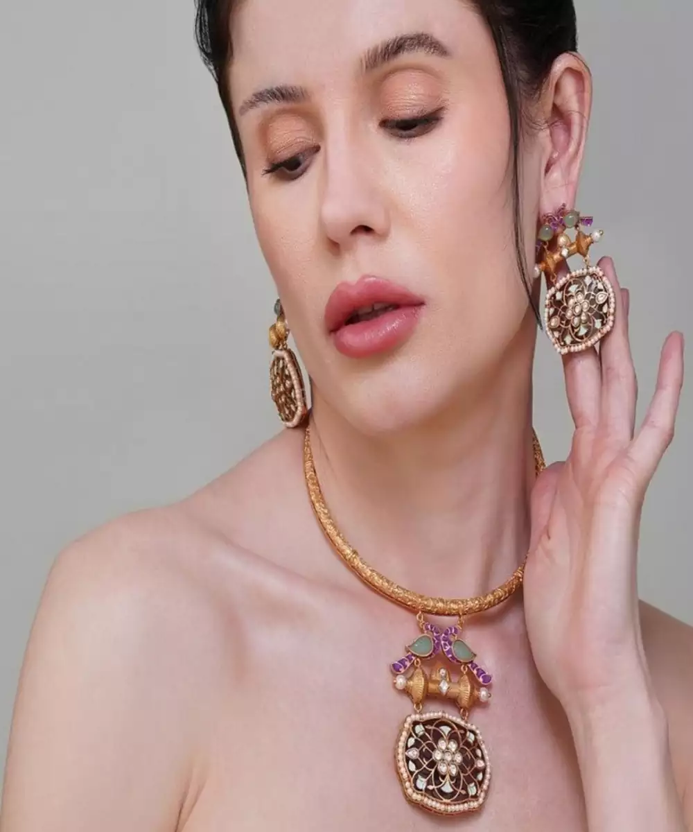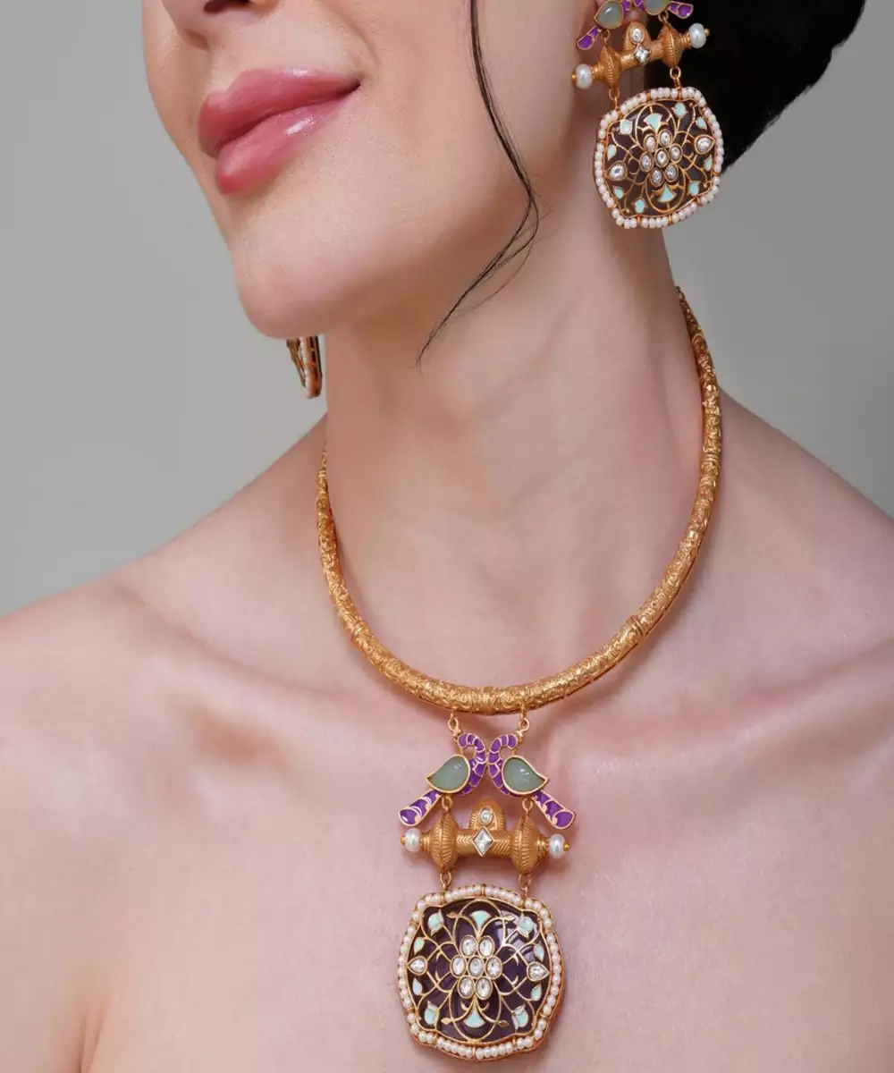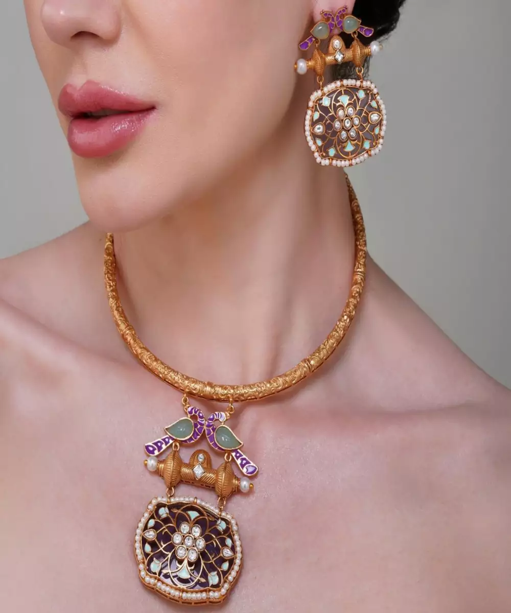 Indulge In The Regal Allure Of The Dark Lavender Meena Kundan Jadau Fusion Halsi, Where Traditional Craftsmanship Meets Modern Sophistication. This Handcrafted Masterpiece Features Intricate Jadau Work, Adorned With Radiant Kundan Stones And Detailed Meena Enamel In A Deep, Enchanting Shade Of Lavender.