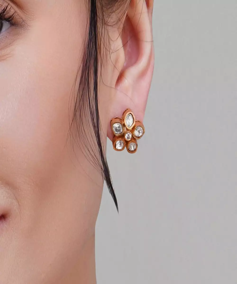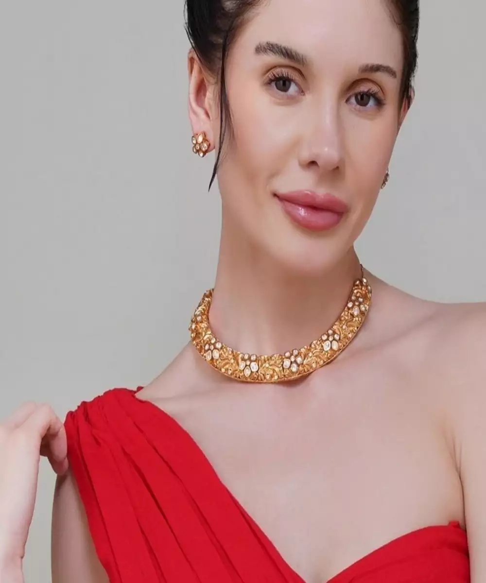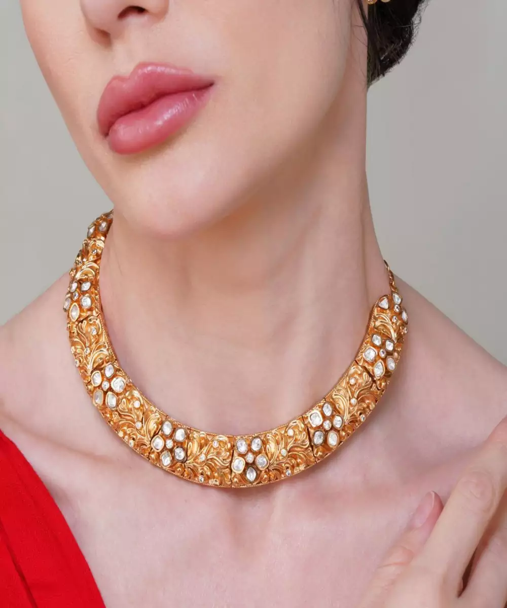 This Meticulously Handcrafted Piece Features Classic Jadau Work, Showcasing A Stunning Arrangement Of Unpolished Gemstones And Kundan Detailing, All Set In A Lustrous Gold Plated Finish.Designed In The Elegant Hasli Style — A Close Fitting, Rigid Necklace That Sits Gracefully Around The Neck — This Piece Embodies Regal Charm And Artisanal Finesse. Perfect For Brides, Festive Wear, Or Heirloom Inspired Styling, The Gold Jadau Hasli Brings A Touch Of Vintage Grandeur To Any Ensemble.