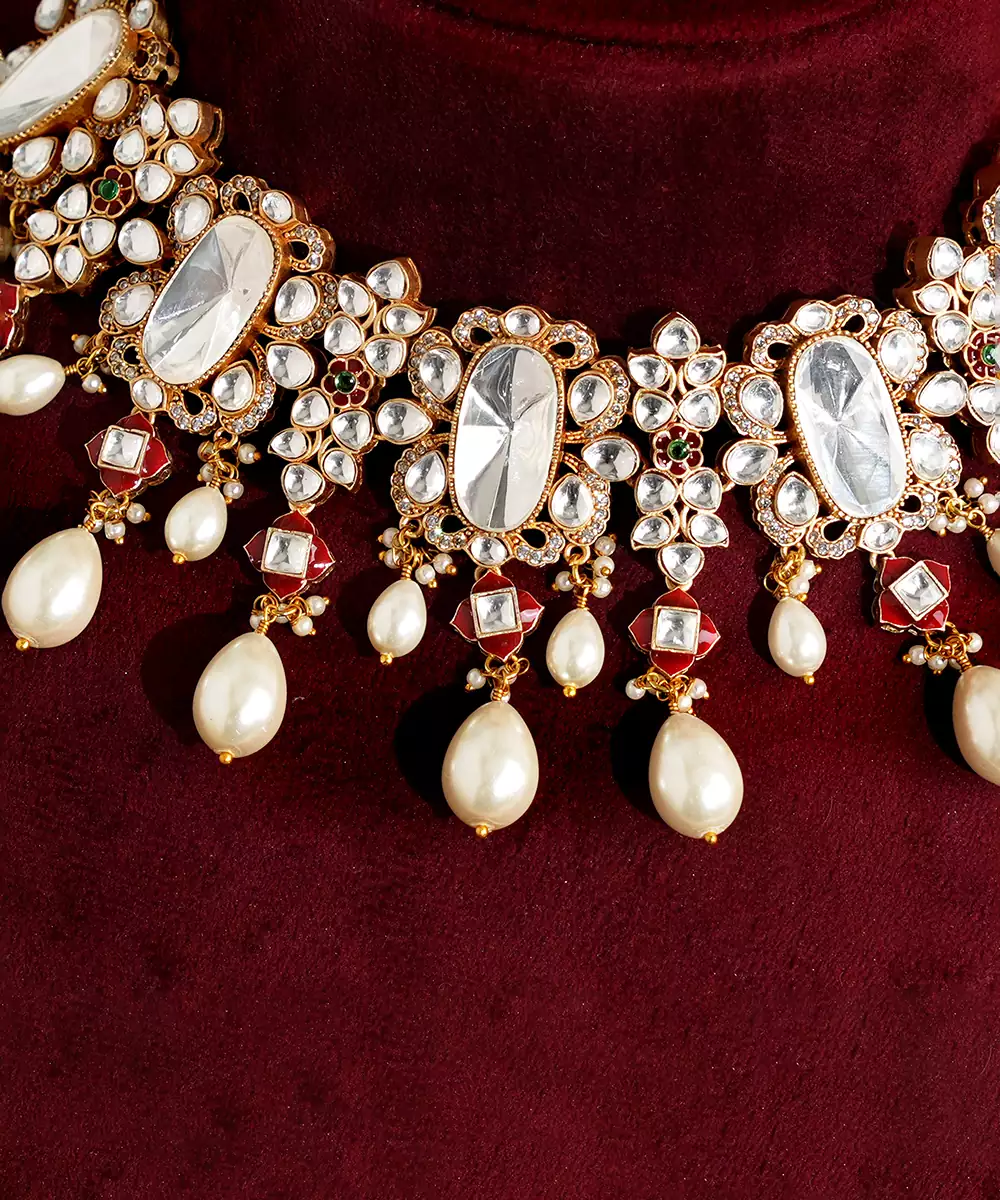 Celebrate Timeless Elegance With This Designer Kundan Necklace Set Featuring Meena Work, Exquisitely Paired With Semi Precious Pearls And A Matching Tikka. Handcrafted With Precision, This Jewellery Set Blends Traditional Artistry With Contemporary Style, Making It Perfect For Weddings, Festive Occasions, And Special Celebrations.