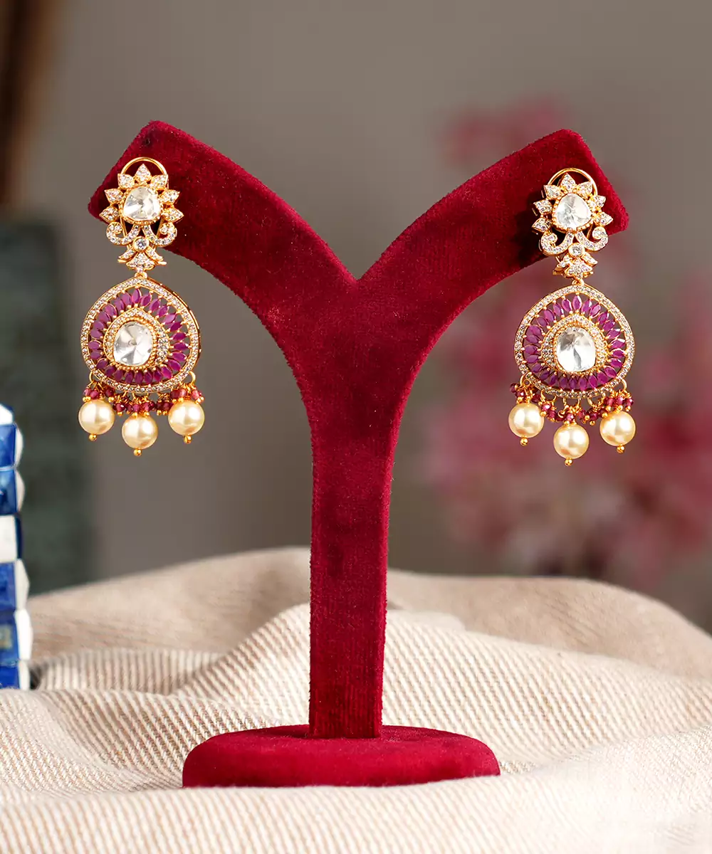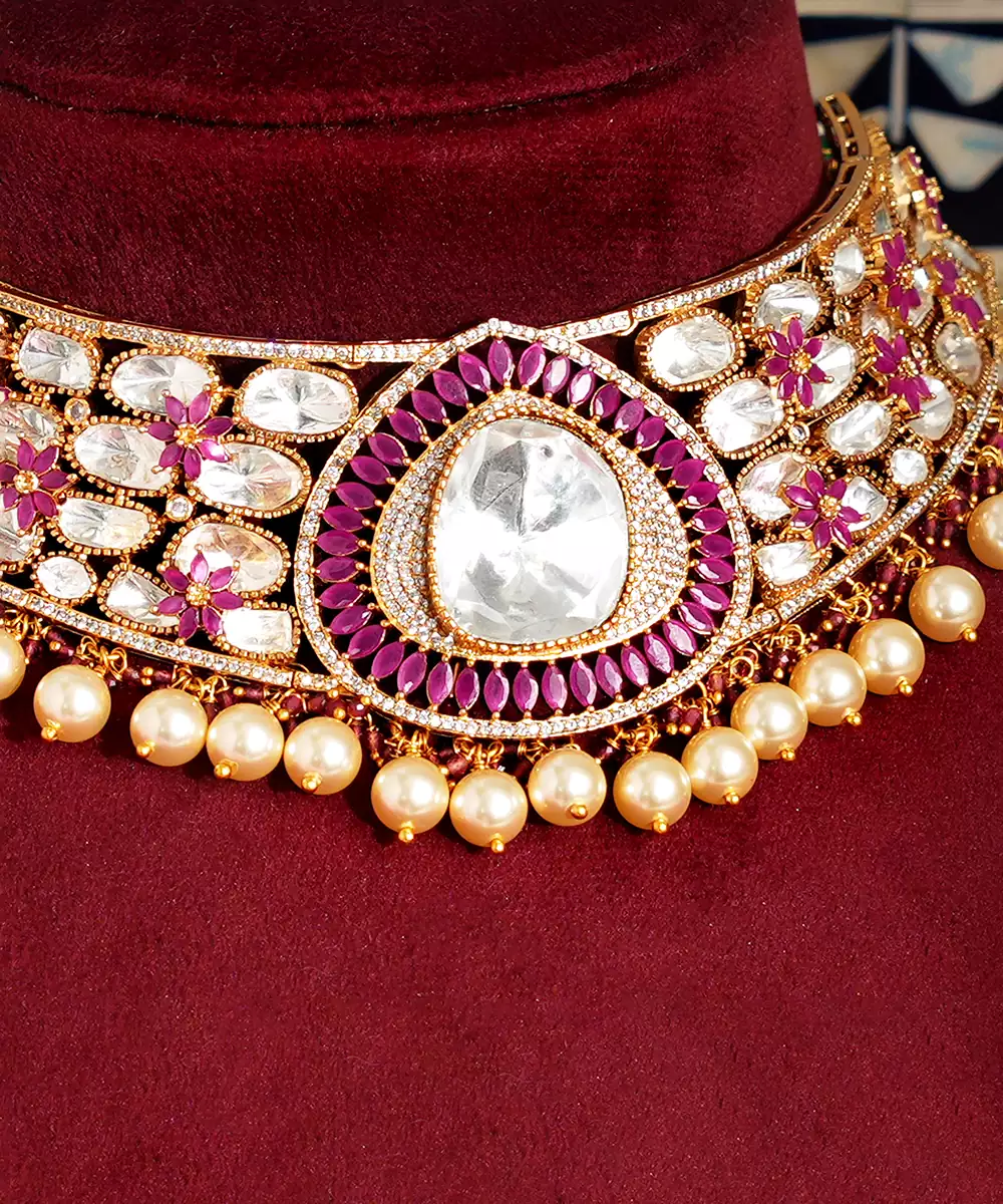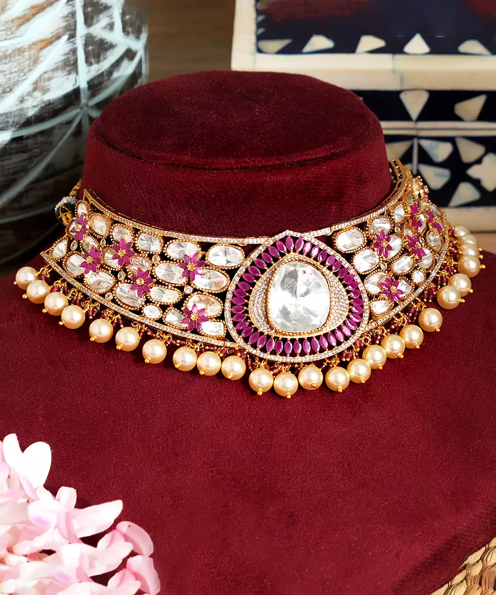 Add A Touch Of Contemporary Elegance With This Designer Flexible Choker Set, Featuring Pearl Drops In Ruby Settings With Exquisite Kundan Work And Matching Designer Earrings. Crafted For Comfort And Style, This Choker Adapts Perfectly To Your Neckline, Making It Ideal For Weddings, Festive Celebrations, And Special Occasions.