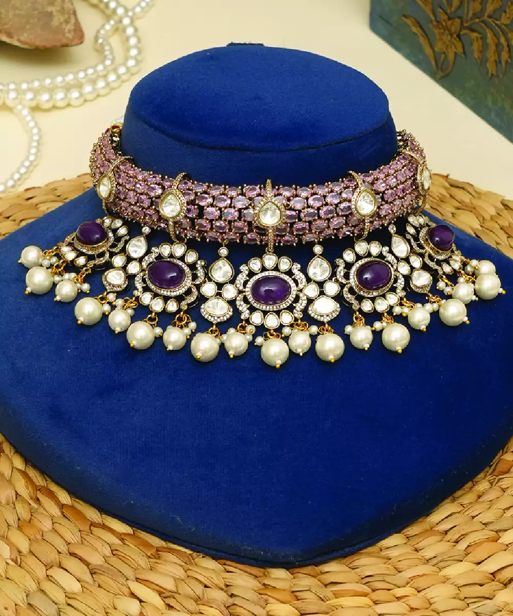 Crafted With Elegance, This Gold Plated Beaded Choker Set Features Stunning Purple Stones Combined With Delicate Beadwork. The Unique Design Offers A Contemporary Twist To Traditional Jewelry. Perfect For Festive And Evening Wear, It Enhances Your Outfit With A Graceful And Sophisticated Touch.