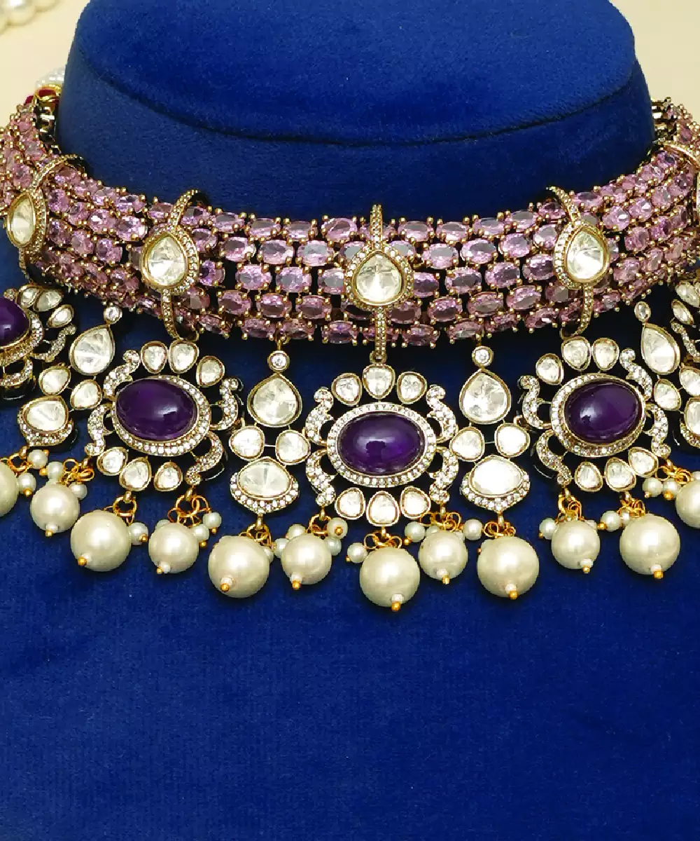 Gold Plated Purple Stones Beaded Choker Set