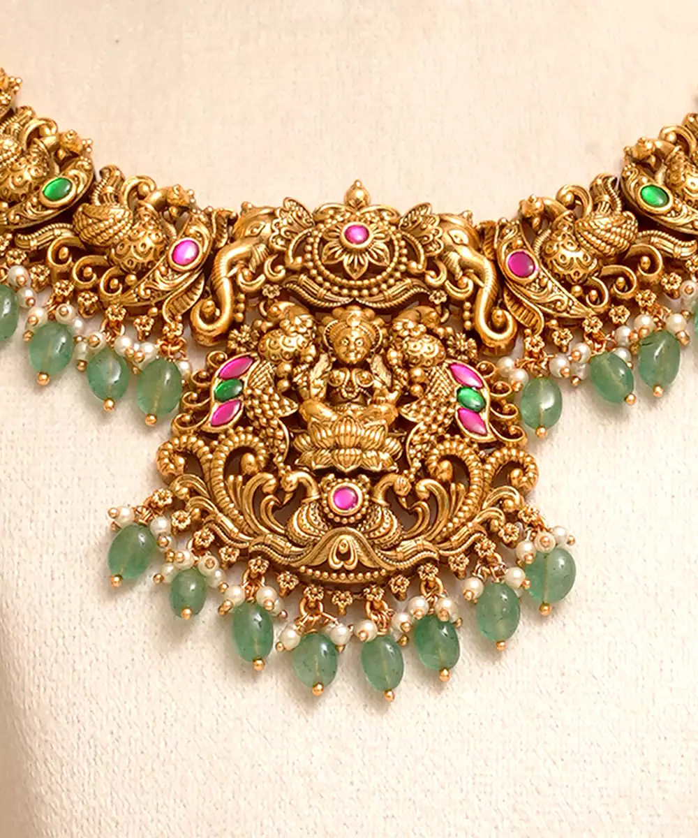 This Gold Plated Temple Necklace Set Showcases Traditional South Indian Artistry With Intricate Temple Motifs And A Radiant Gold Finish. Designed To Complement Silk Sarees And Bridal Attire, It Is Perfect For Weddings, Religious Ceremonies, And Festive Occasions, Adding Divine Charm And Royal Elegance To Your Look.