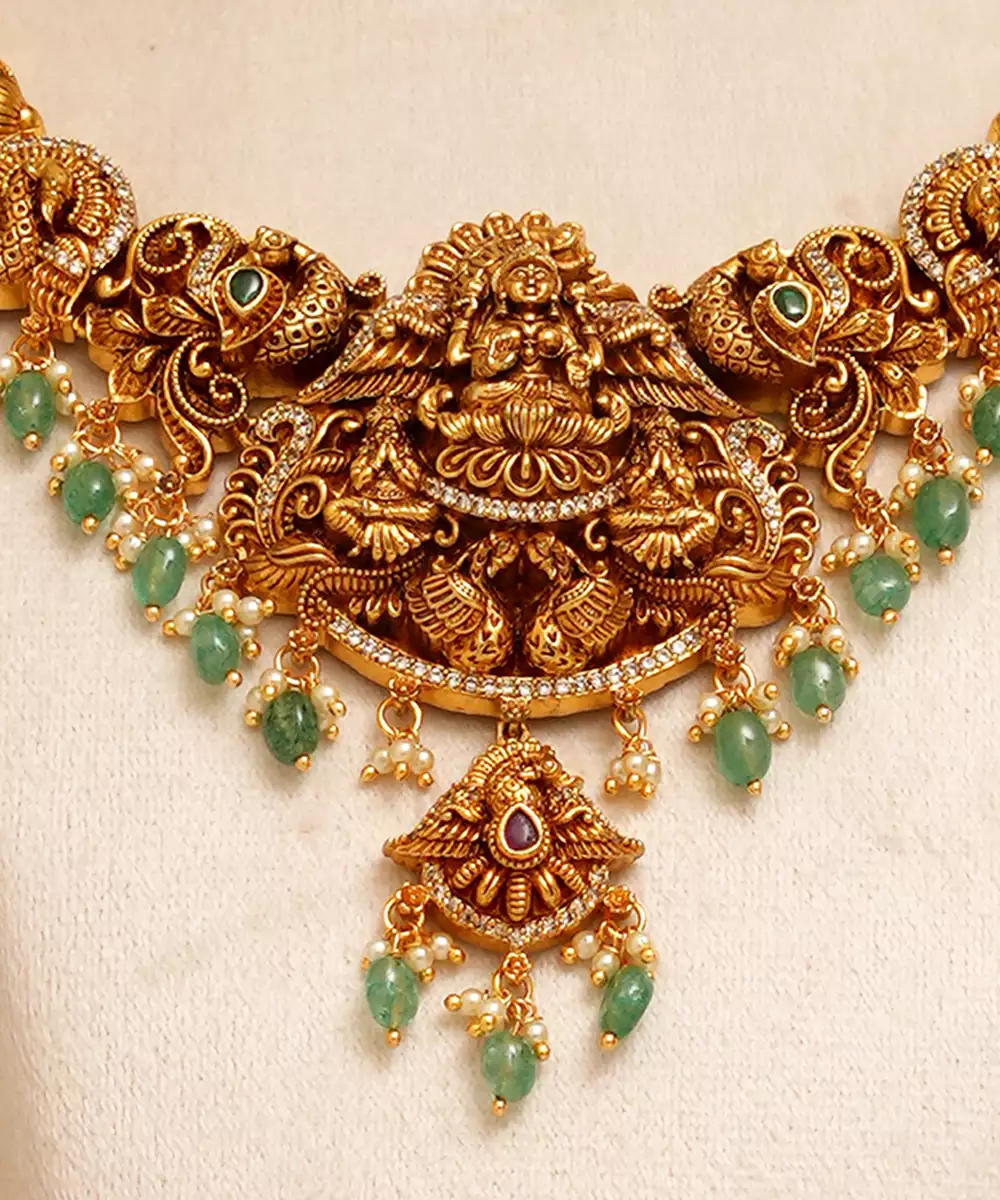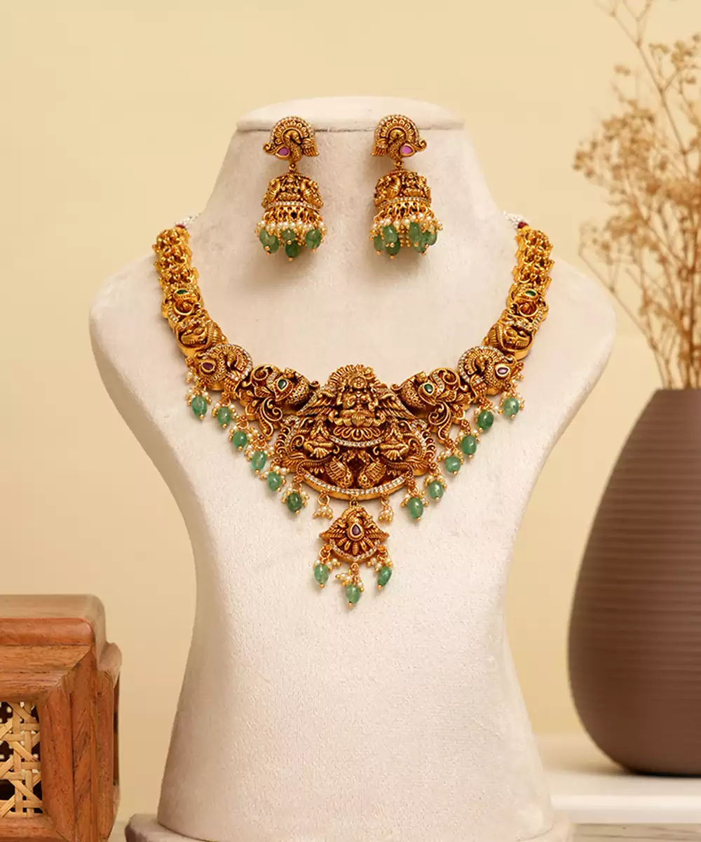 Inspired By Classic Temple Jewelry, This Gold Plated Temple Necklace Set Features Detailed Craftsmanship And A Rich Antique Finish. The Beautifully Designed Motifs Enhance Ethnic Outfits Effortlessly. Ideal For Weddings, Poojas, And Cultural Celebrations, This Set Brings Timeless Tradition And Graceful Sophistication To Your Jewelry Collection.