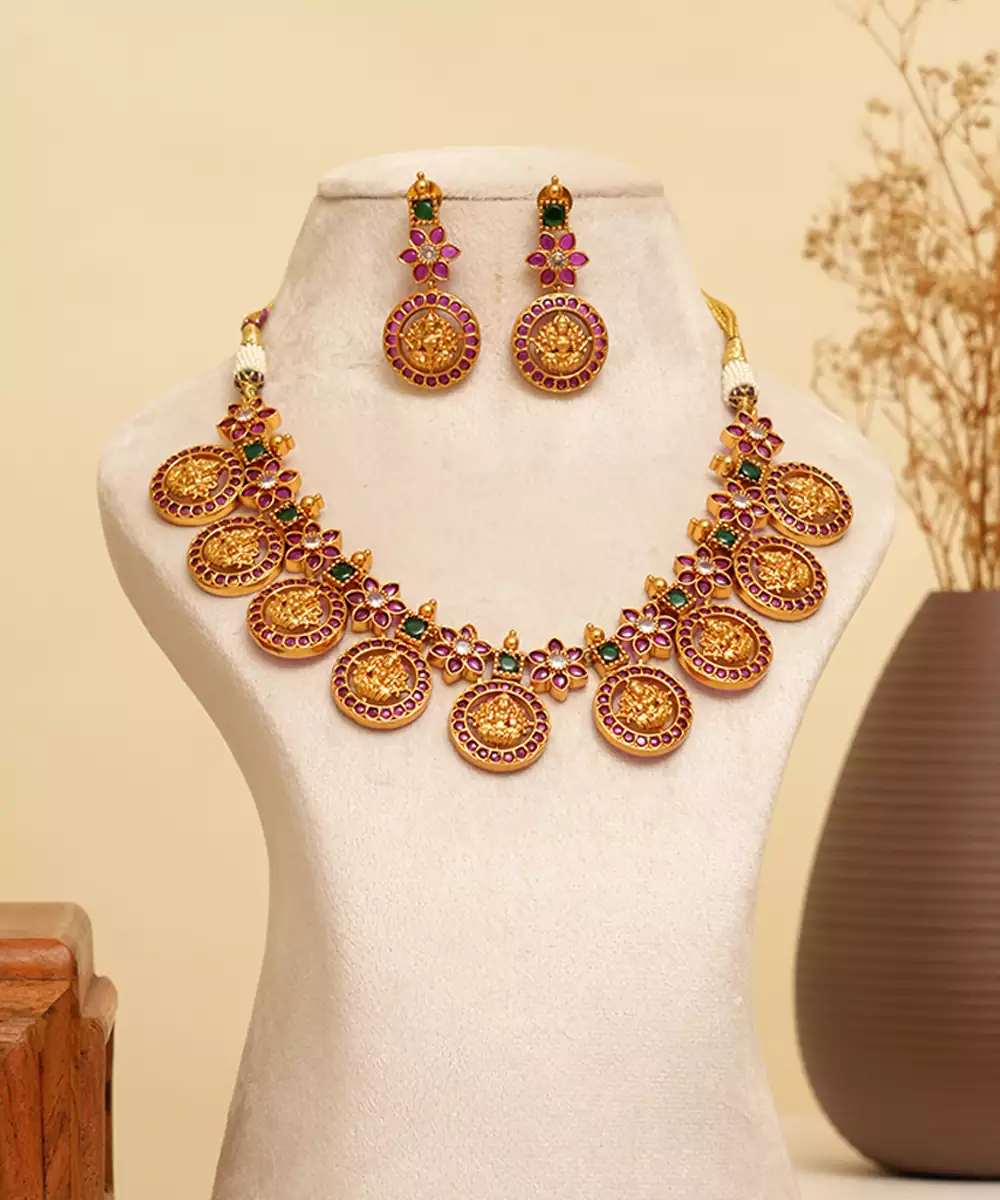 Adorn Yourself With This Gold Plated Temple Necklace Set, Designed With Traditional Temple Inspired Patterns And Fine Detailing. The Radiant Gold Plating Adds Luxurious Charm To Ethnic Attire. Perfect For Weddings, Festivals, And Religious Ceremonies, It Brings A Divine, Graceful Touch To Your Jewelry Collection.