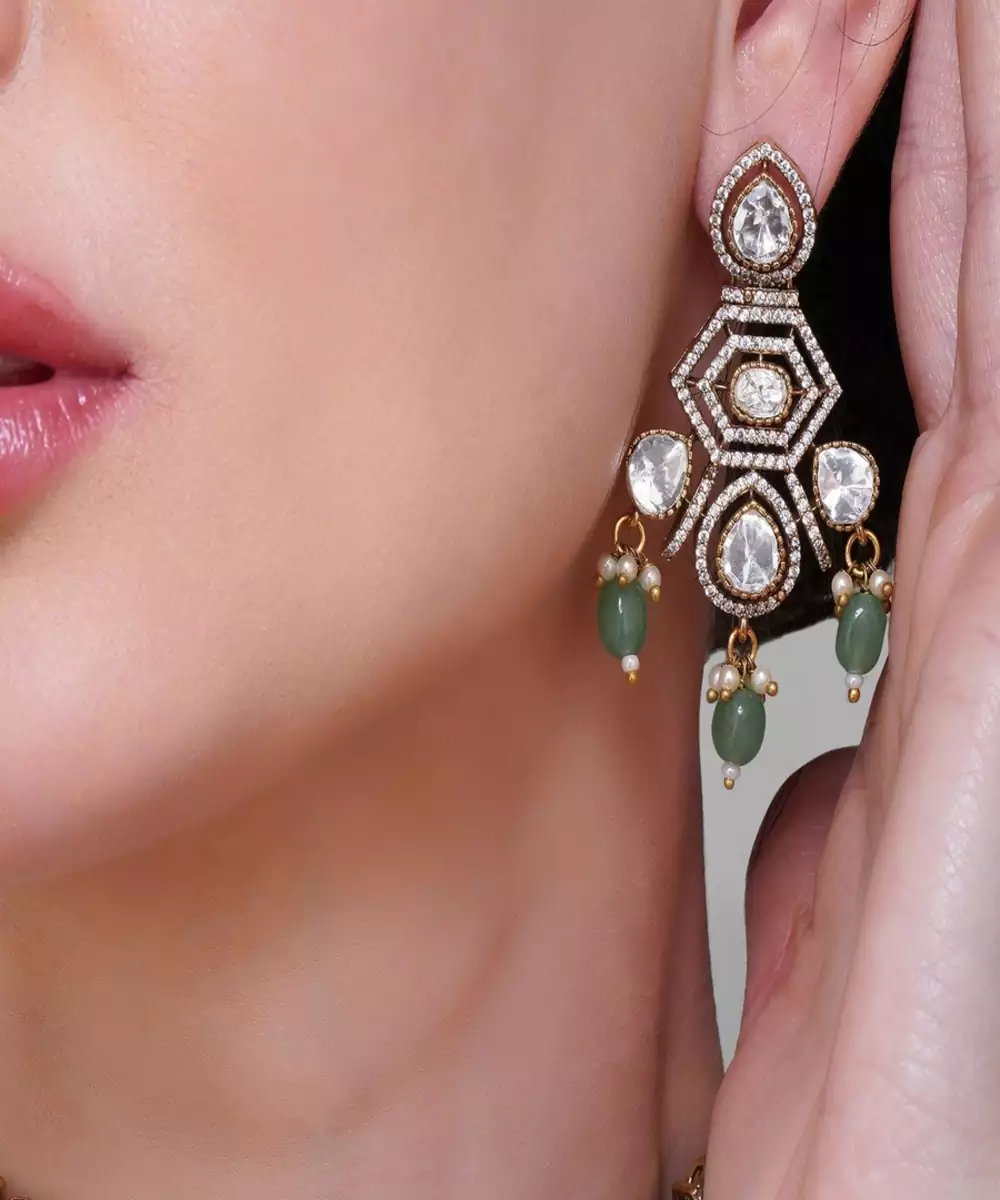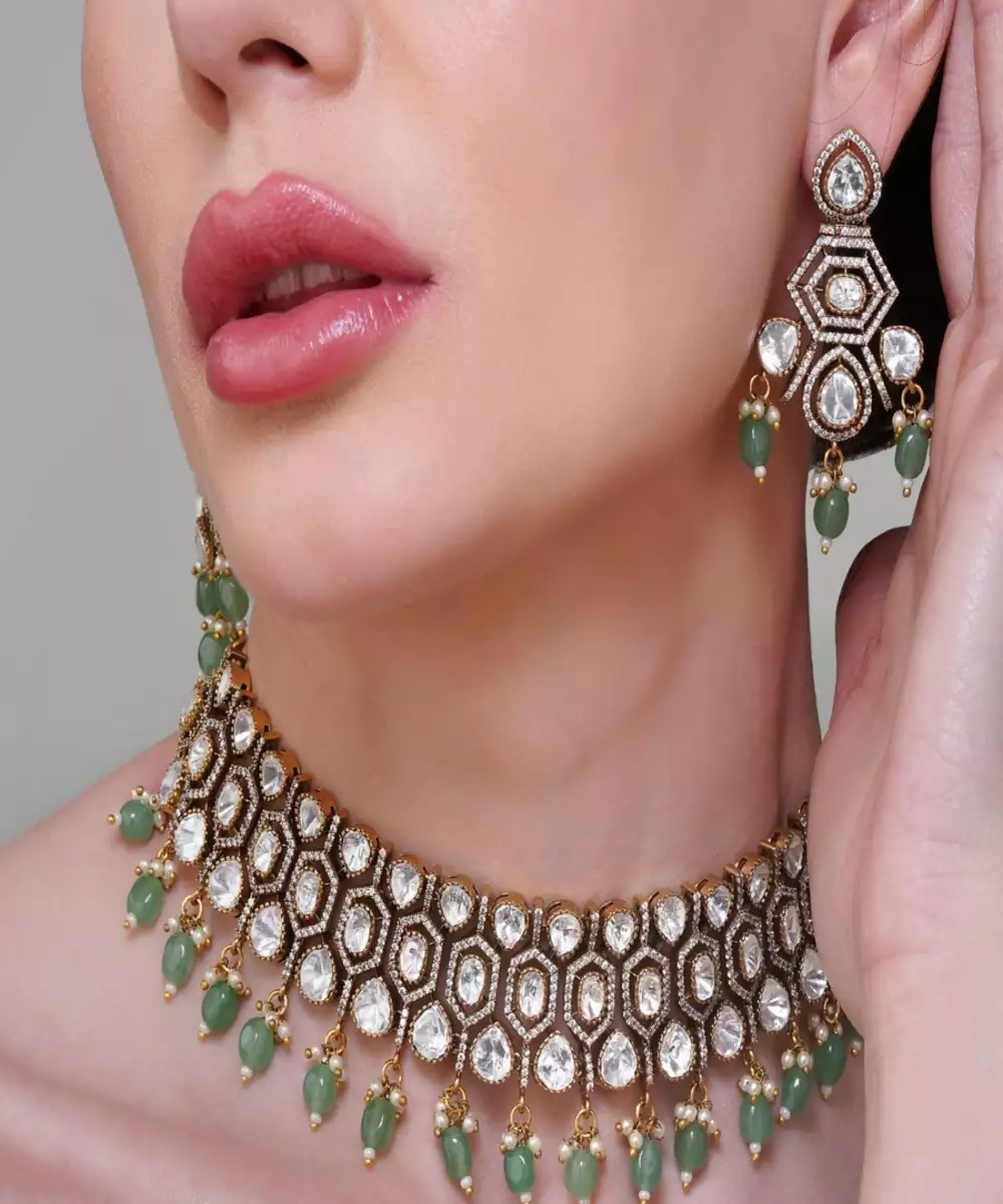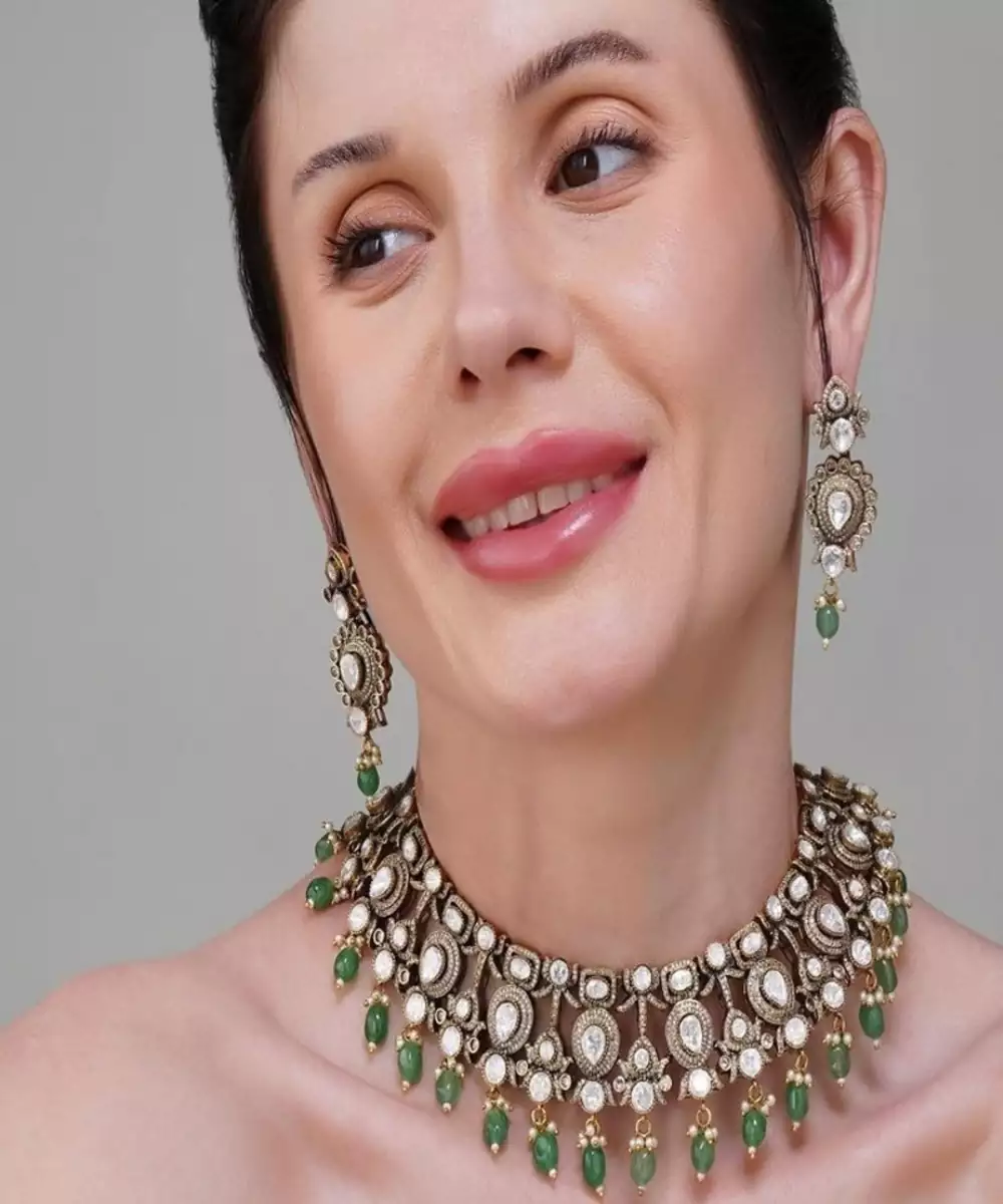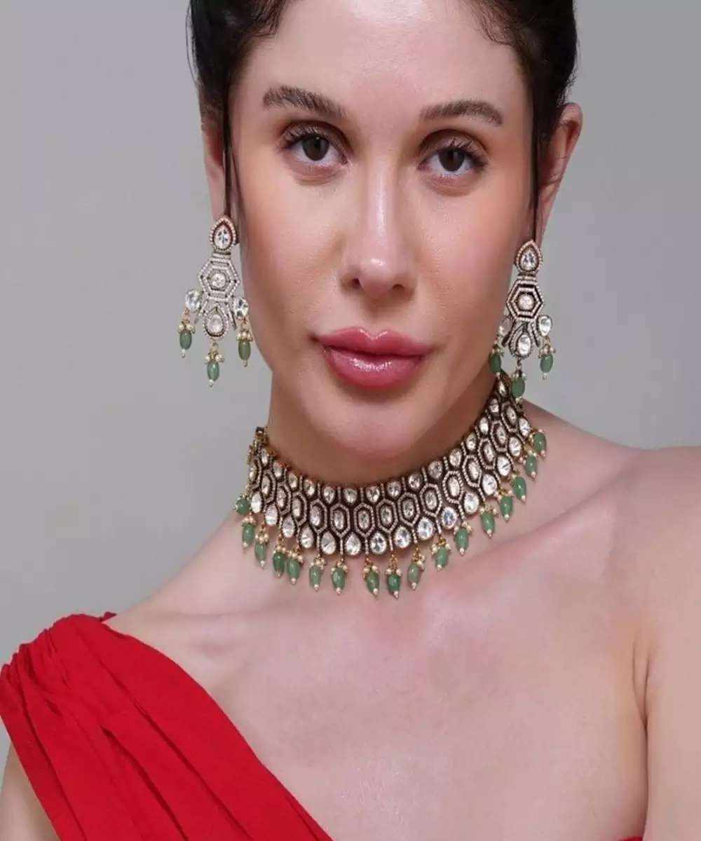 Our Kundan Choker Set Adorned With Green Pearls, A Perfect Blend Of Traditional Charm And Refined Luxury. Handcrafted With Precision, The Choker Features Dazzling Kundan Stones Set In A Regal Design, Gracefully Finished With Cascading Green Pearl Droplets That Add A Touch Of Sophistication And Richness.