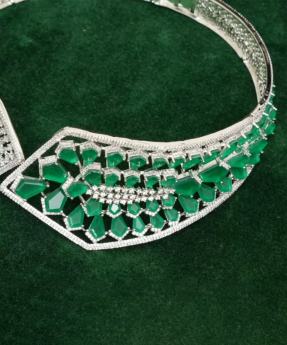 Zircon Green Stones Necklace Set Is A Regal And Elegant Accessory That Beautifully Showcases Traditional Craftsmanship. Adorned With Intricate Kundan Work And Vibrant Green Stones, It Enhances Any Ethnic Or Festive Ensemble. Perfect For Weddings, Celebrations, And Special Occasions, This Necklace Set Adds A Touch Of Sophistication And Timeless Charm.