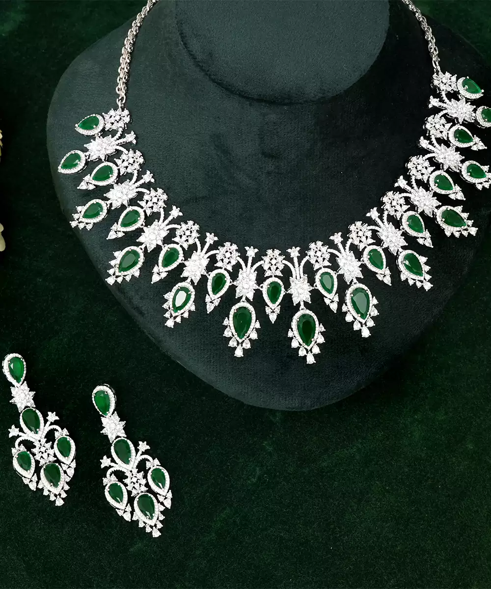 Zircon Green Stones Necklace Set Is A Regal And Elegant Accessory That Beautifully Showcases Traditional Craftsmanship. Adorned With Intricate Kundan Work And Vibrant Green Stones, It Enhances Any Ethnic Or Festive Ensemble. Perfect For Weddings, Celebrations, And Special Occasions, This Necklace Set Adds A Touch Of Sophistication And Timeless Charm.